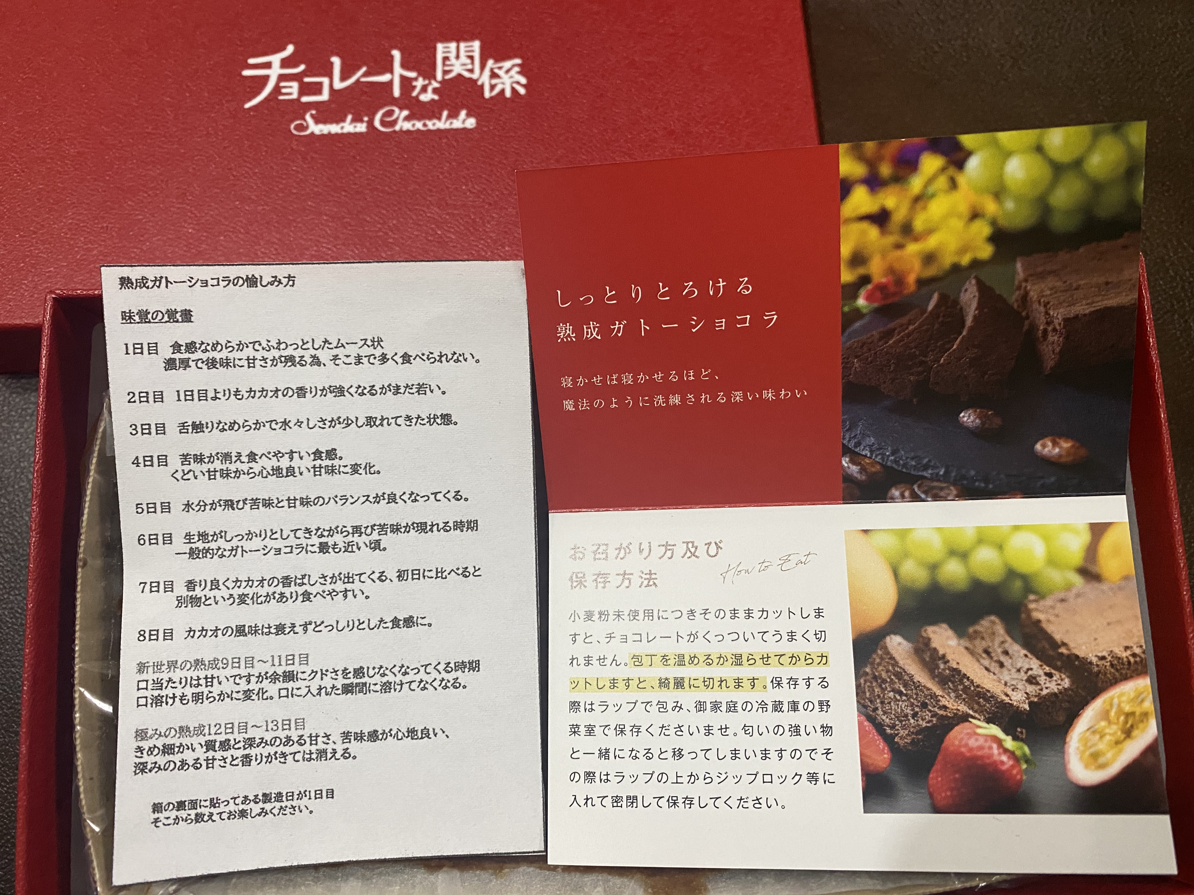 中身を空けていざ実食です。ガトーと言うより「テリーヌ」を想像させる口どけです。しかもしっかりと濃厚でチョコレートの香りと味が存分に引きたっています。これでグルテンフリーと言うのは驚きです。しかもグルテンフリーのような感じではなくしっかりとした濃厚なガトーショコラでした。ホームページも拝見したのですが店舗も綺麗で色々な熟成を楽しめるみたいです。熟成によってガトーショコラがどう変化して行くのかが凄い気になります。これは仙台に行ったら是非立ち寄りたいです。
