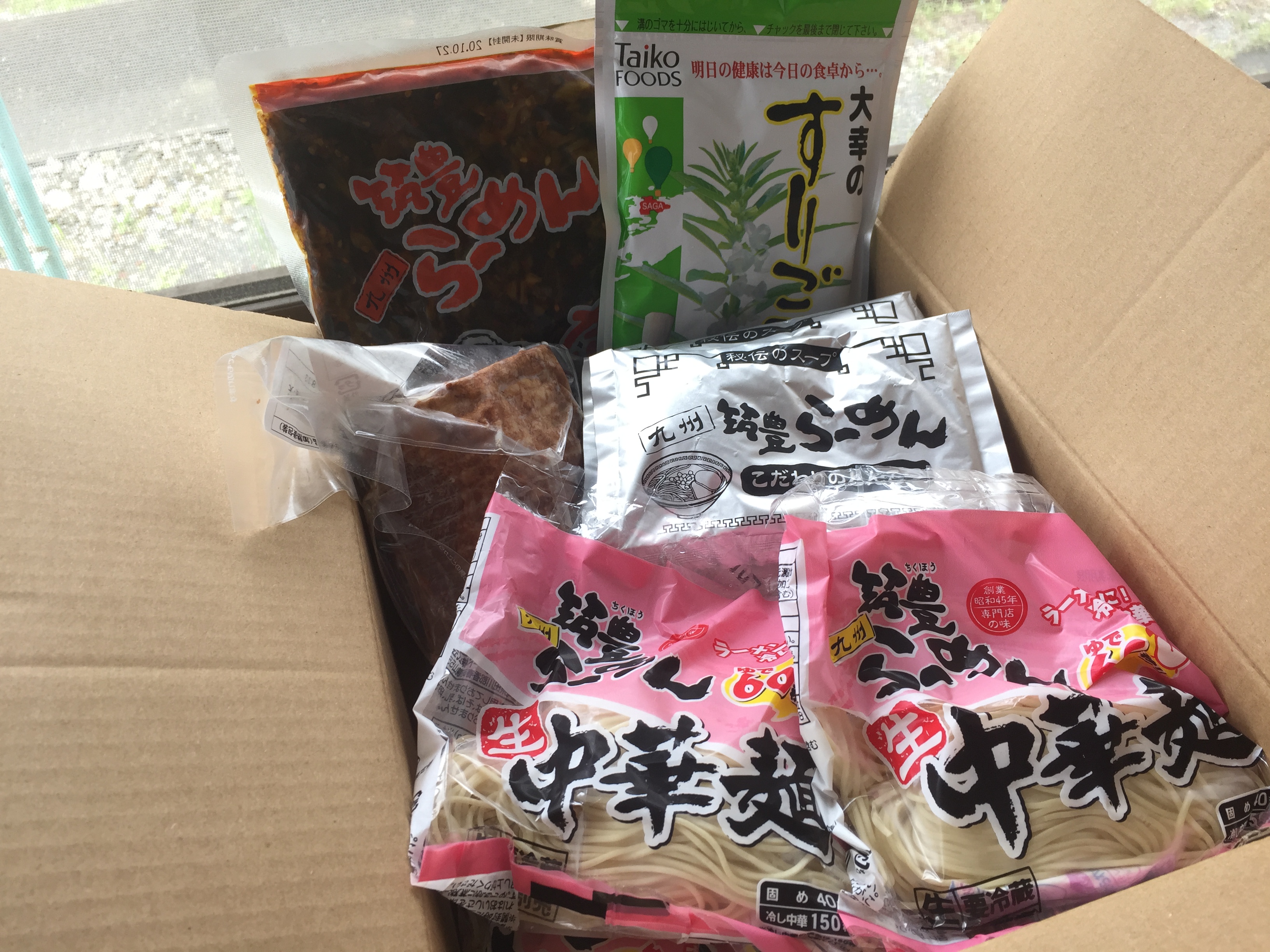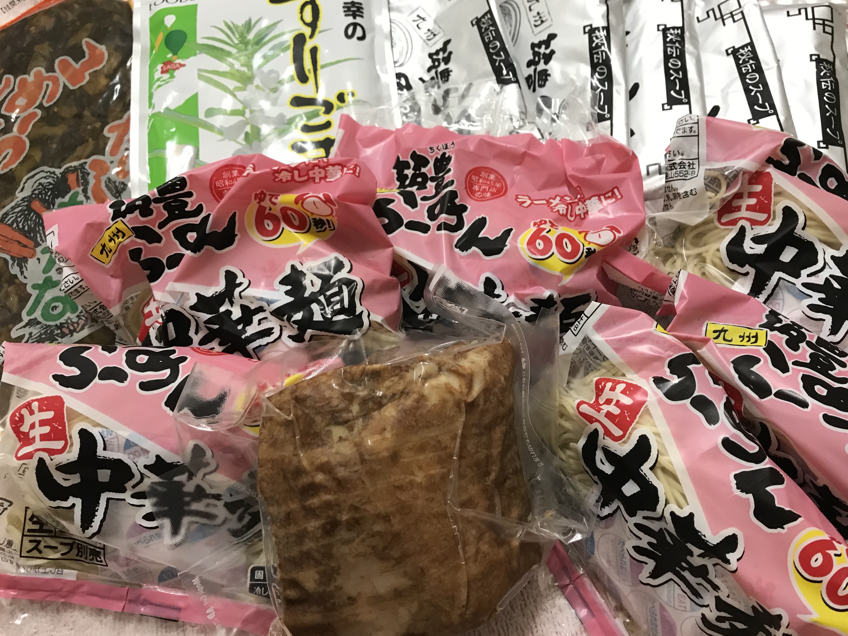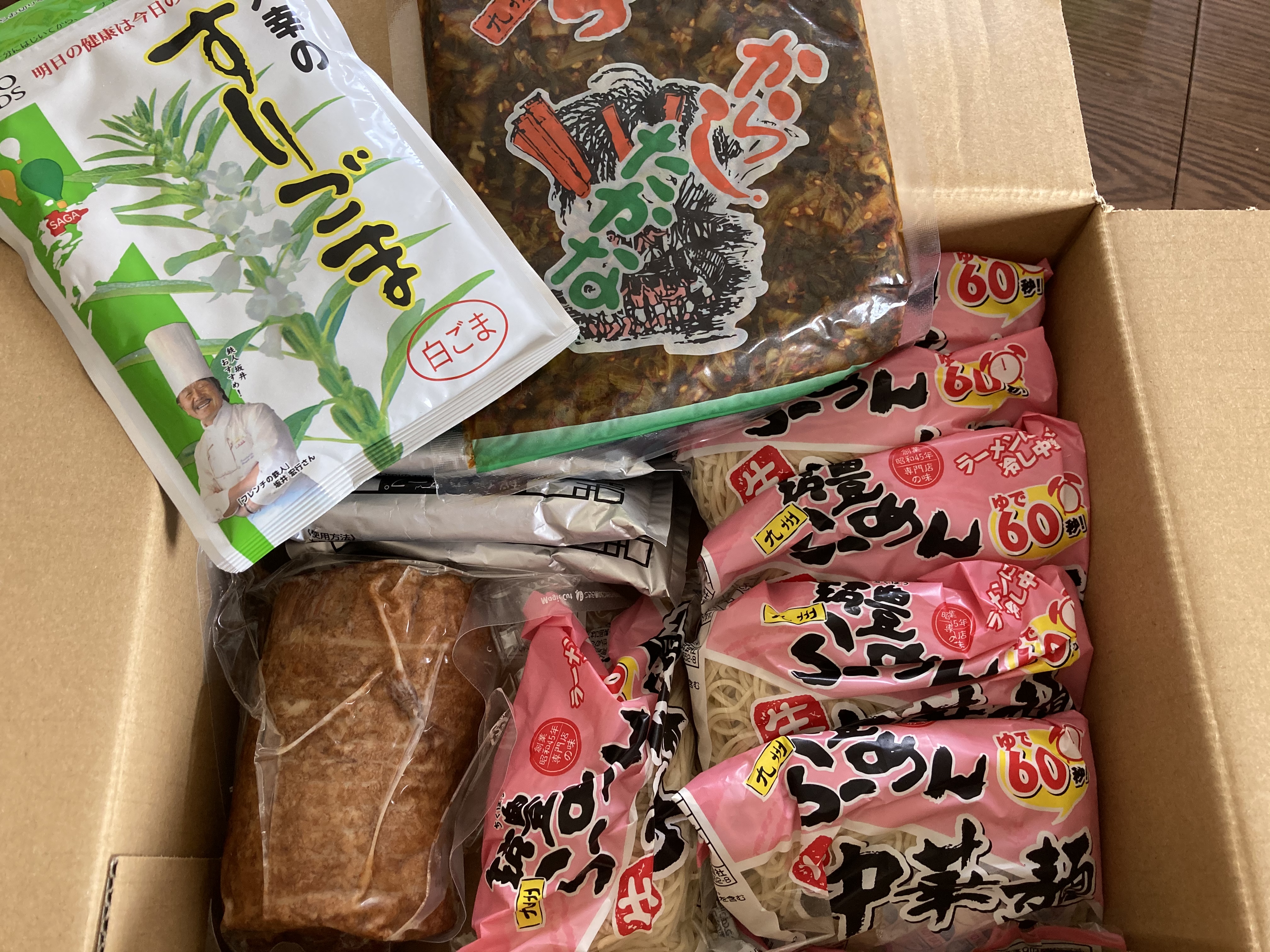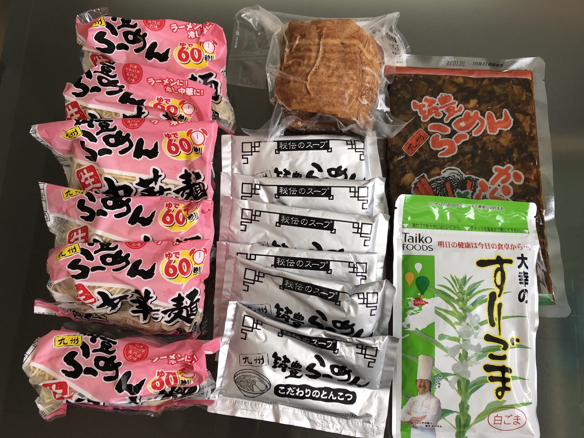 中には中華麺麺6食、とんこつスープ6食、焼豚1個(270g)、辛子高菜1袋(230g)、すりごま1(85g)に作り方のリーフが1枚入っています。