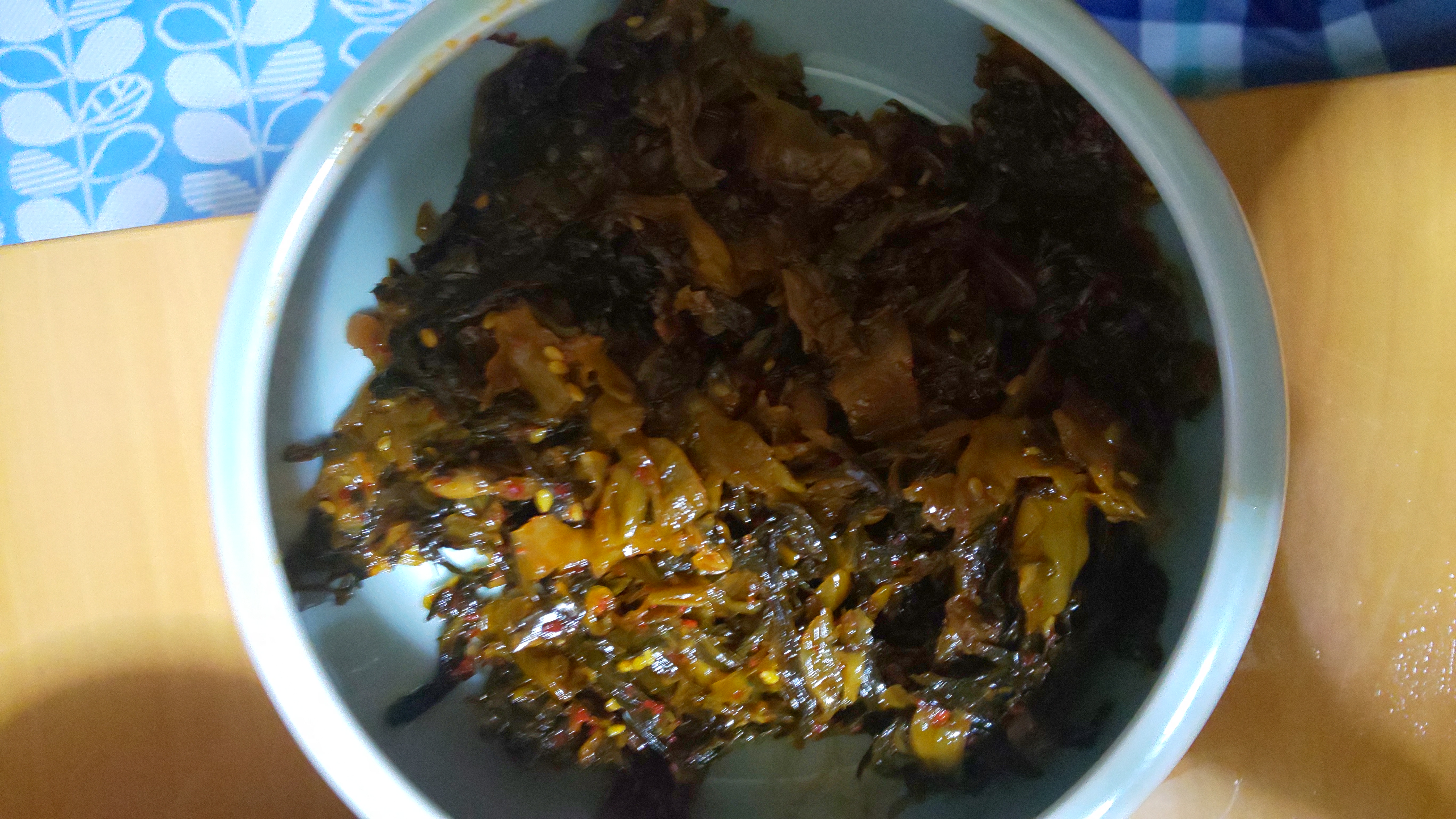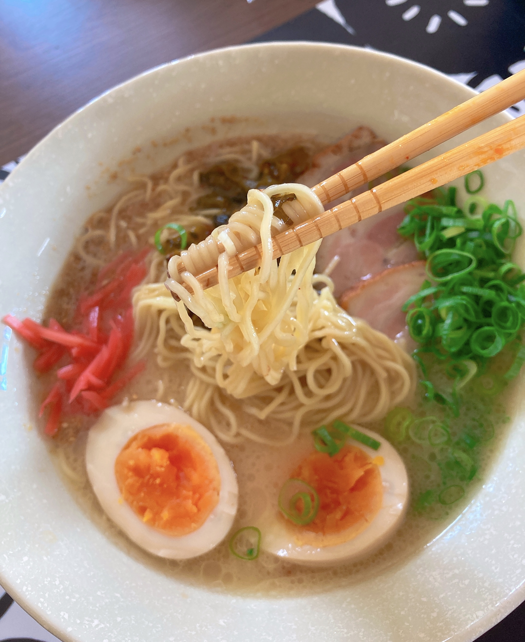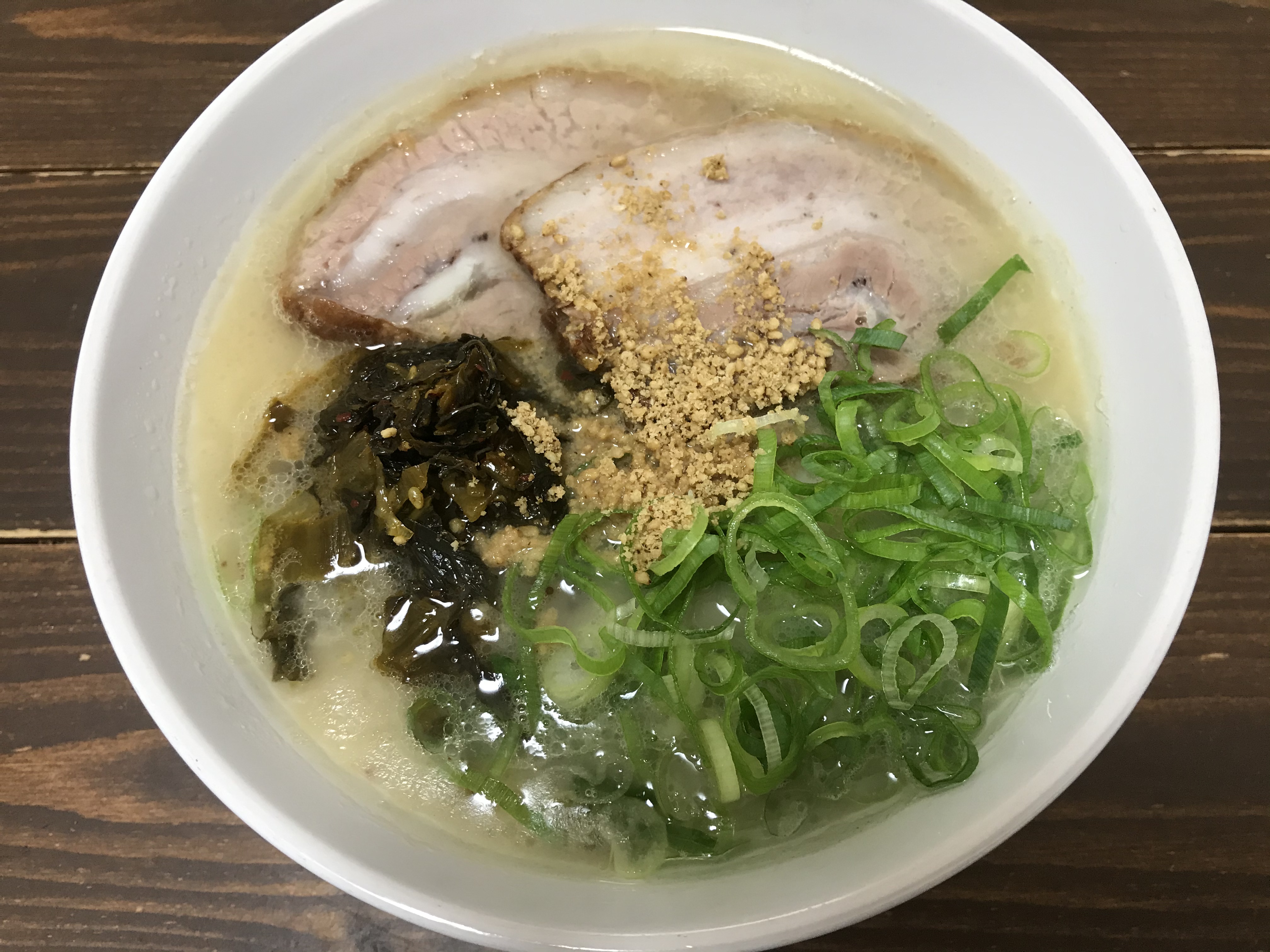 すりゴマも香ばしくて香りも味もおいしさを引き立ててくれますし、辛めの味付けの辛子高菜がスープでマイルドになり麺にもスープにも合います。