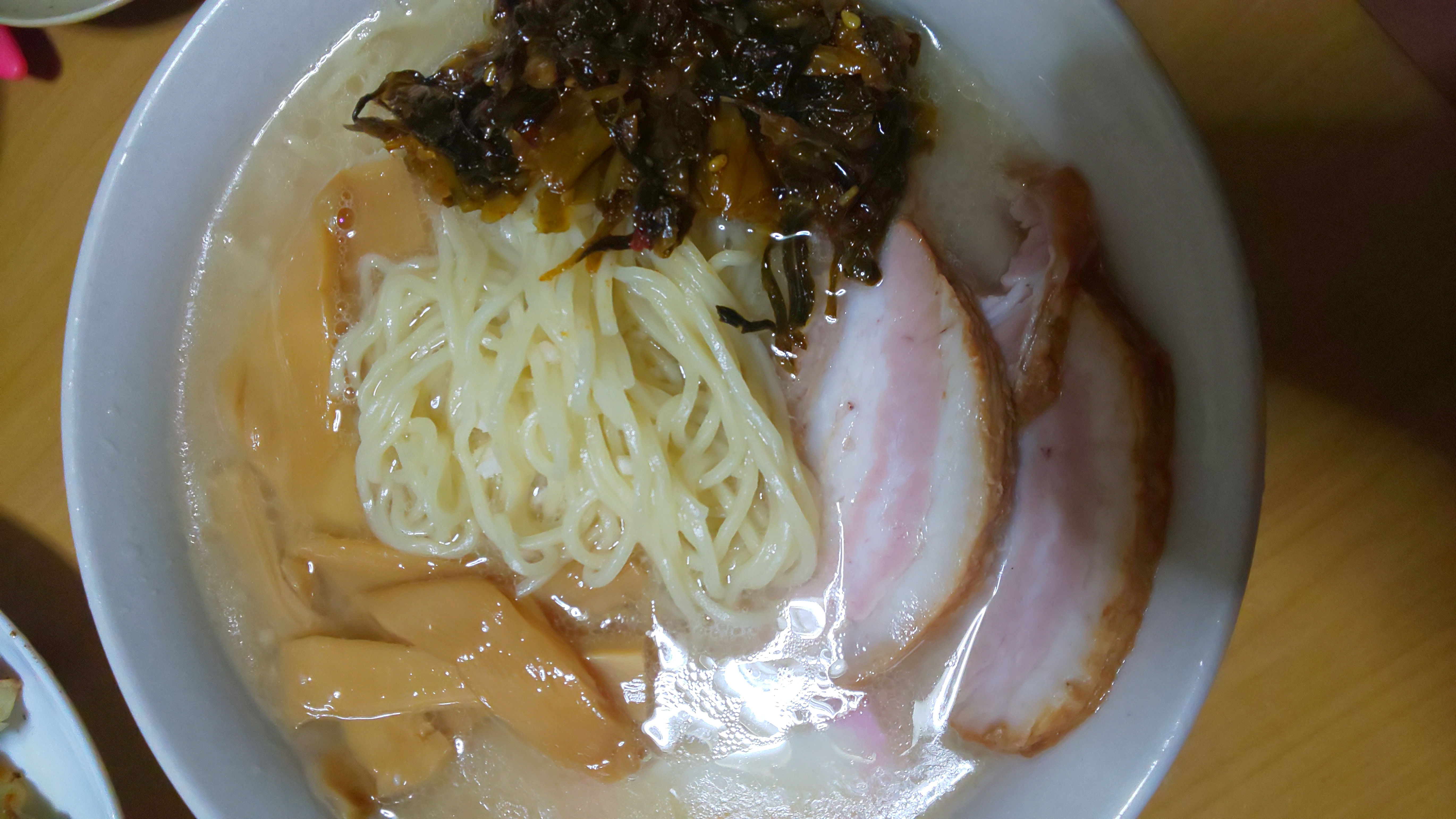 チャーシューは分厚く3枚、高菜もゴマも惜しみなくたっぷり入れました。