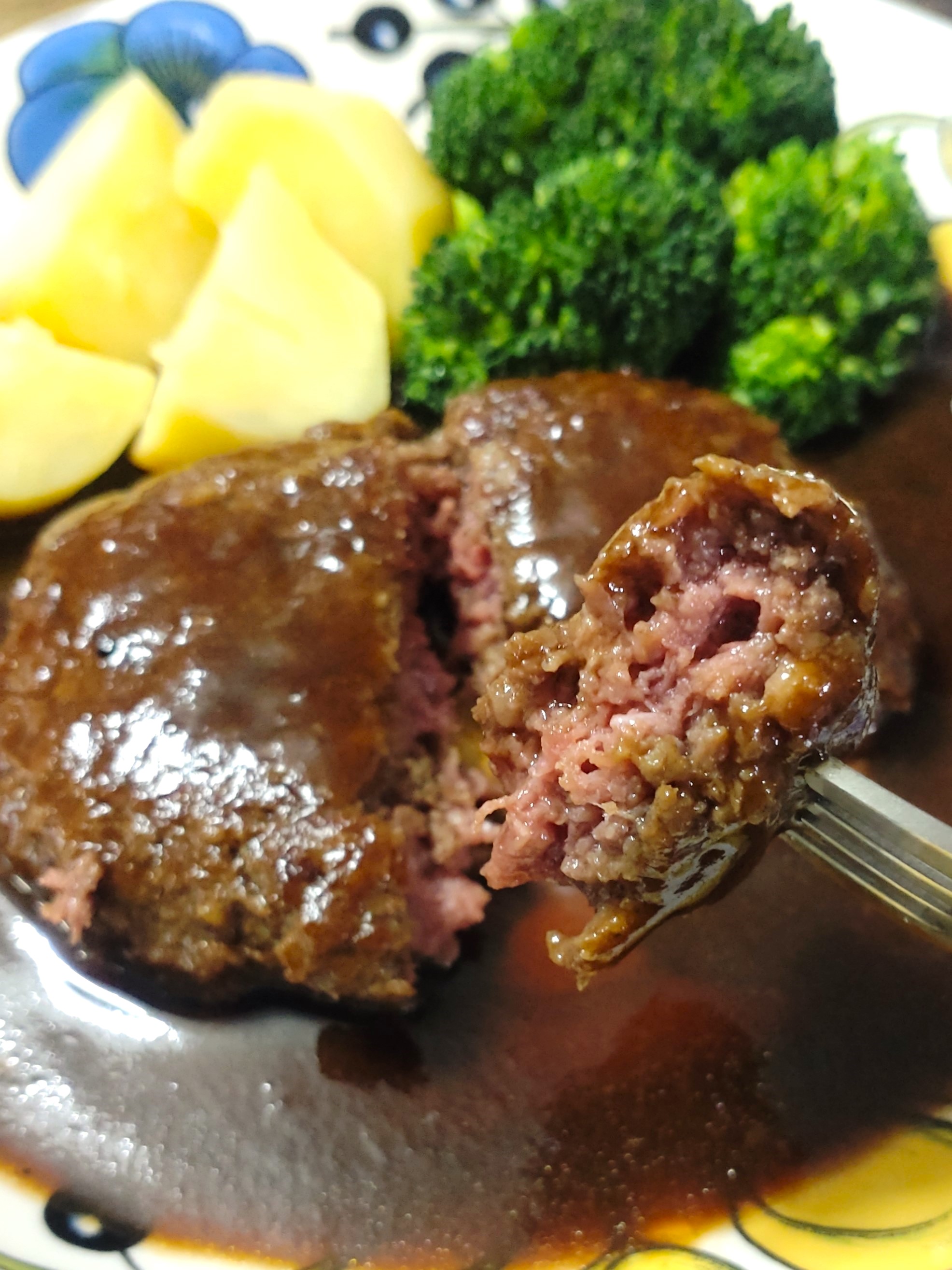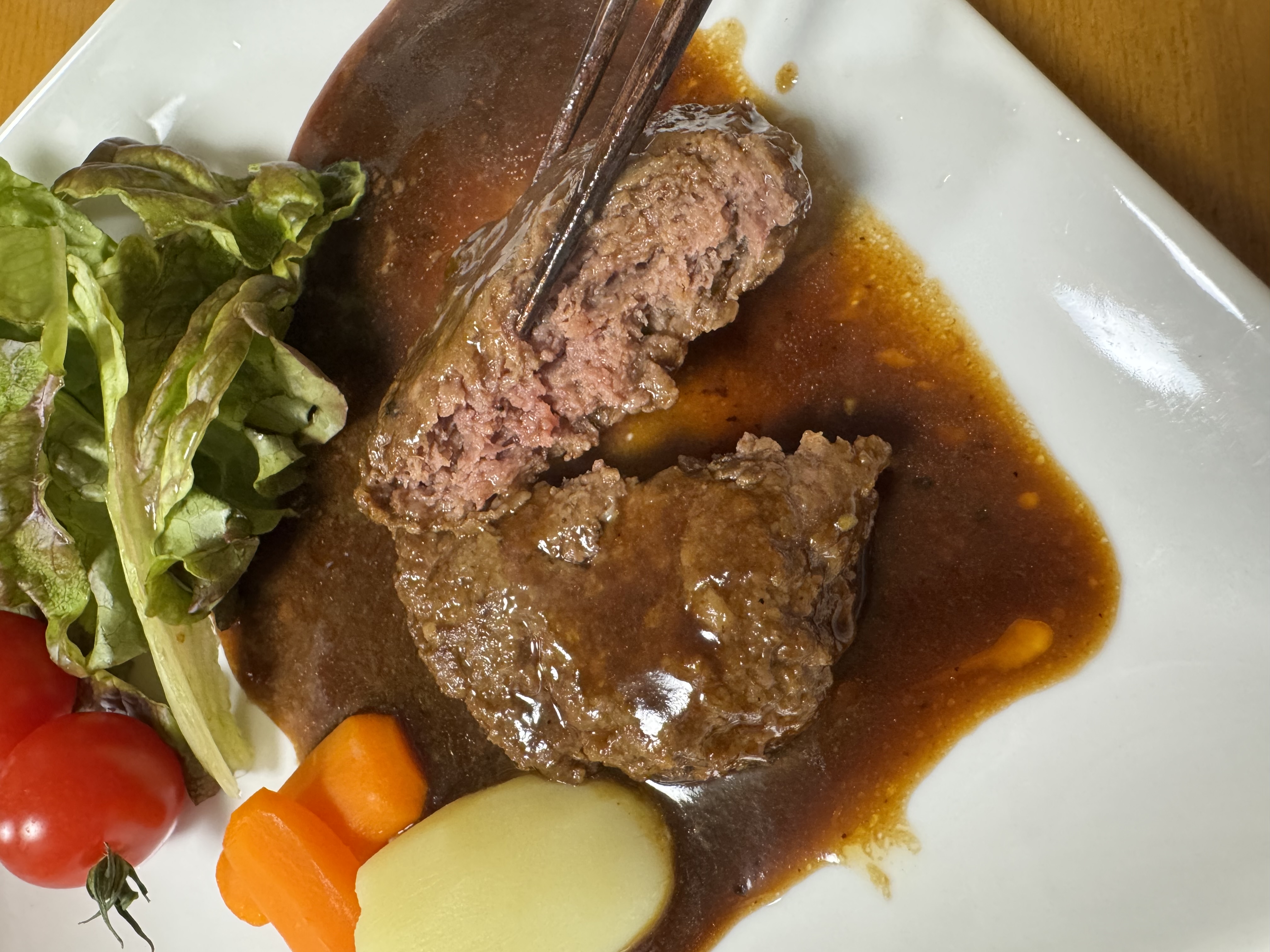 ハンバーグは、お箸で簡単に割ることのできる柔らかさです。