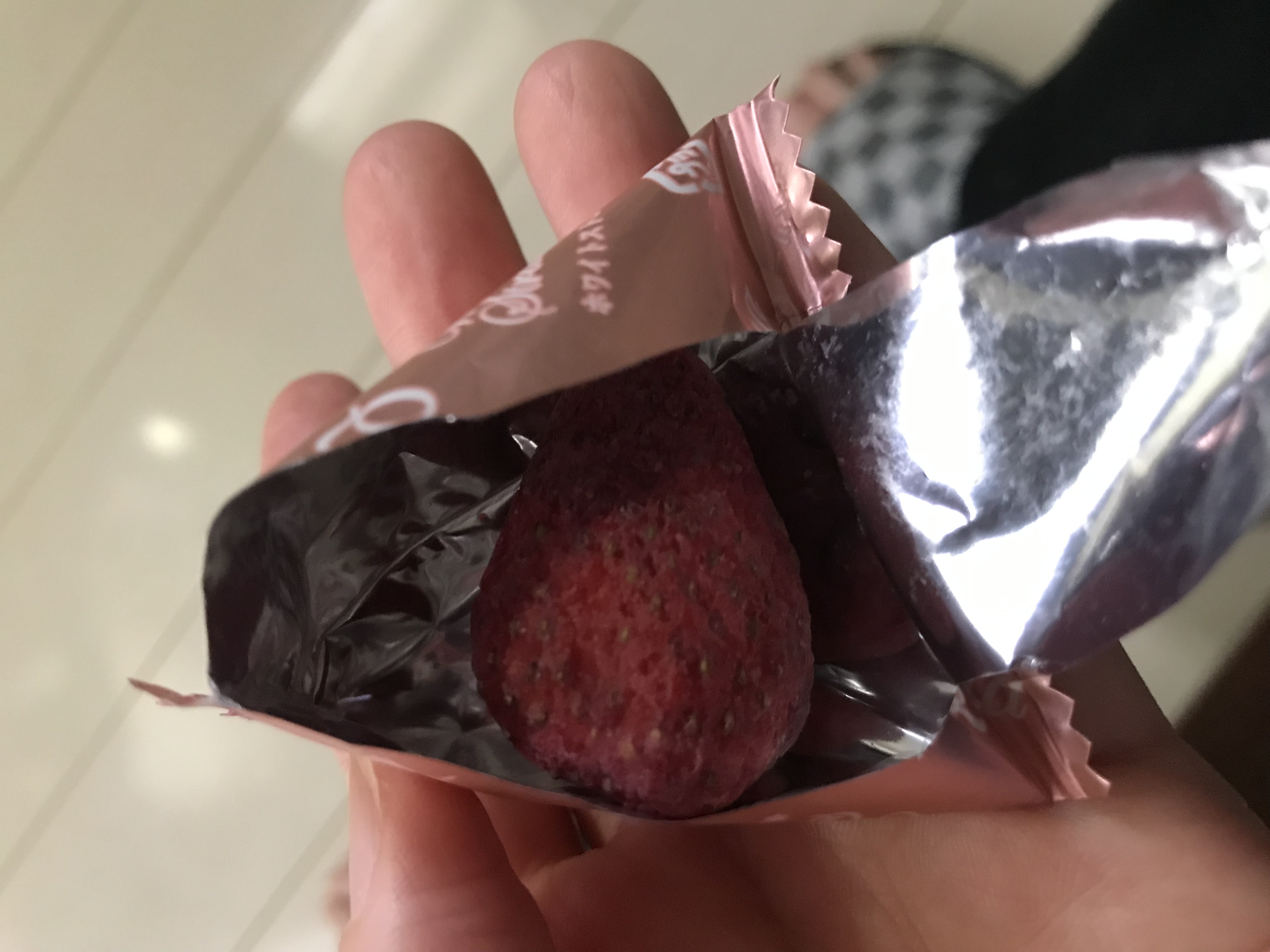 フリーズドライの苺にチョコを染み込ませたのが世界初との事で一番楽しみにしていました。4角形の小包装にコロンと入った苺ちゃん。噛むやいなやホワイトチョコの香りと苺の香りがちょうどよく混ざり合い絶妙な逸品。予想を裏切らない味わいでした。