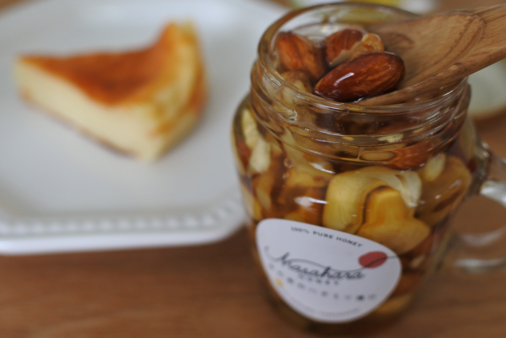 とっても深いコクです。はちみつ漬けのナッツやアーモンドをトーストにのせて、たっぷりのはちみつとパクリ。これもやっぱりおいしい!