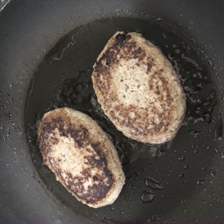 さらに、このハンバーグは焼き割れを防ぐ為に「手ごね」にもこだわり、一つ一つが人の手(しっかり衛生的にビニール手袋を装着)で丸められているとの事。早速解凍し、フライパンで焼いてみると、とても柔らかく、裏表をひっくり返す際は崩れないようにと細心の注意を払いました。