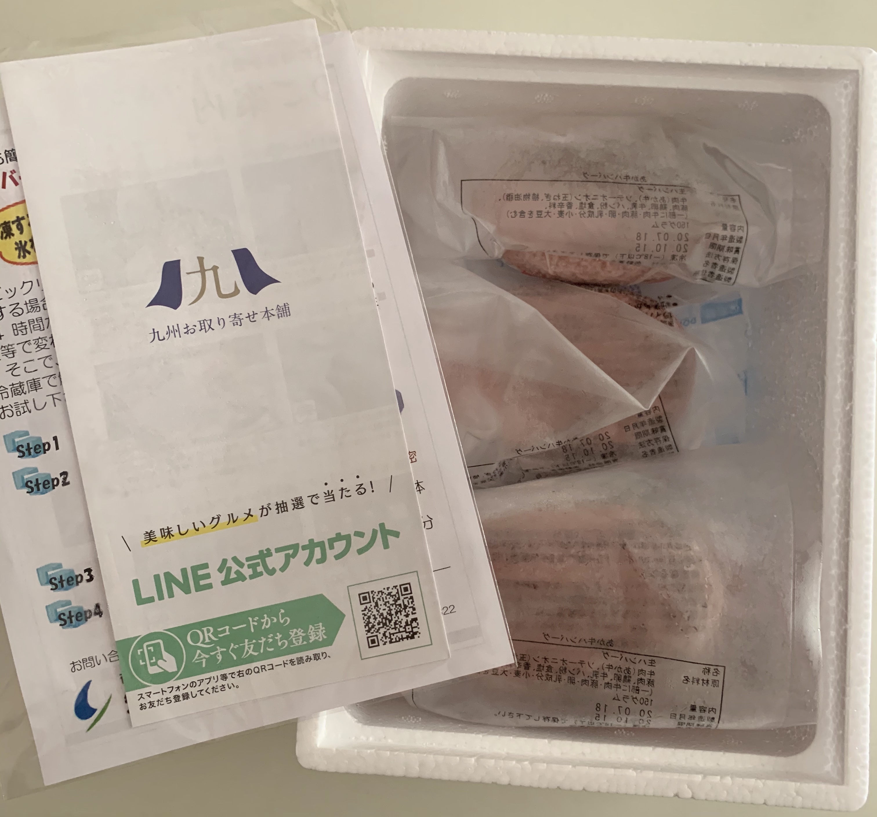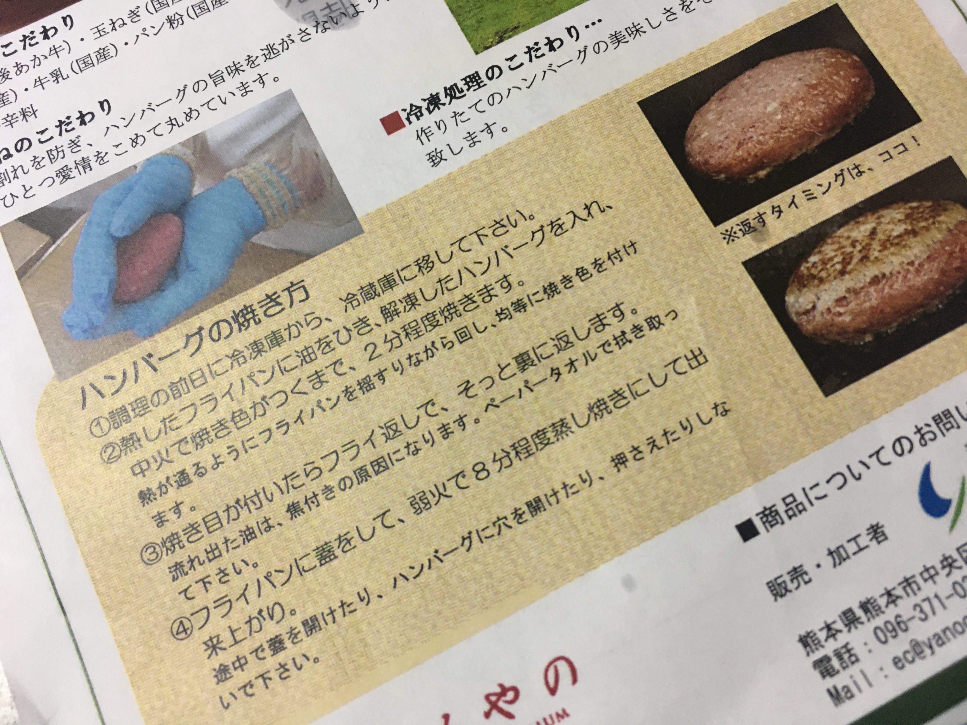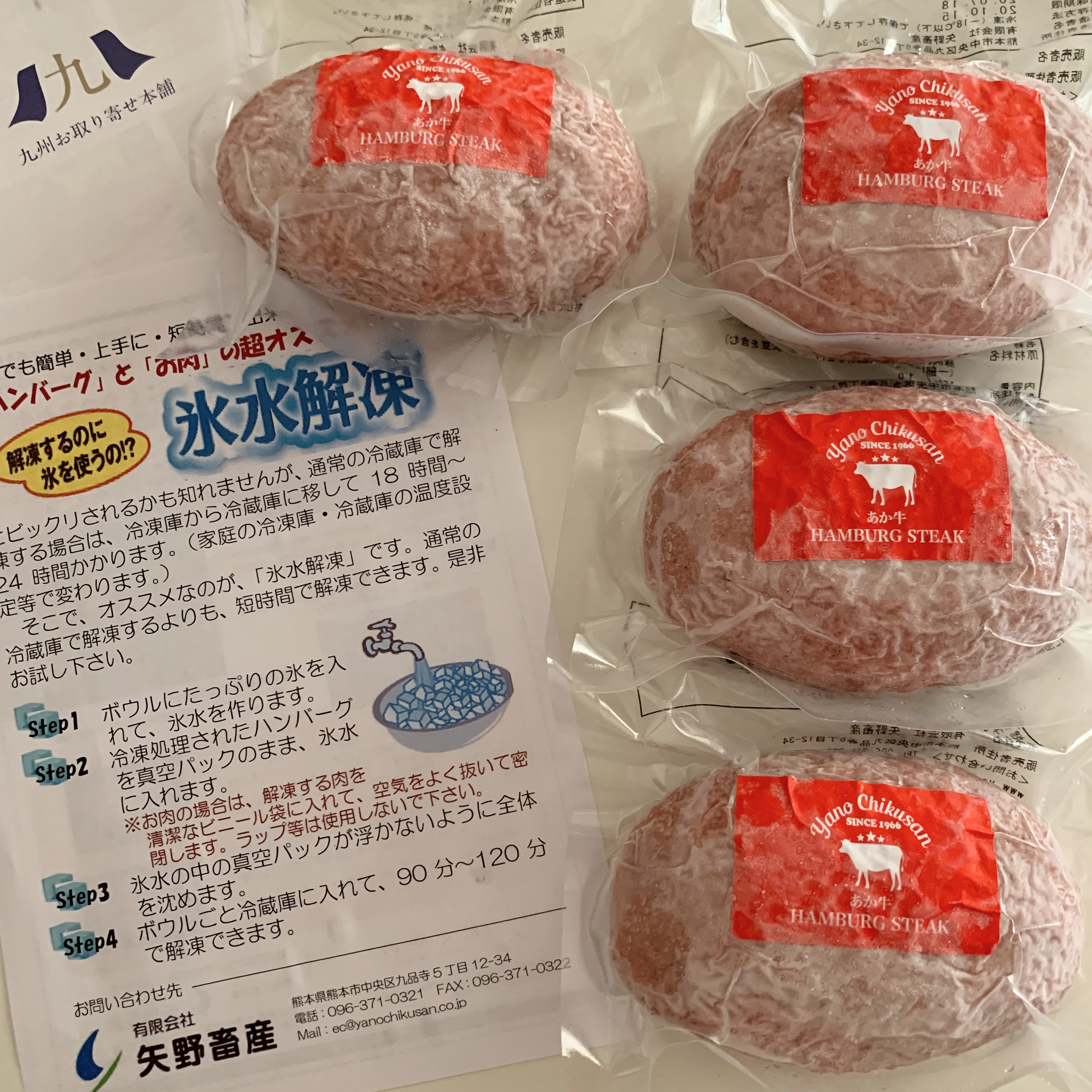 大自然の中で放牧され育った「あか牛」は、「無駄な脂肪分が少なく、まろやかな赤身がとても美味しいのが特徴」との事。そしてハンバーグの原材料を見てみると、「牛肉(肥後あか牛)、ソテーオニオン(国産玉ねぎ)、豚肉(国産)、鶏卵(国産)、牛乳(国産)、パン粉(国産小麦粉)、食塩(国産)、香辛料」と、一切の添加物が使用されておらず、まるで家庭で作るハンバーグのようにシンプル!お肉の品質だけでなく、使用している材料の一つ一つも厳選されているとの事で、きちんと素材へのこだわりが感じられます。日頃、子供達や家族が口にする食品の添加物など、食の安全を気にかけている私にとって、これは非常に好感度が高いです。