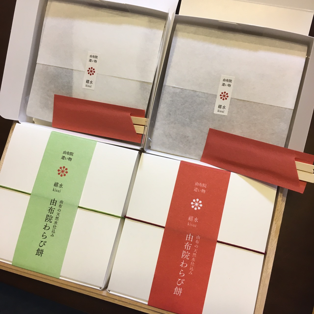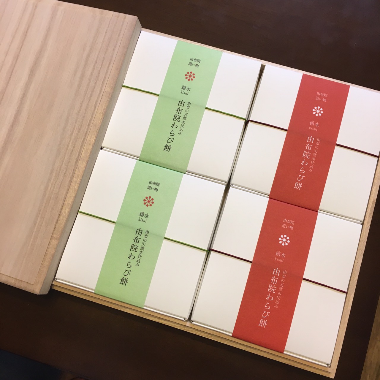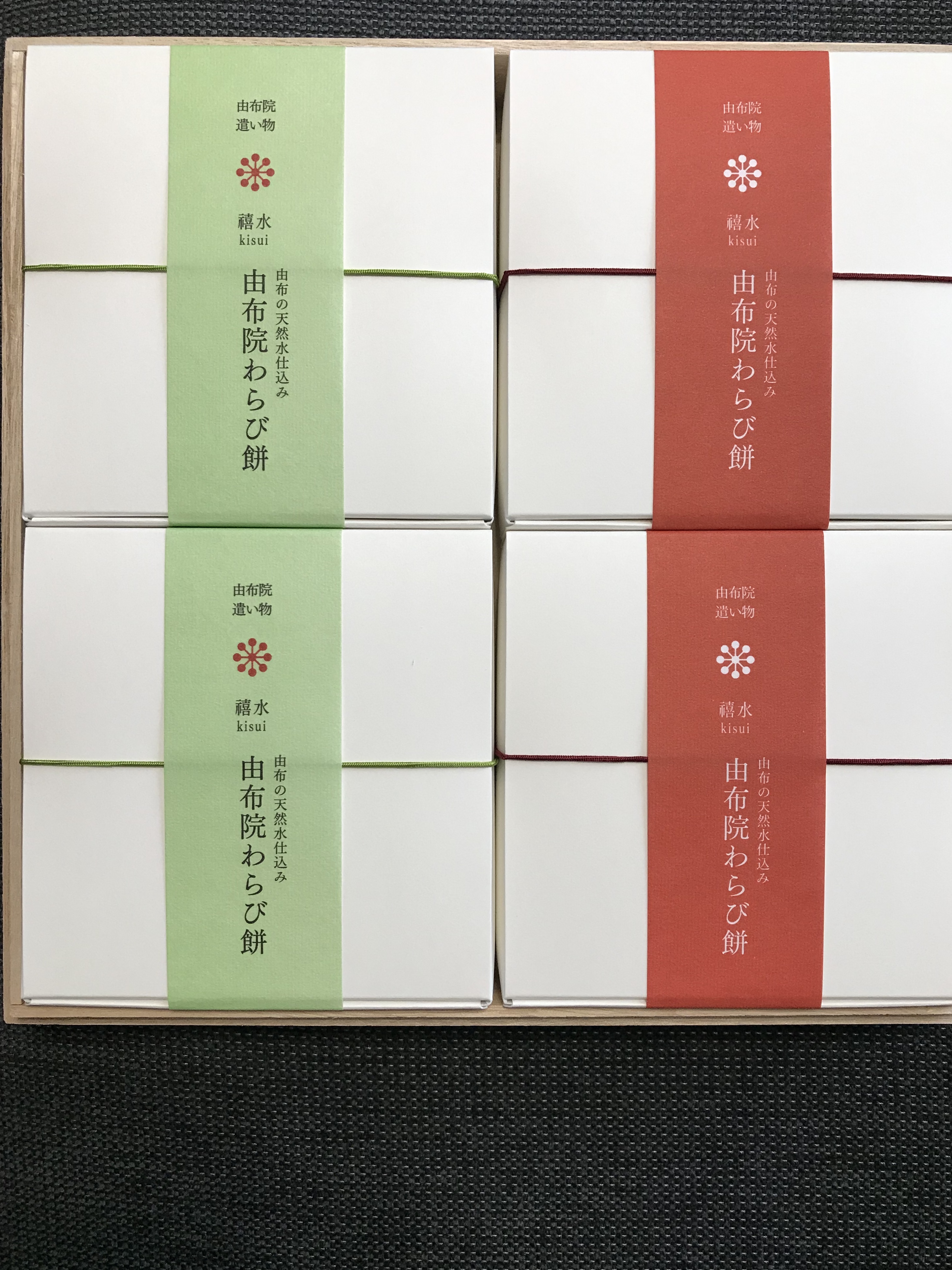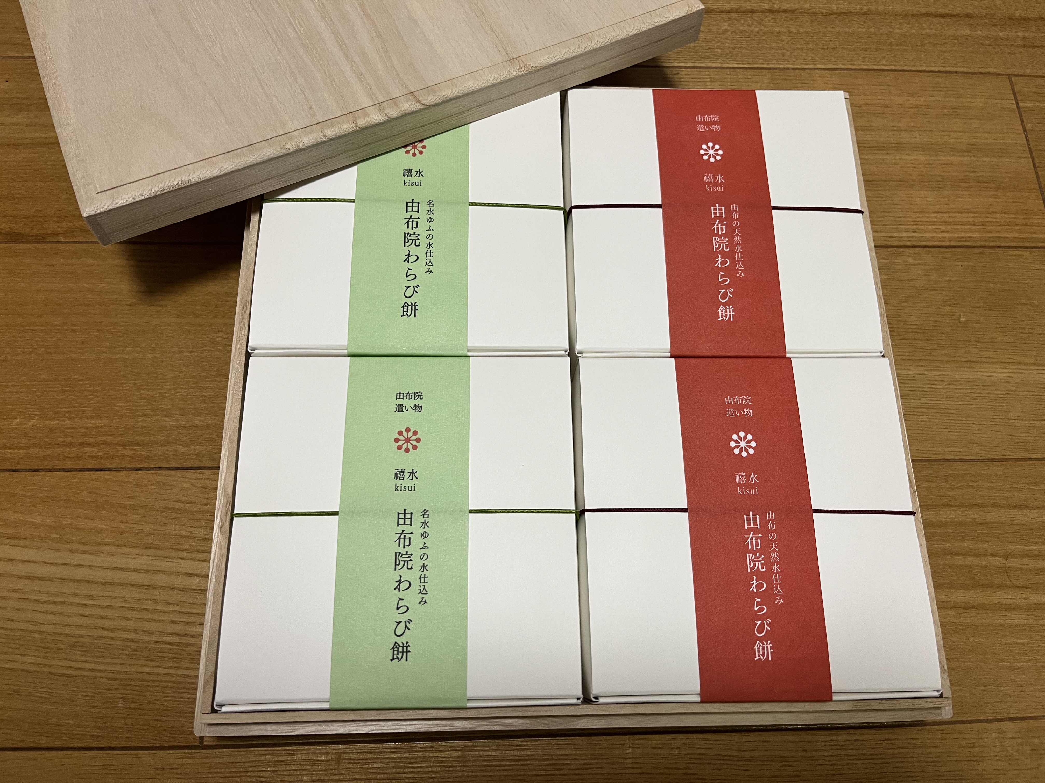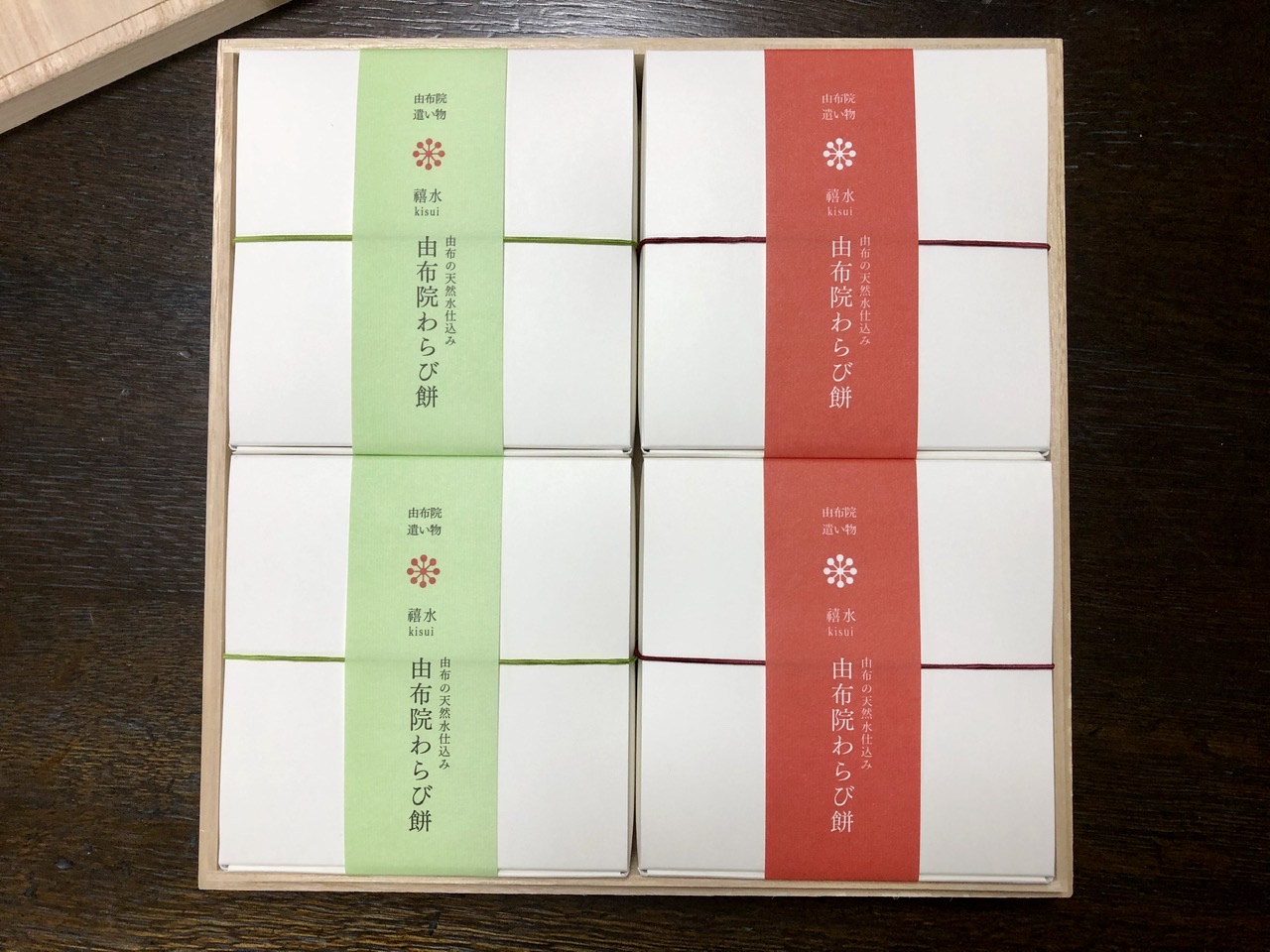 桐箱を開けると綺麗な黄緑と赤の帯がついた抹茶きな粉2個と黒糖きな粉2個の計4個のわらび餅。上品そうなお味が想像でき、早く食べたくなります。