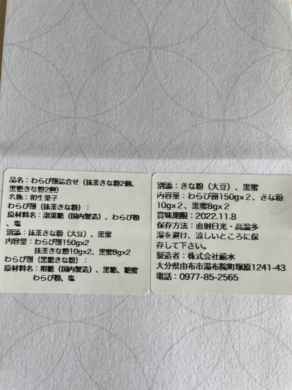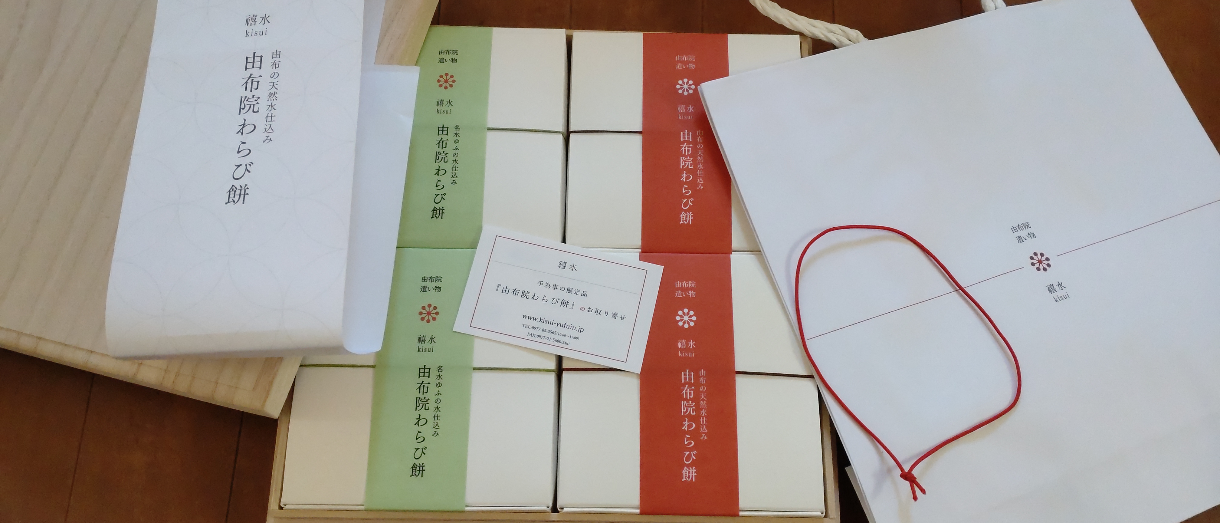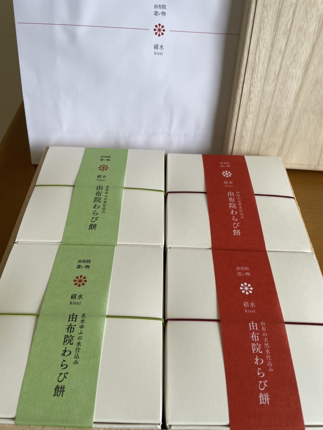 「由布院」のシンプルで飾らない自然の美しさを表現した「わらび餅」です。日本屈指の豊かな自然に恵まれた癒しの地「由布院」。由布の天然水とわらび粉、てん菜糖、黒糖、きな粉、抹茶など厳選した国産素材のみを使用。添加物、着色料、保存料等は一切使用していません。長時間かけて手煉りでじっくり煉り上げることで、今までにない繊細な食感、とろける口どけ、上品な味わいに仕上がっています。抹茶の緑が美しい「抹茶きな粉味」、黒糖のコクを感じる「黒糖きな粉味」の2種が桐箱入りの詰め合わせで届きます。