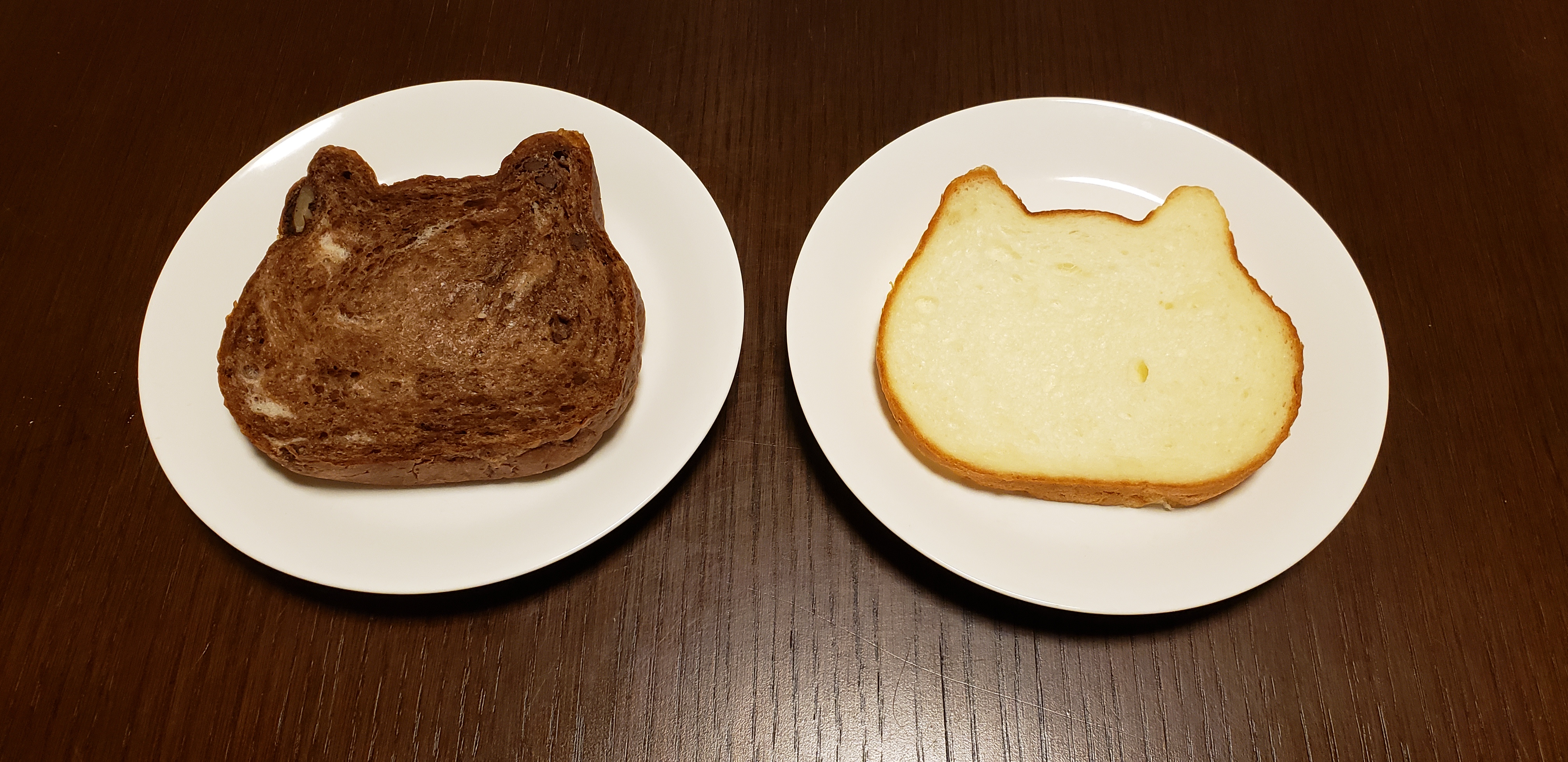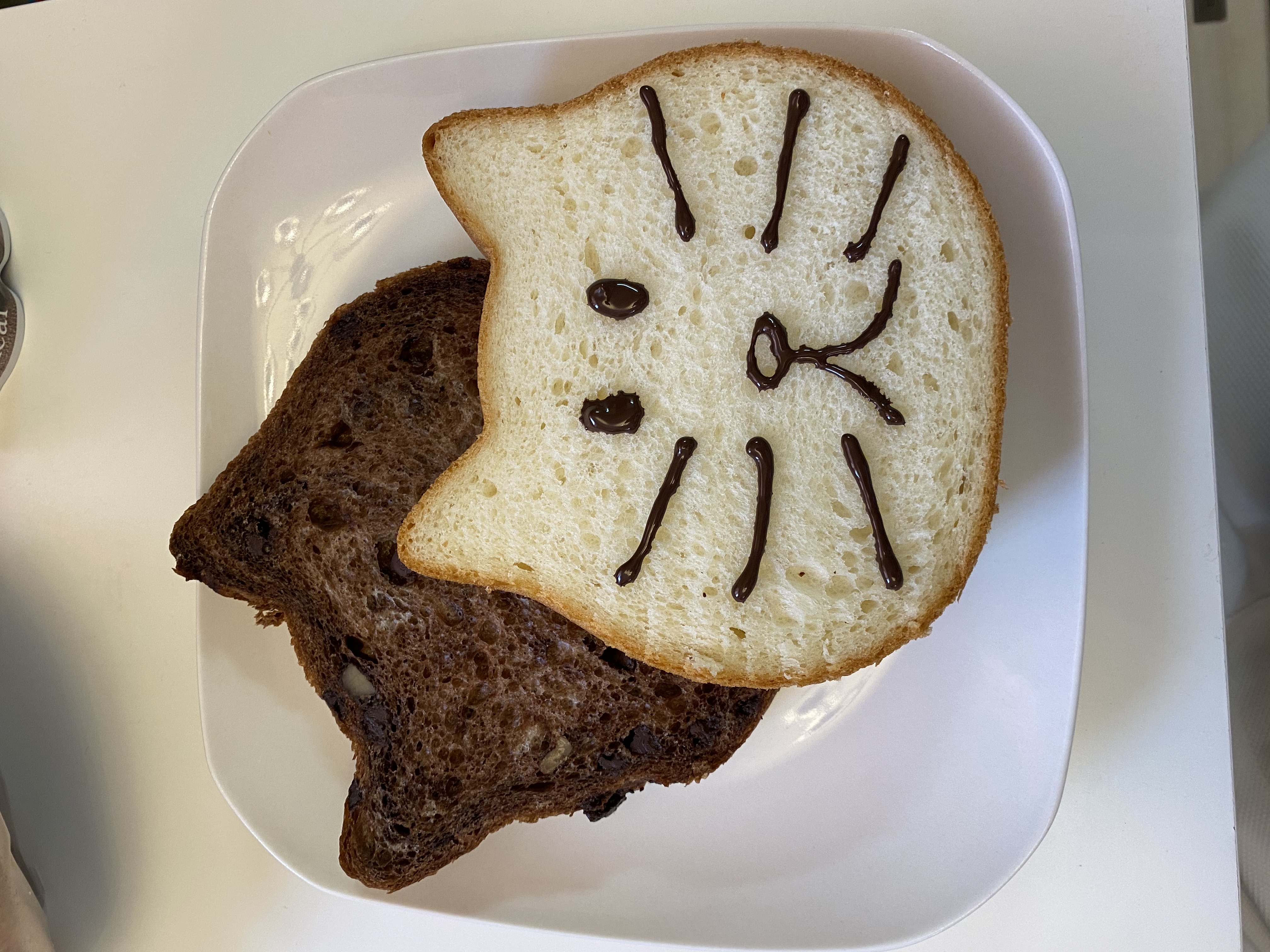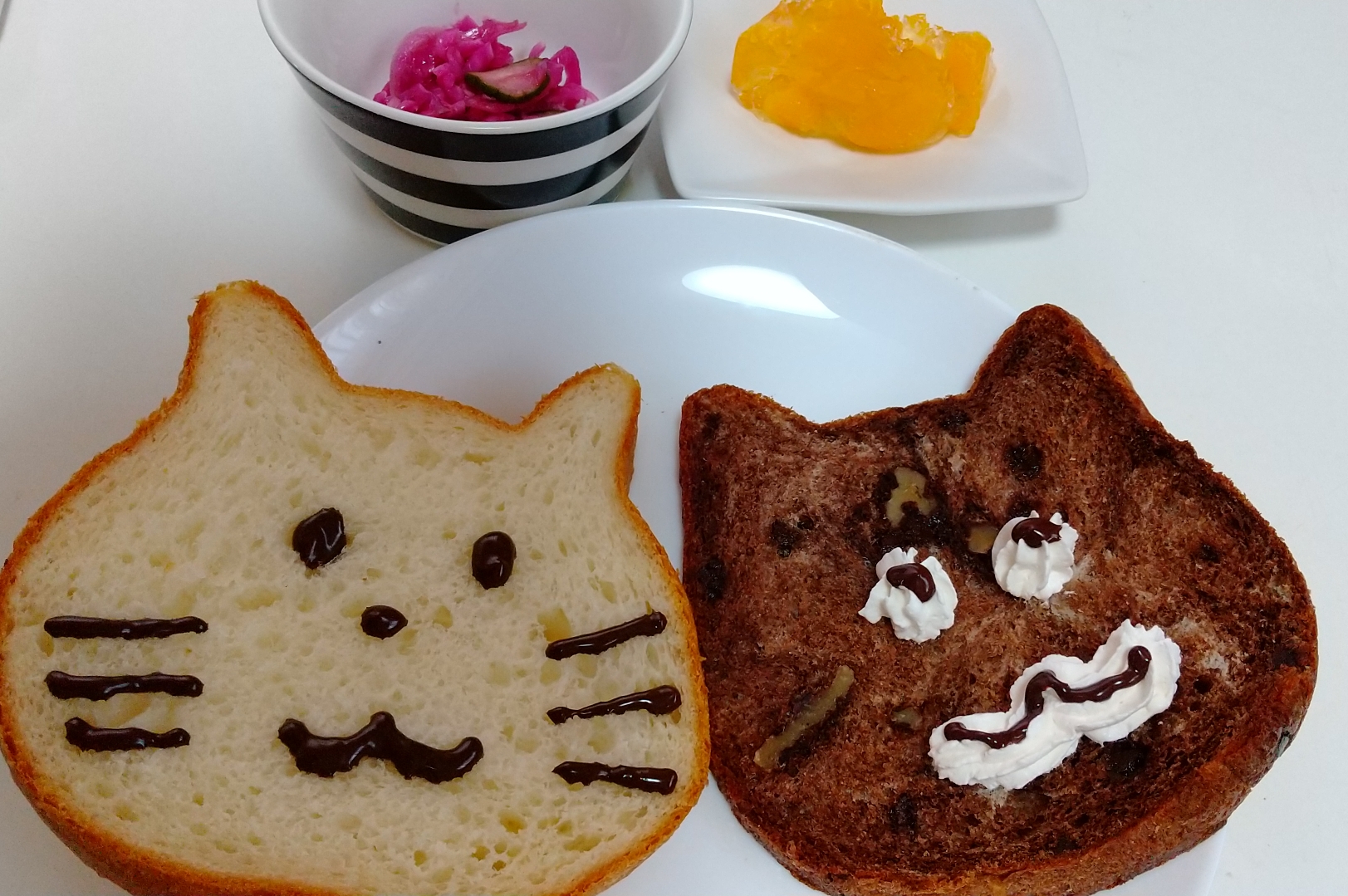 ねこねこ食パンの匂いと パン切り包丁の切りやすさと、更に、風味と 口に入れた時の、初めての味わい。プレーンは、しっとりしつつ、もっちりと。又、猫型の耳部分も、美味しかった。チョコは、クルミのアクセントで、所々にチョコが、ちりばめていて、風味が素晴らしく、良かったです。さぞ、商品にするまで時間を 費やした事でしょう。冷蔵庫にチョコペンは、置いています。