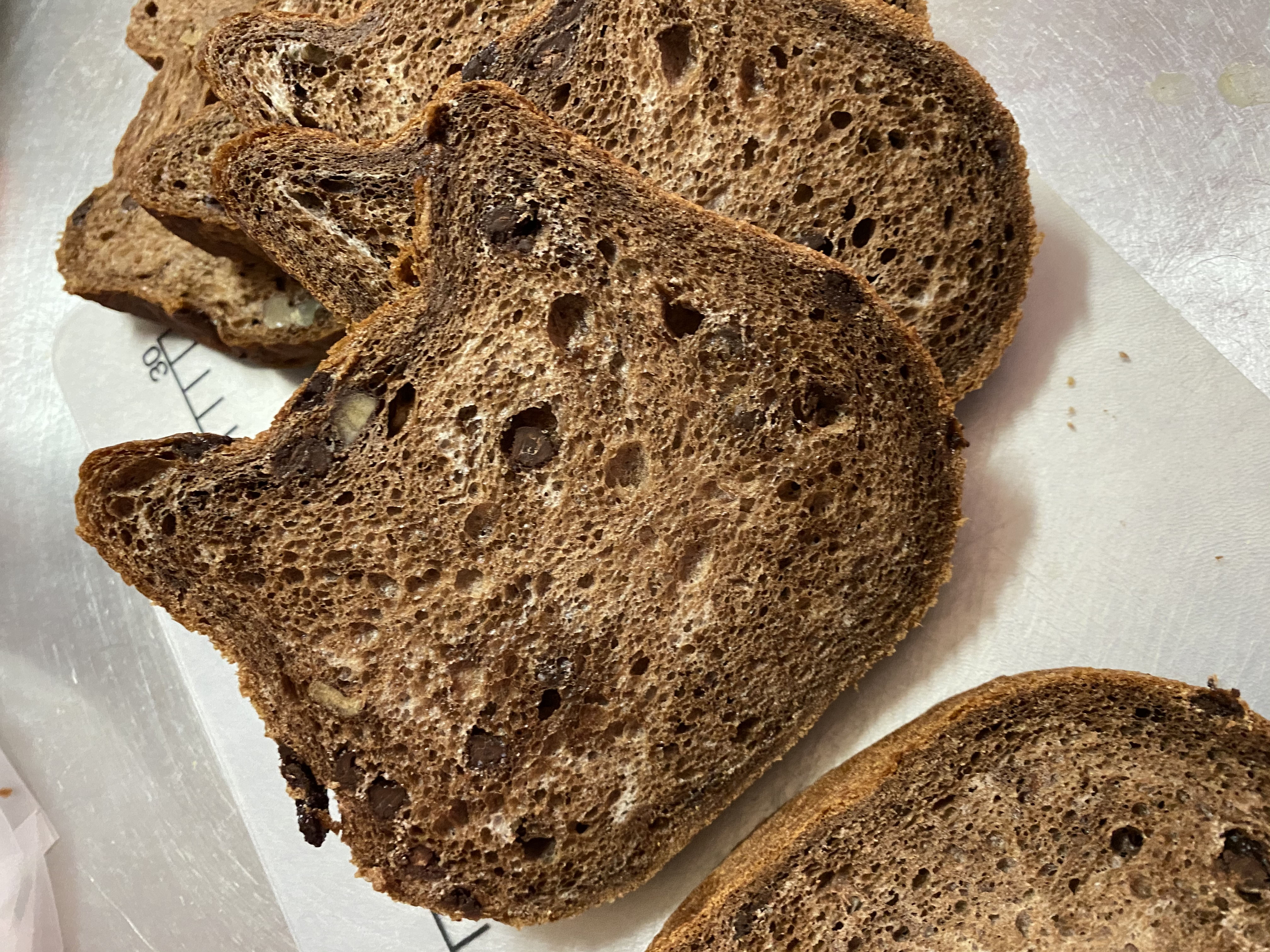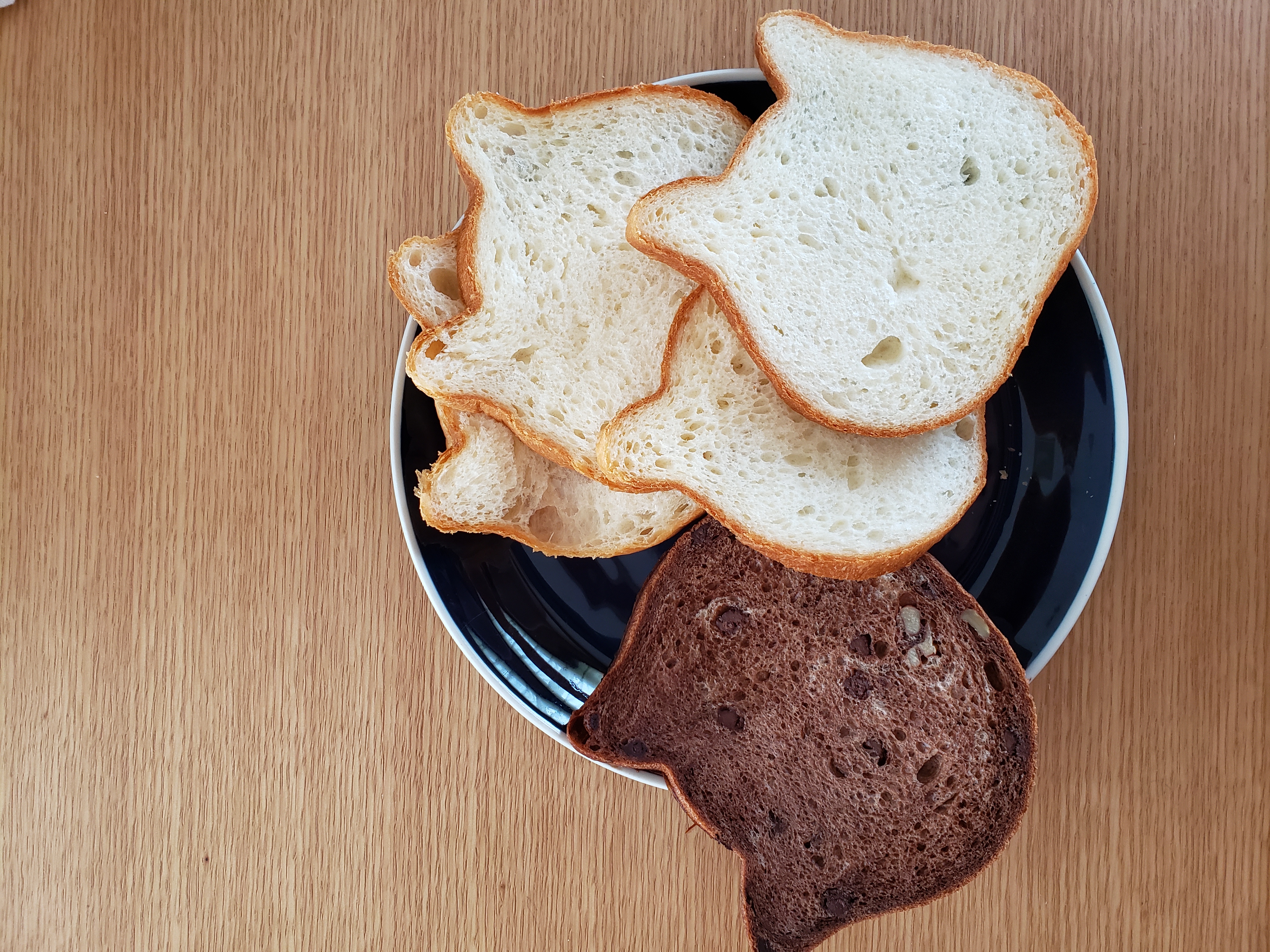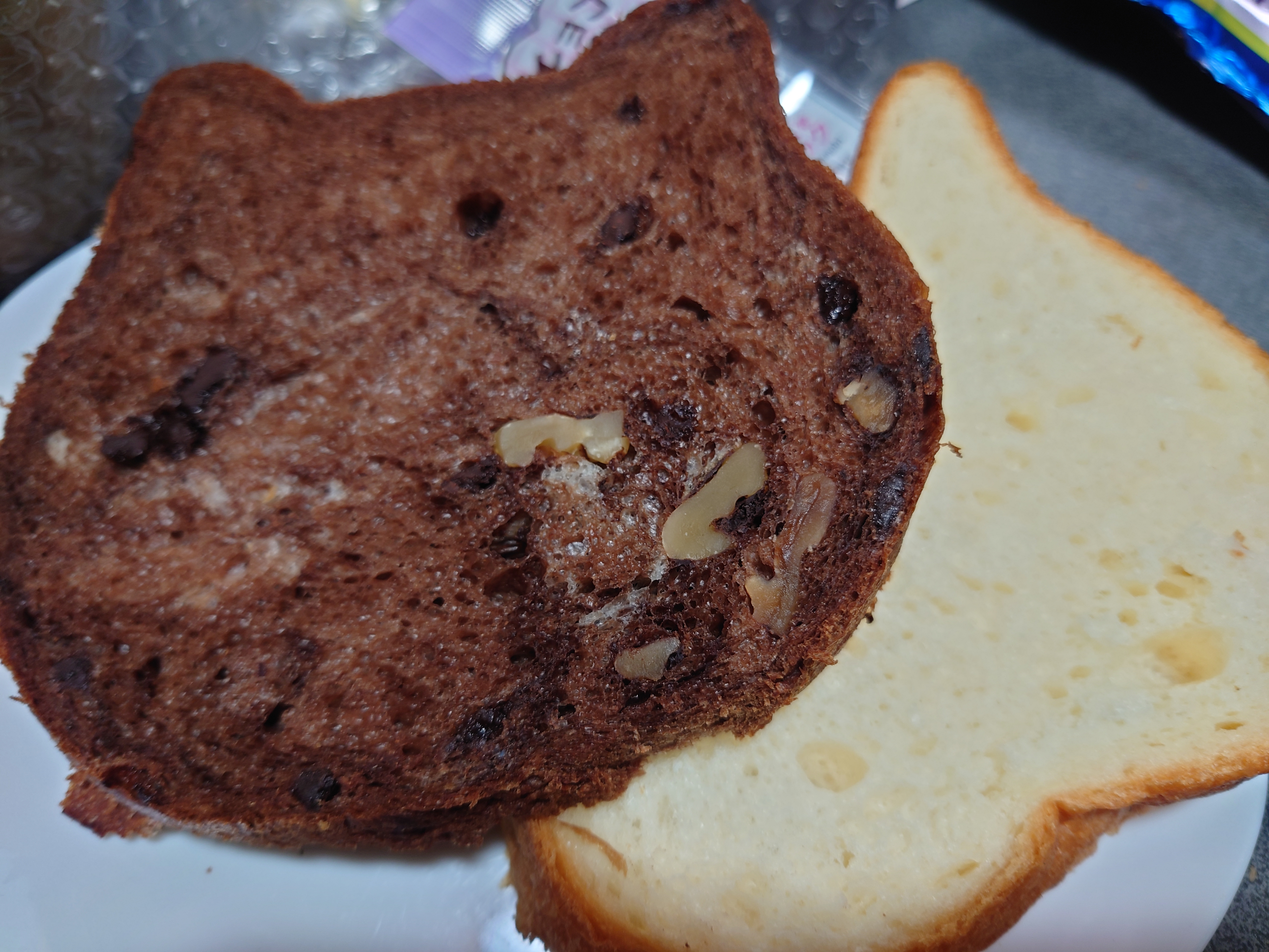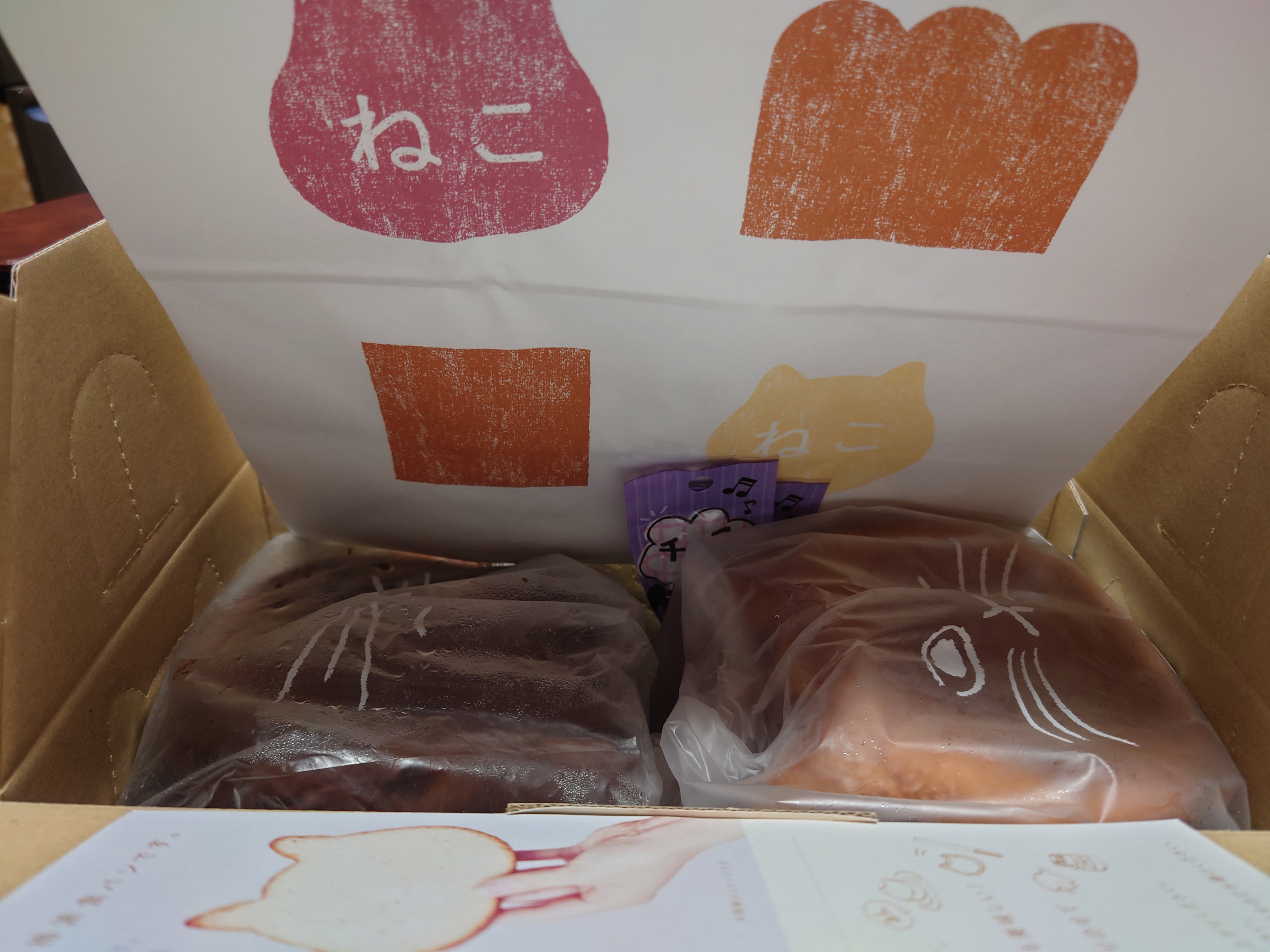 ねこねこ食パンの匂いと パン切り包丁の切りやすさと、更に、風味と 口に入れた時の、初めての味わい。プレーンは、しっとりしつつ、もっちりと。又、猫型の耳部分も、美味しかった。チョコは、クルミのアクセントで、所々にチョコが、ちりばめていて、風味が素晴らしく、良かったです。さぞ、商品にするまで時間を 費やした事でしょう。冷蔵庫にチョコペンは、置いています。