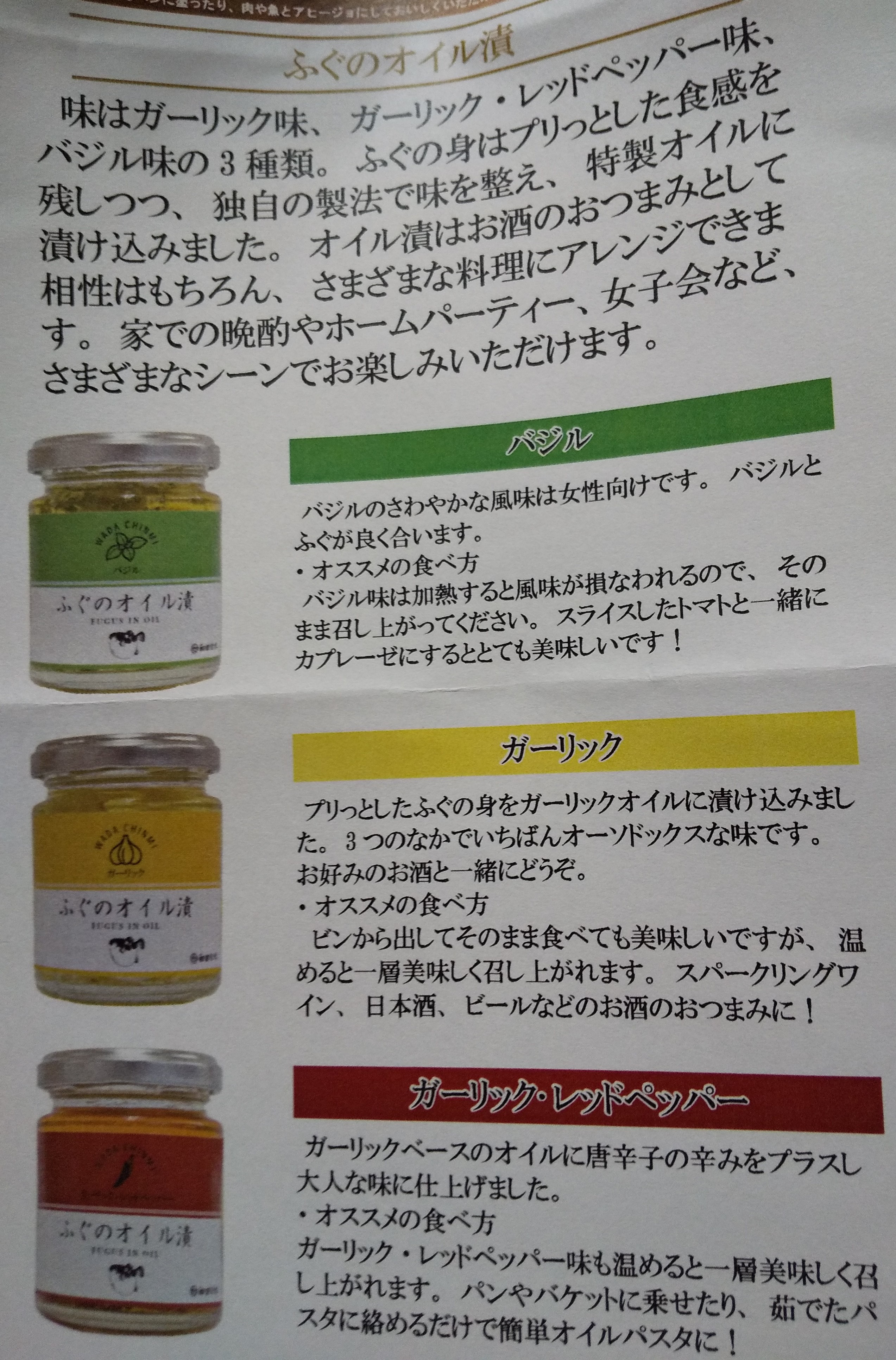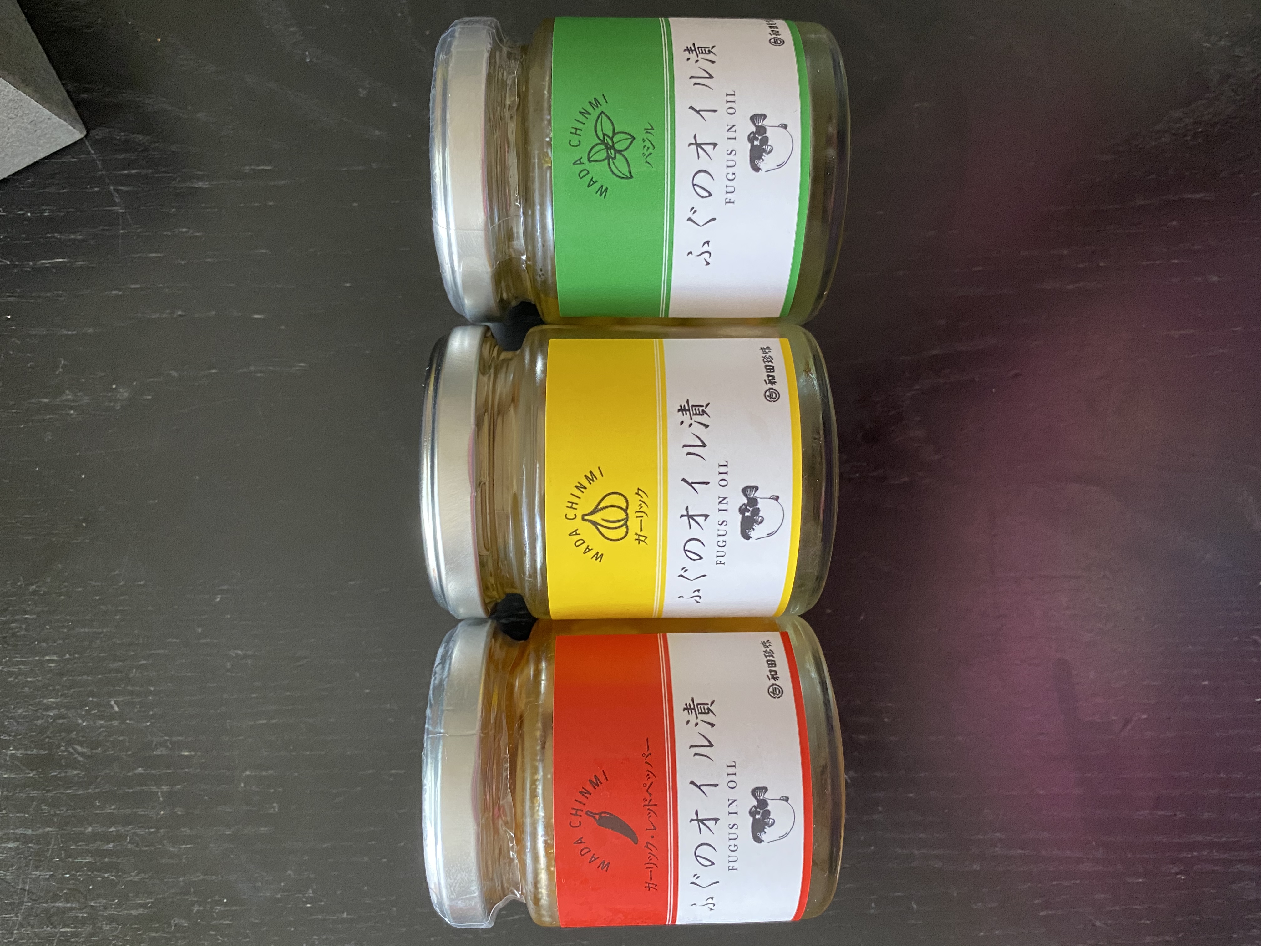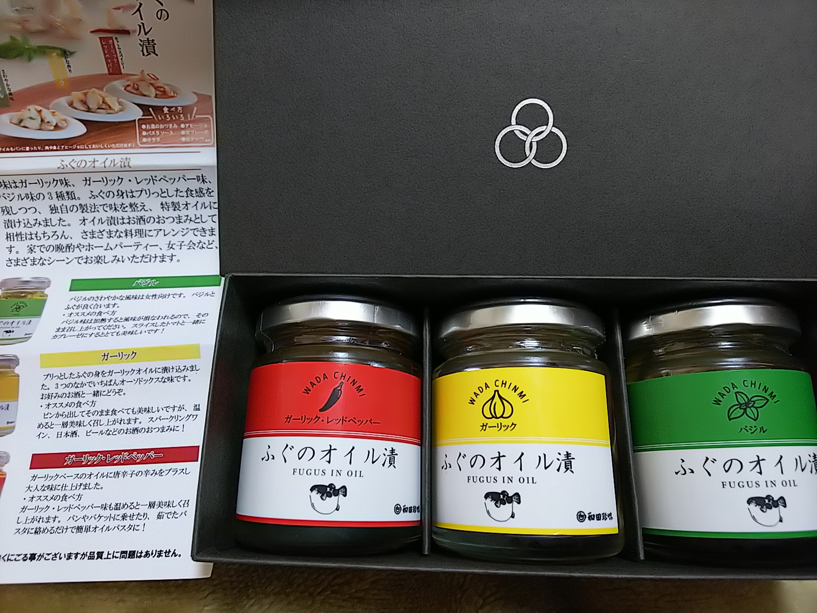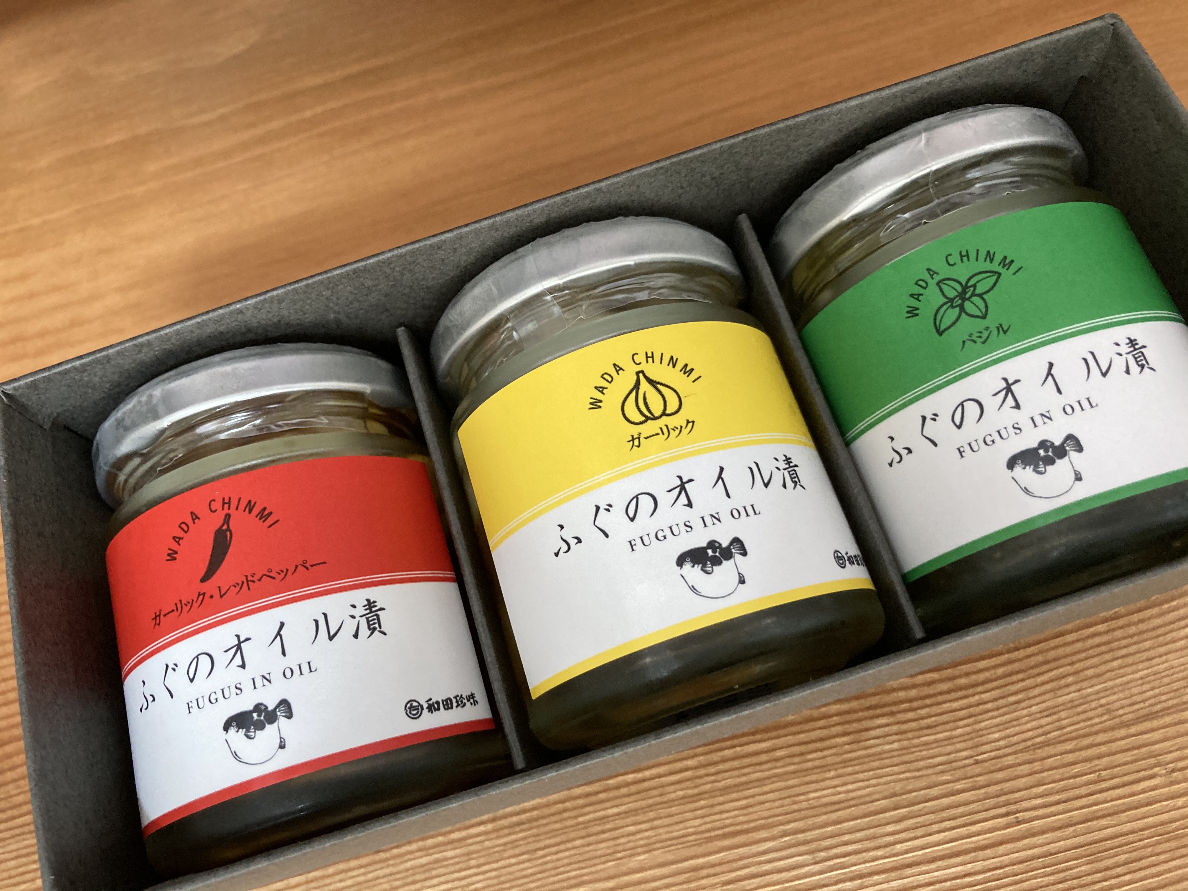 ふぐを手軽に楽しめる「ふぐのオイル漬」3種セットです。独自の技術で香ばしく焙焼した国産天然ふぐを、風味豊かな特製オイルに漬け込みました。爽やかなバジルの香りの「バジル」、は、ニンニクの香りが味を引き立てる「ガーリック」、ホットでスパイシーな「ガーリック・レッドペッパー」の3種セット。イタリアンテイストがワインとの相性抜群。お酒のおつまみやパスタソースにはもちろん、残ったオイルもパンに塗ったり、肉や魚とアヒージョにしても楽しめます。フグの新しい味わいを堪能できます。