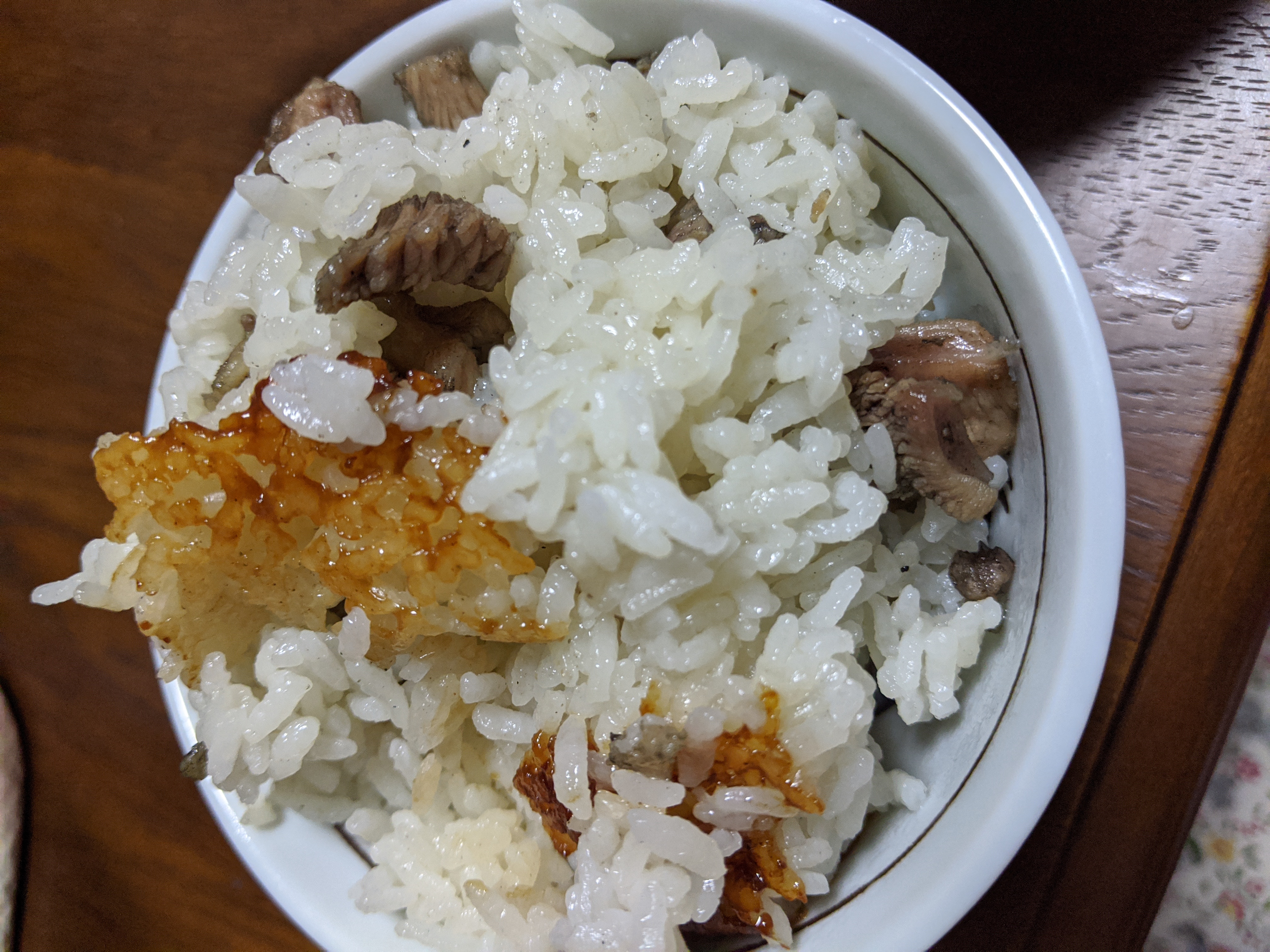 私が以前食べたことがある鶏飯は蒸し鶏をほぐしたものだったような気が・・・ 川田屋さんの鶏飯は炭火焼きの鶏です。炭火焼の鶏はかなりたっぷり。ご飯と一緒に炊き上げて作ります。炊いていると炭火焼の良い香りが漂います。