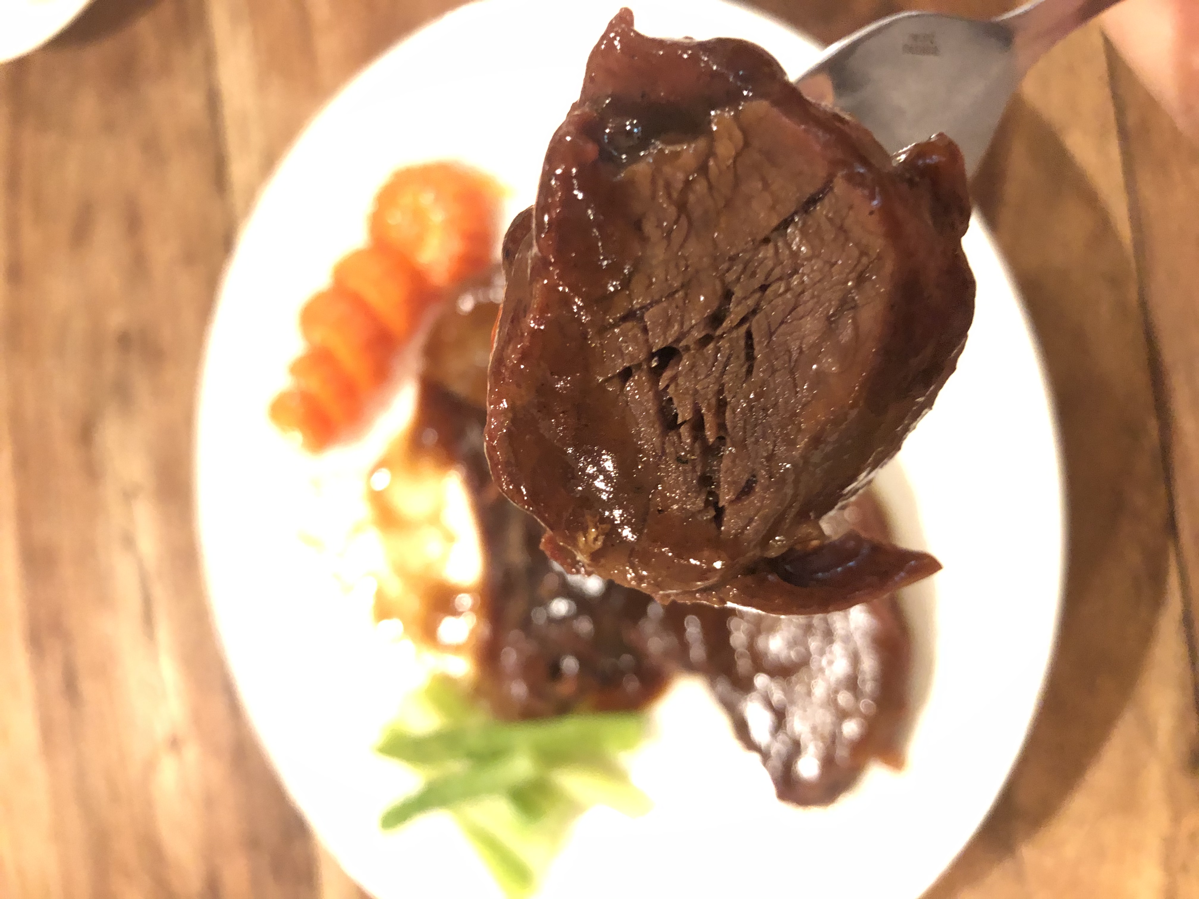一つ一つが大きめの塊にもかかわらずすっとお箸で割けるほどの柔らかさ。赤ワインを煮詰めたソ-スは旨煮が凝縮されていてしみじみと味わい深いです。