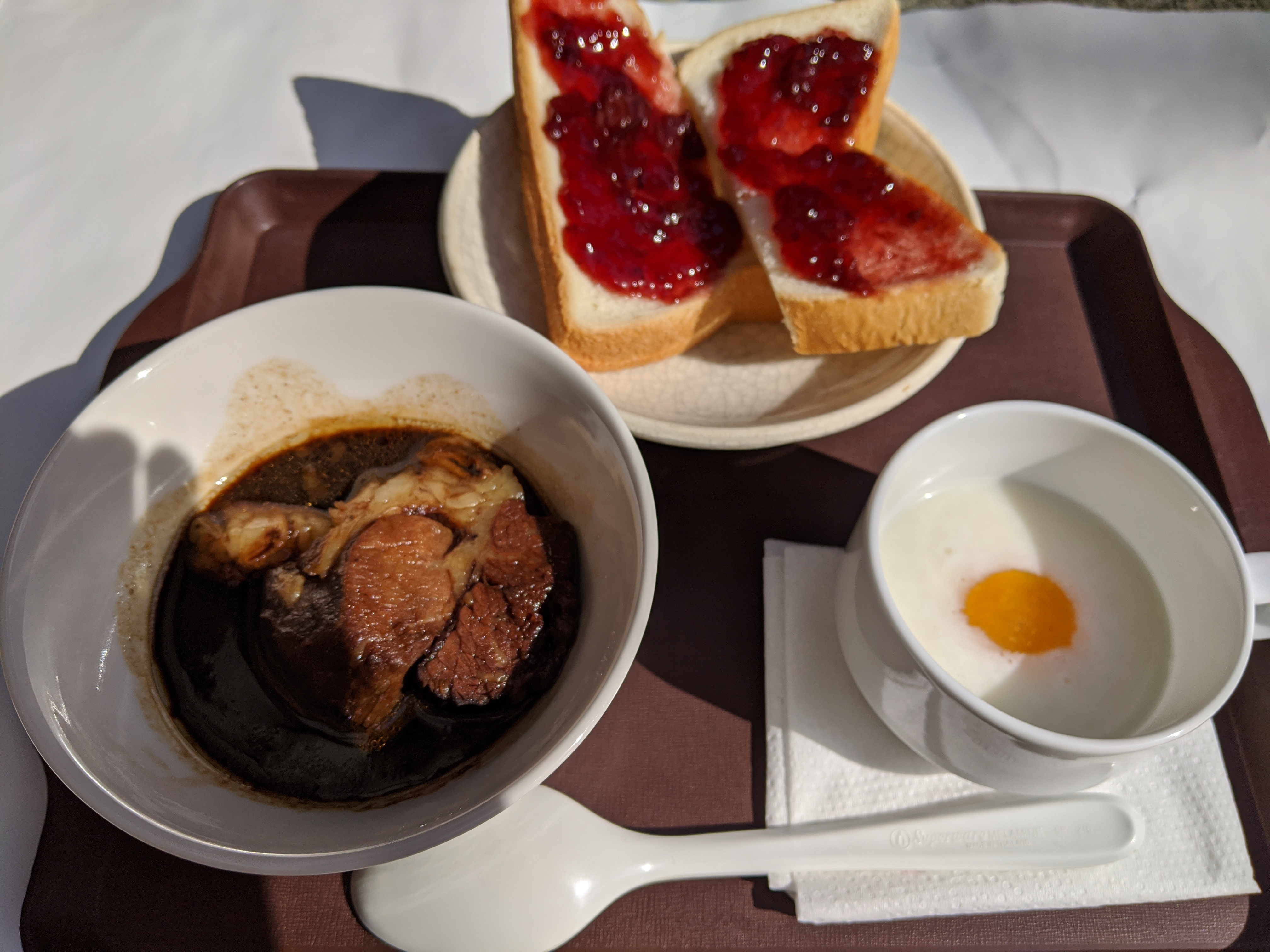 お肉の繊維すら感じさせないほど柔らかく煮込まれています。赤ワイン煮の方はさっぱりした感じですが、こちらの方がコク深く重厚な感じ。思いがけなく脂身の部分を食べた時は、その脂の美味しさにびっくり。お肉の脂って敬遠しがちですが、豚も牛も本当に上質なお肉は脂までもちゃんと美味しいのですね。お肉の旨味が溶け出したソースはもちろんフランスパンで綺麗に拭き取っていただきました。