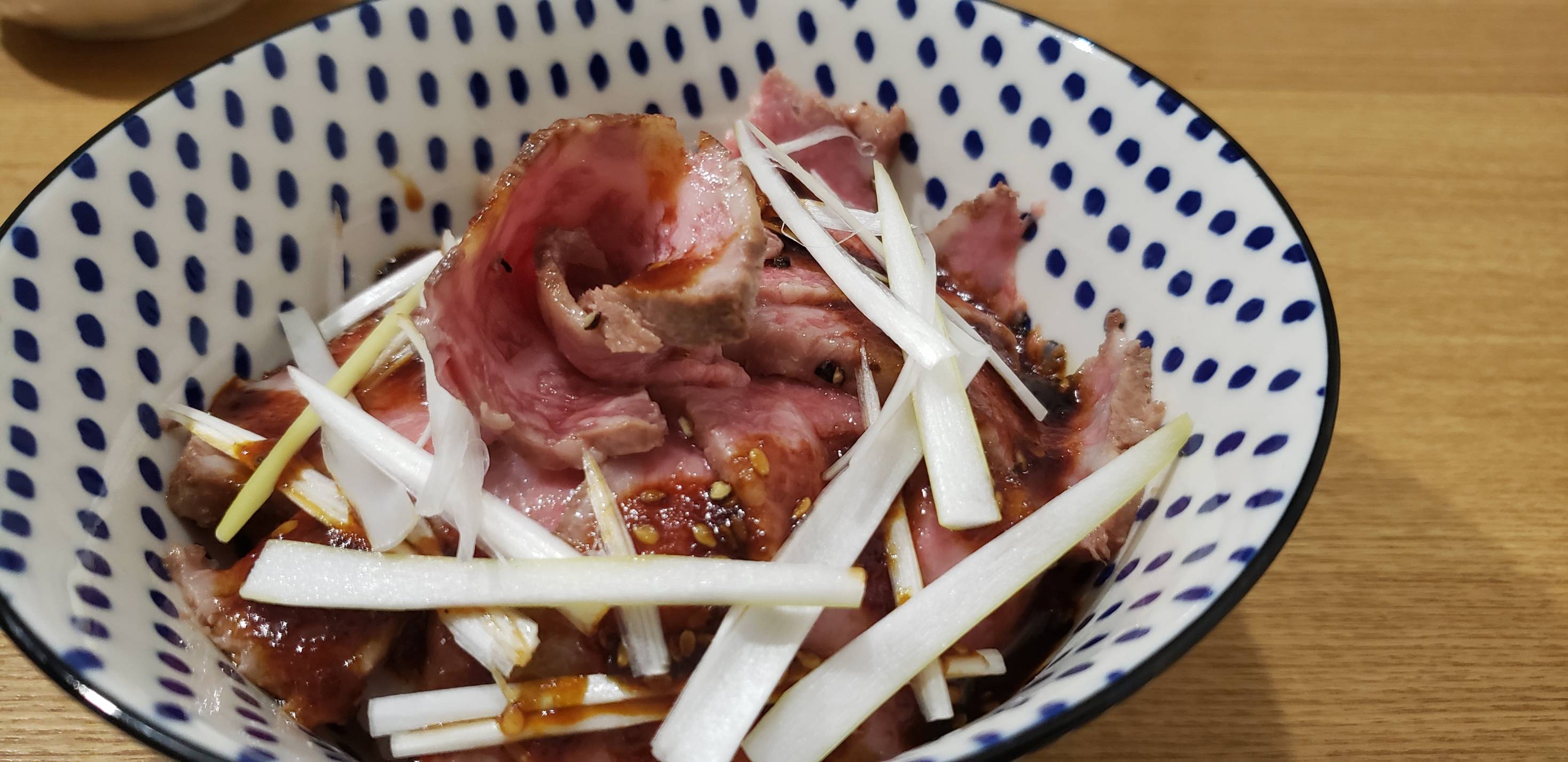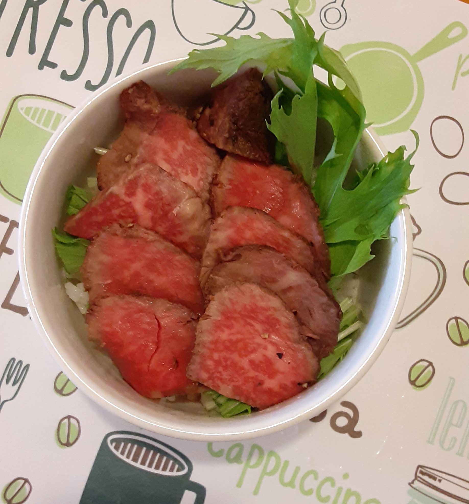 ほかほかのごはんをたっぷりと丼によそい、スライスしたローストビーフをたーっぷり。