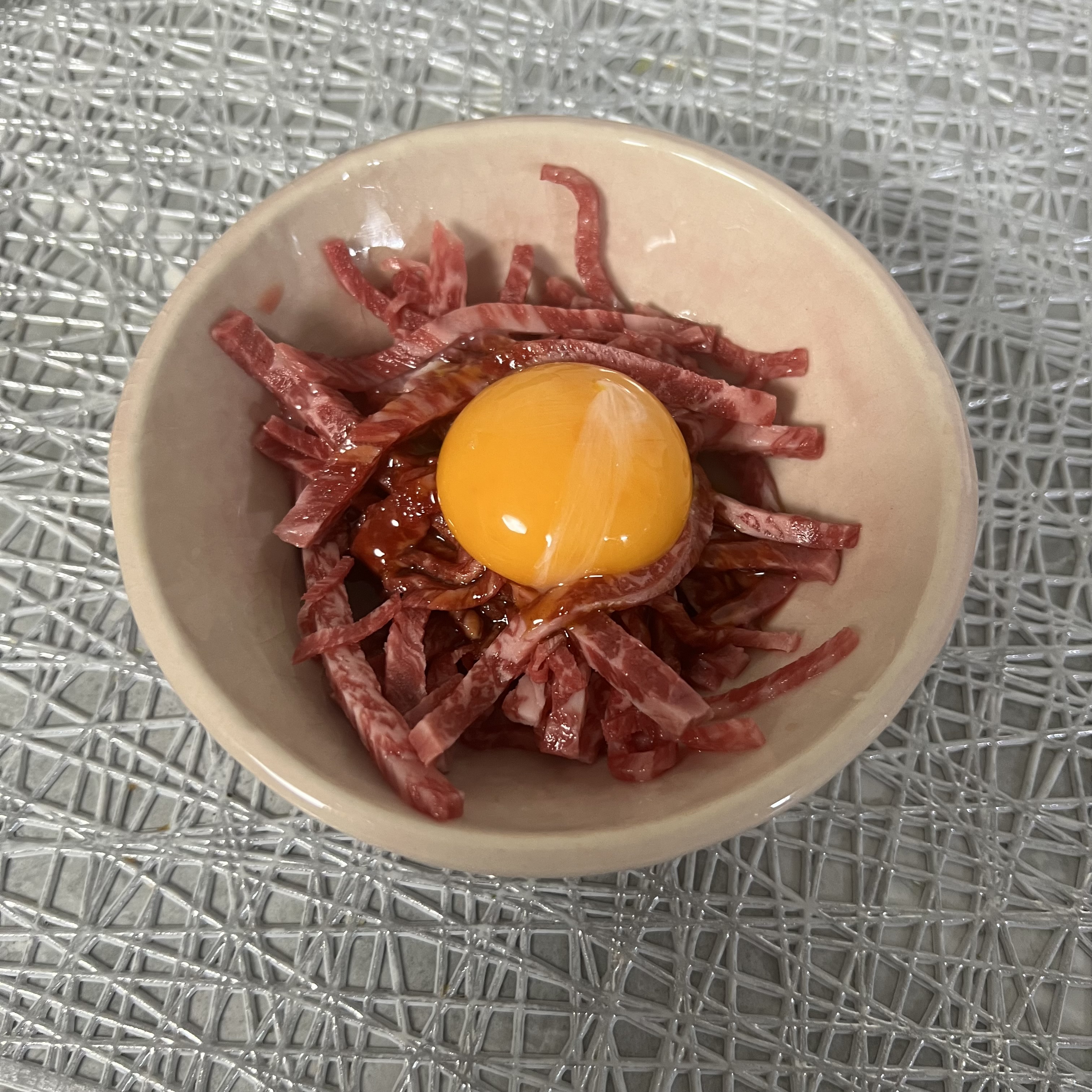 卵黄とねぎ、タレをかけて頂きました。肉は柔らかく、ユッケでしか味わえない独特の食感がたまりません。卵黄のまろやかさと濃いめのタレが抜群に合います。