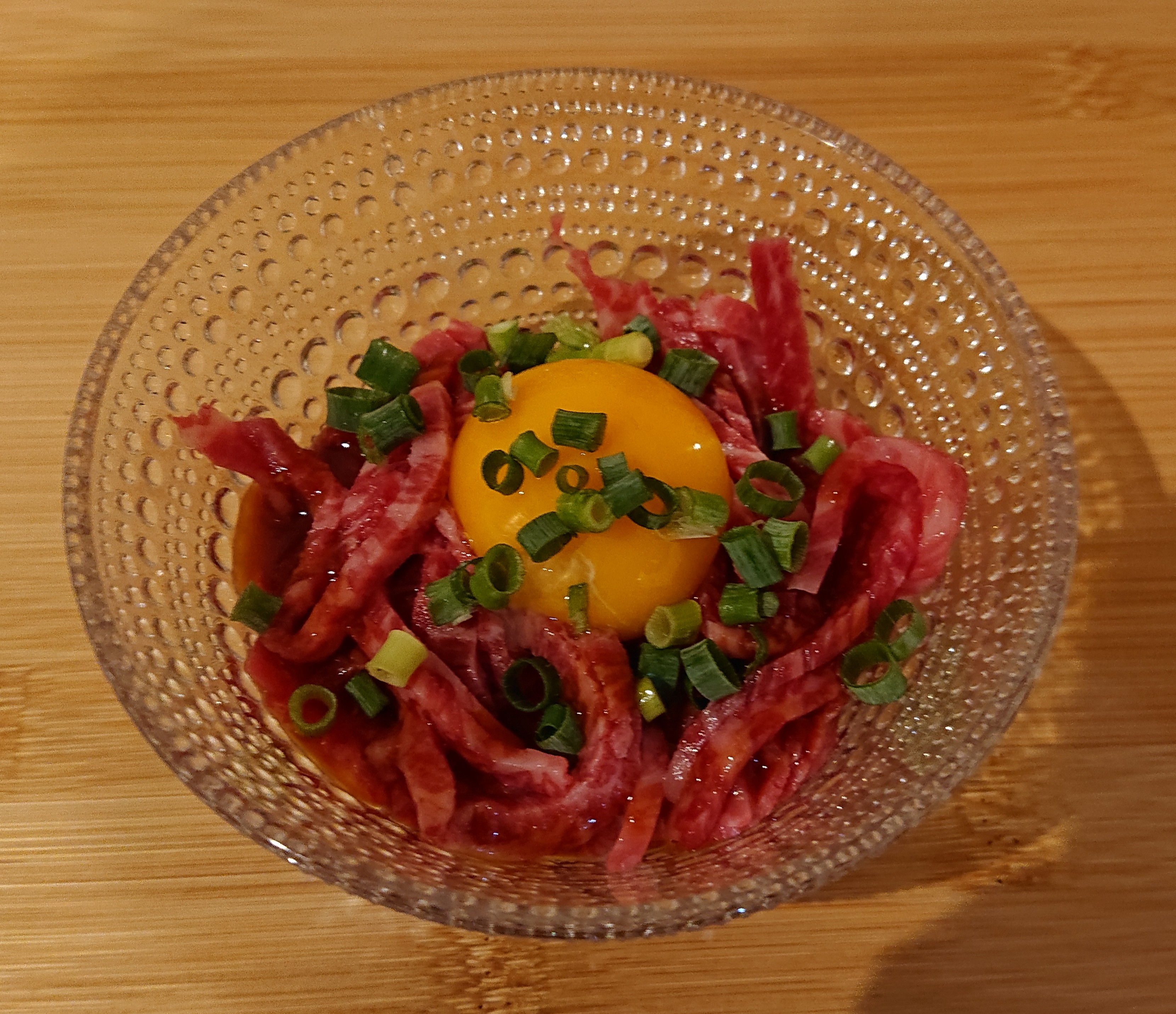 初めてユッケを食べる高校生の娘は、「生で食べて良いの?」と恐る恐るでしたが、一口食べて、「美味しい!」と大喜び。