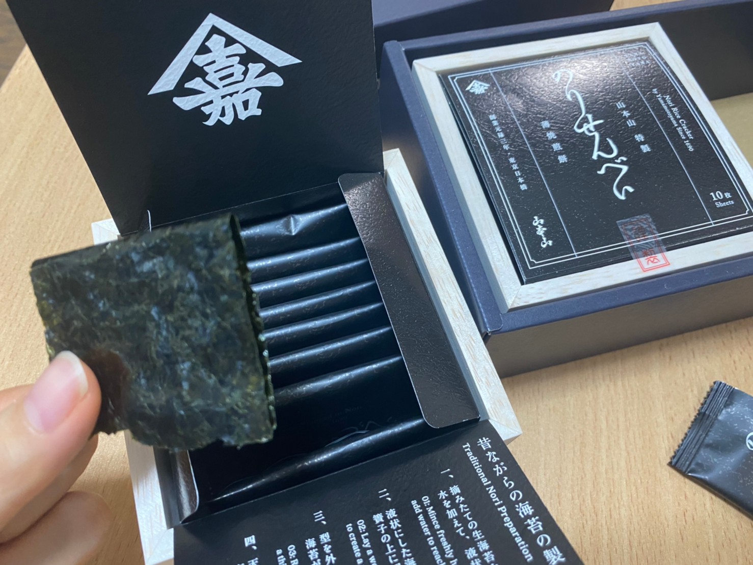 日本橋の老舗が作る「のりせんべい」です。海苔が主役薄焼き煎餅で、有明海産海苔を一つ一つ手作業で丁寧に巻いています。封を開けた瞬間から豊かな海苔の香りが広がり、海苔を味わい尽くせる逸品。海苔の柔らかくとろけるような食感、舌で溶けだした海苔本来の旨みと鼻に抜ける磯の香りは格別です。香ばしく焼かれた醤油味の煎餅が、海苔の味わいを引き立てます。薄焼き煎餅なので食べやすく、上品な木箱入りなので、贈答用にもおすすめです。