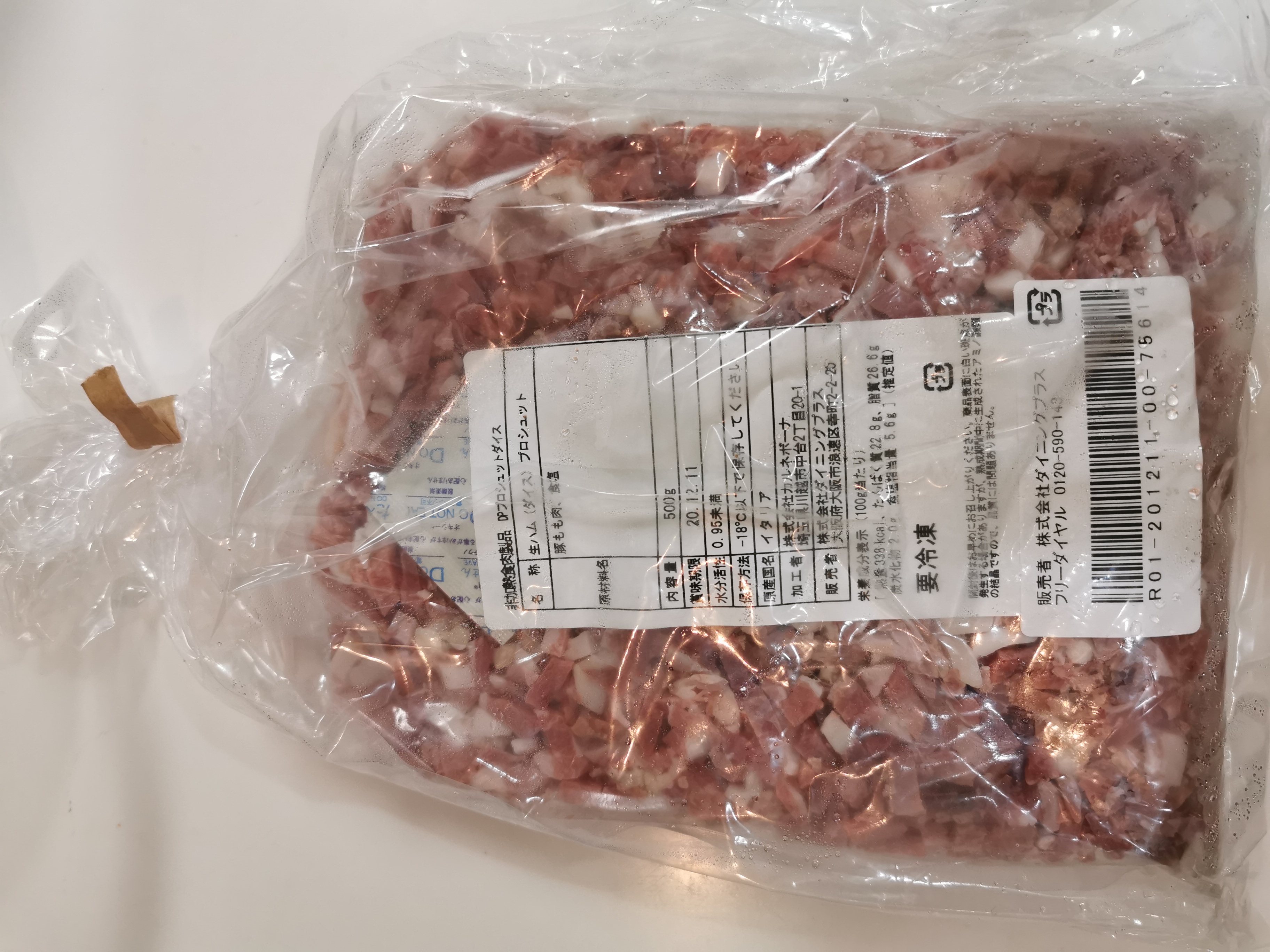 バラ凍結で冷凍できてとっても便利。生ハムって入ってるだけで使ってるだけで、料理がぐっとおしゃれになる気がしませんか?でも生ハムは日持ちしないし、そんなに毎度料理には使わないし、高いし、1枚1枚はがして使うたびに爪の中に脂入るし。このミニダイス生ハムカットは、賞味期限も3ヶ月もあるし、容量もかさばらず冷凍庫に常備しておけるので、さっと使えてほんとに便利!なかなか生ハムのダイス冷凍なんて見かけないし(私は初めてみました!)、出会ったときに買ってて損はないと思います!