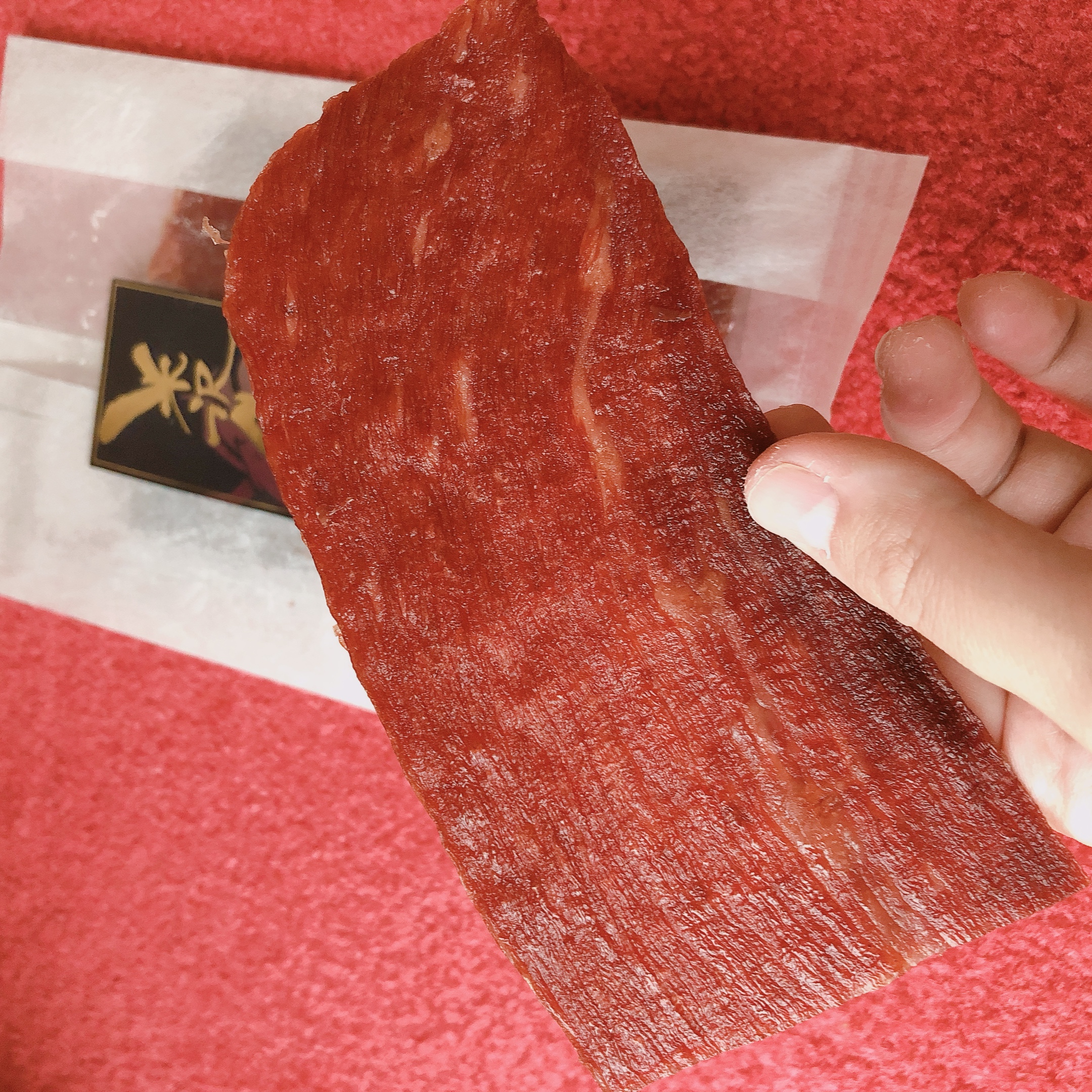 開けますと、お肉の薄切りをそのまま乾かしたような大きなジャーキーが入っています。