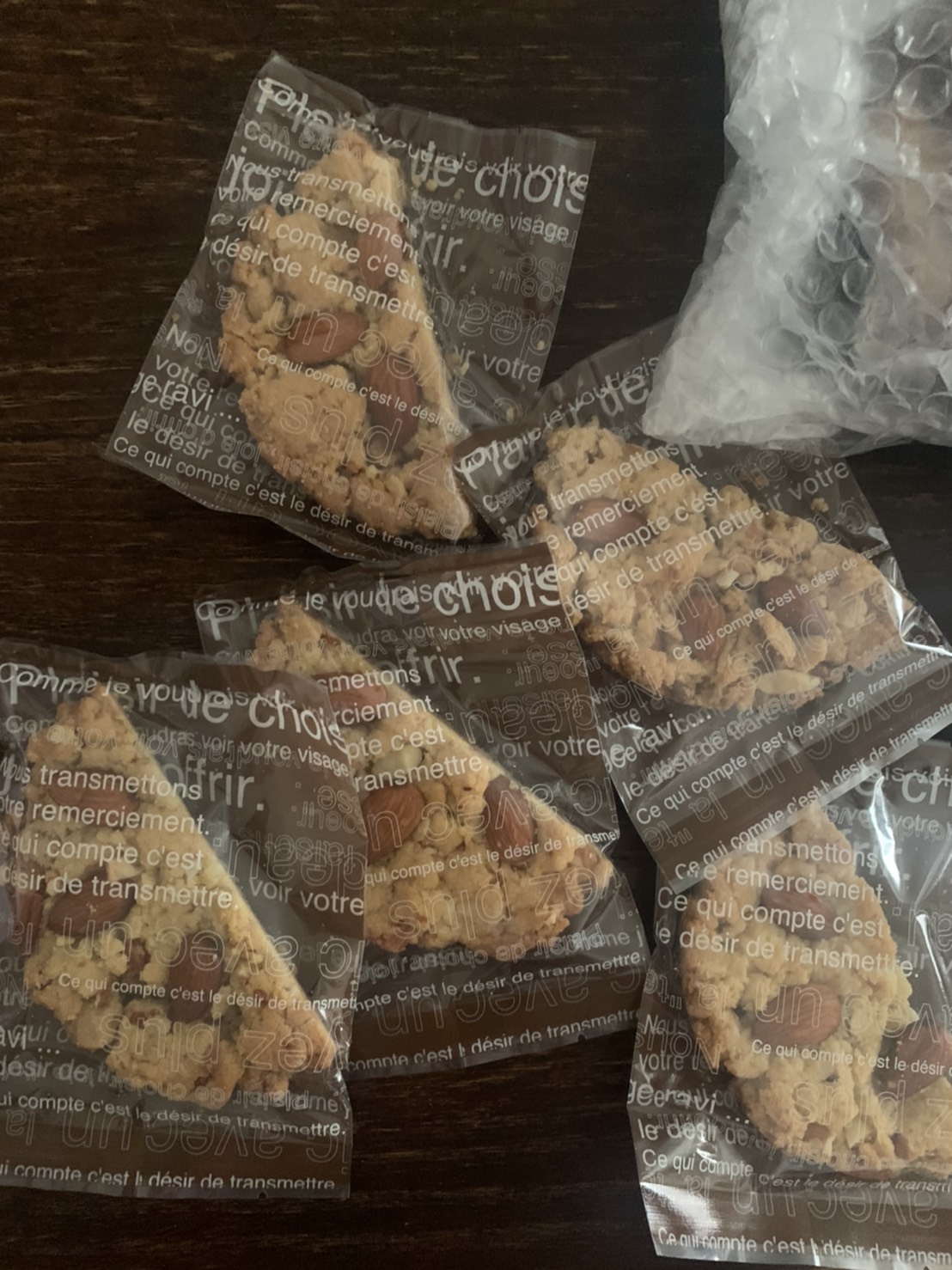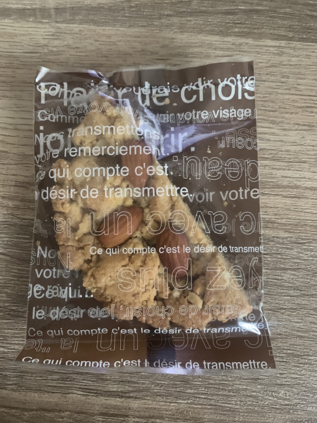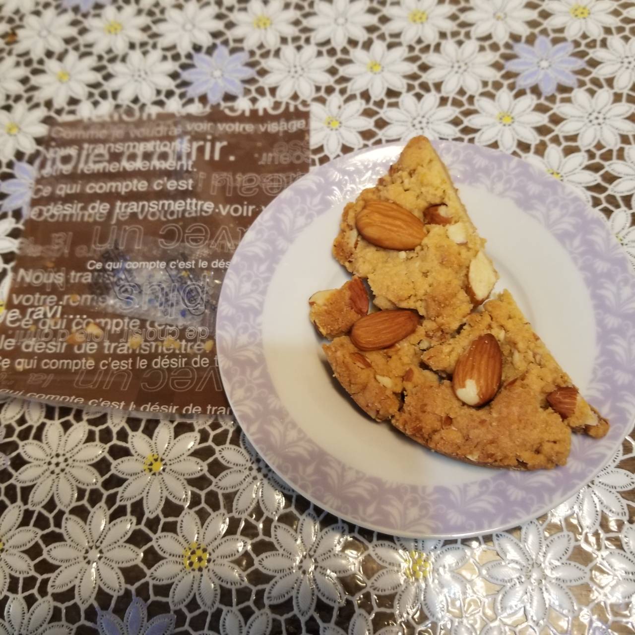 英字プリントの中身が見える個包装で、ビスコッティのようなゴツゴツとした表面に姿丸ごとのアーモンドが3粒均等に飾られており、半円状のフォルムもかわいらしいです。手に取ると想像よりもずっしりと重みがあり、食べ応えもありそう♪