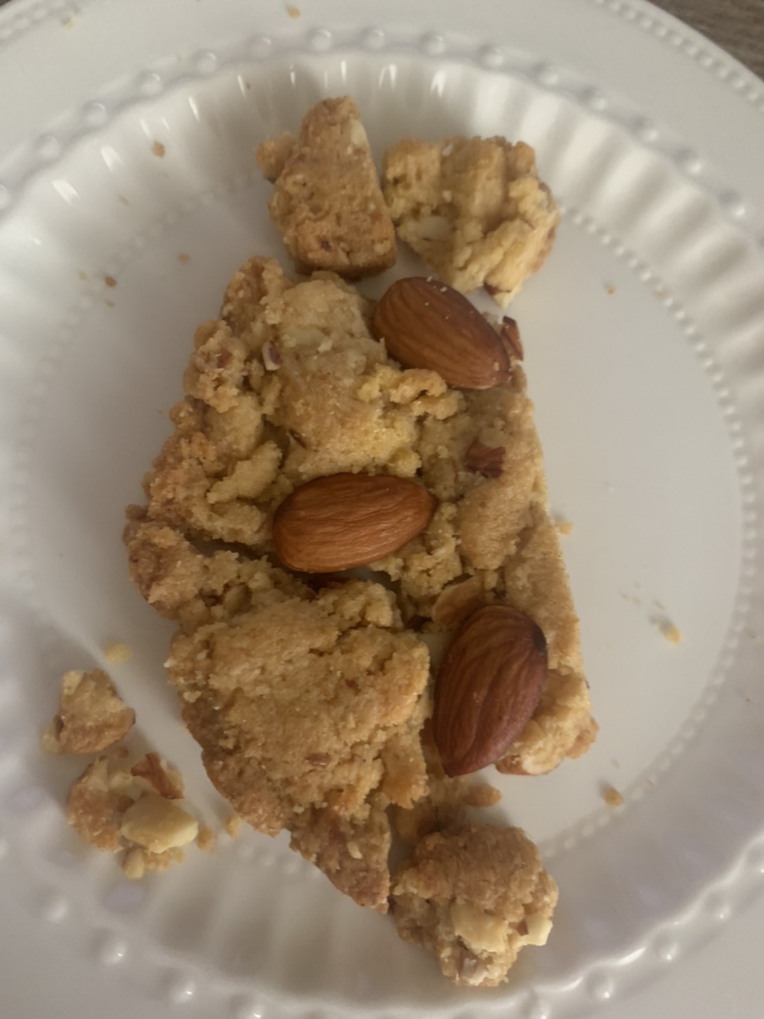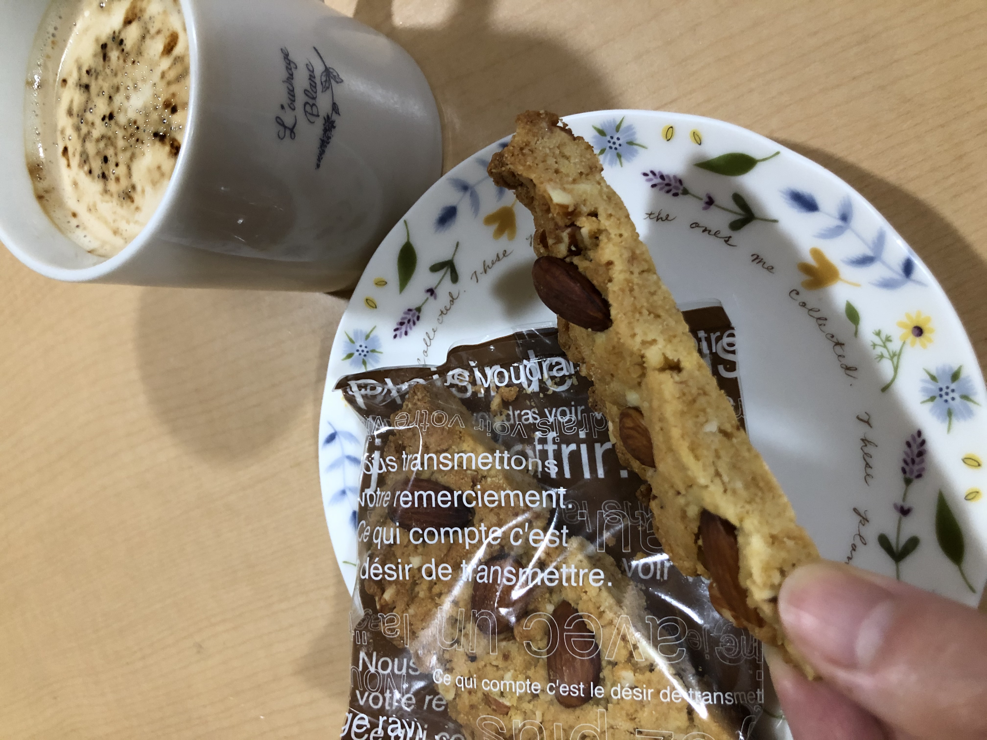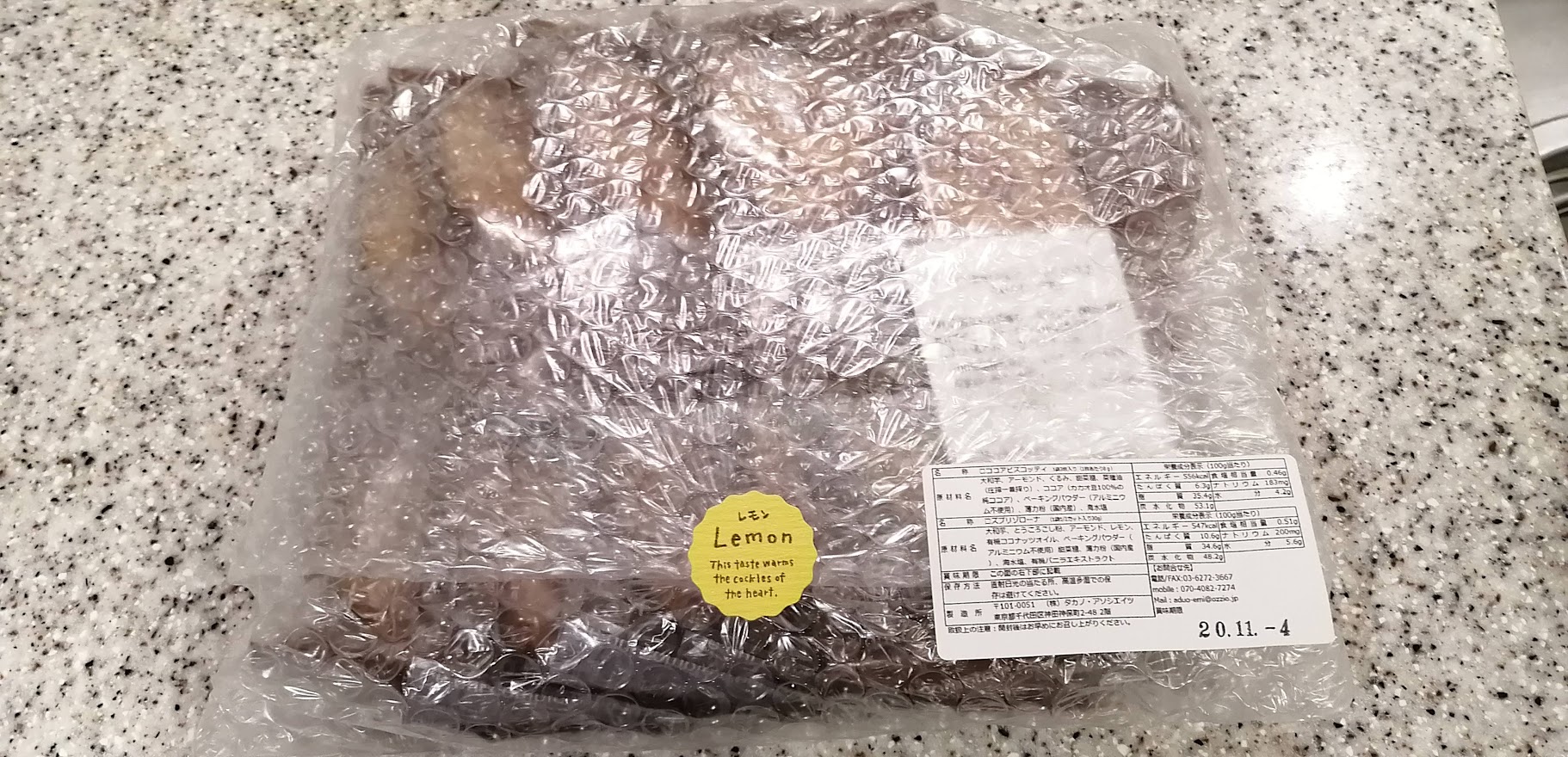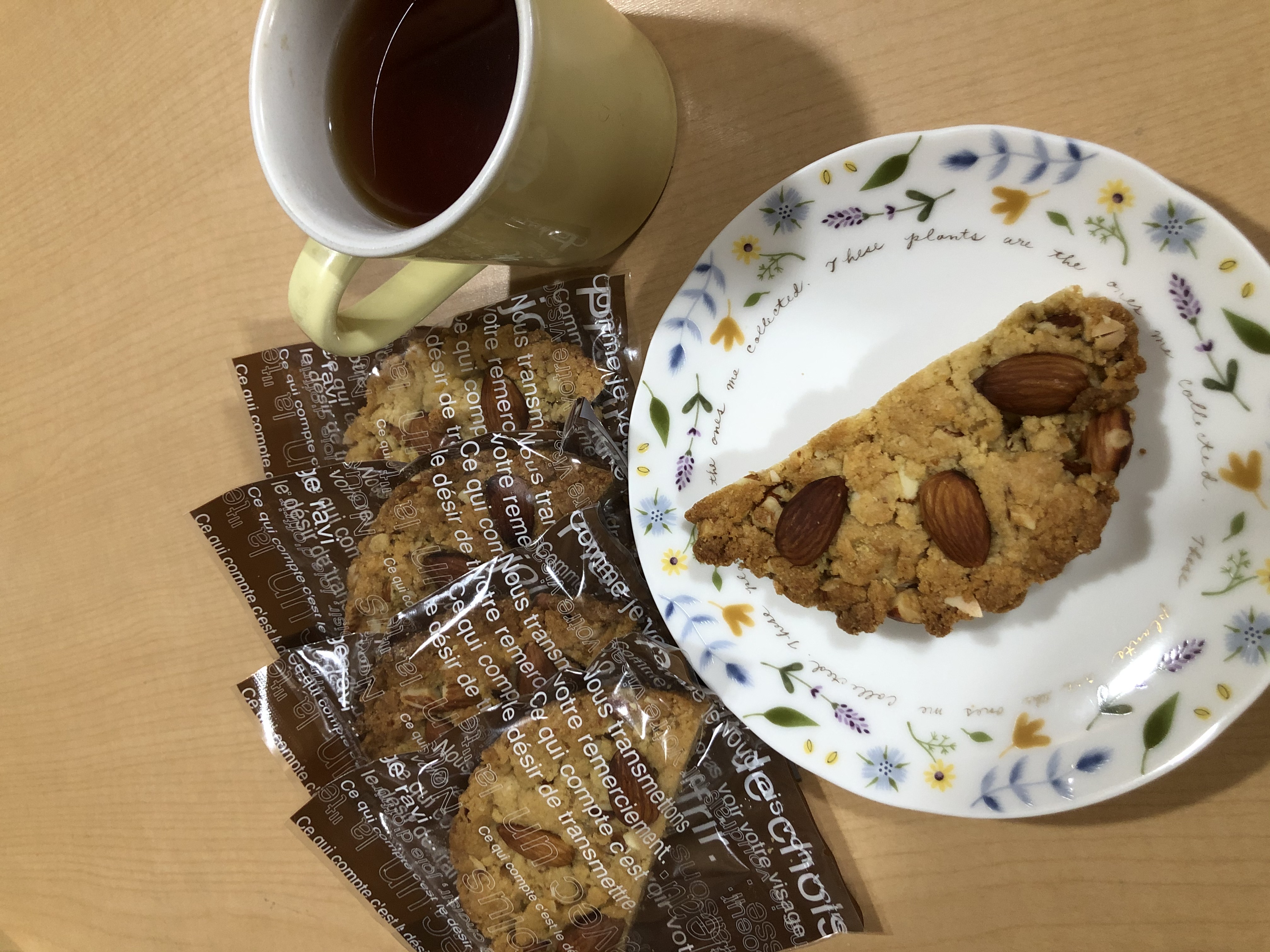 個包装を開けると、アーモンドの香ばしい香りに期待が膨らみます。一口食べるとザクっと硬めの食感で、こんがり焼き目のついたアーモンドもカリっと心地よく、想像以上にしっかりとした噛み応えがあります。生地の中にも砕いたアーモンドがたっぷり!これはナッツ好きにはたまりません。バターも白砂糖も使用せず作られているので物足りないかと思いきや、甘さとコクをしっかりと楽しむことができ、植物性材料のみで作られているとは思えない濃厚な味わいです。卵の代わりに大和芋、バターの代わりに有機ココナッツオイル、白砂糖の代わりに甜菜糖と、おいしさを損なわずにヘルシーな素材で上手に代替しているので、ただ体に優しいだけではなくちゃんと満足感があるところがうれしいですね。むしろ動物性材料や白砂糖を不使用だからこそ、アーモンドやとうもろこし粉のコクや風味が活かされ、噛む程に味わい深く飽きの来ないおいしさです。アーモンドの香ばしさの次にレモンの爽やかな酸味、最後に甘塩っぽさの余韻へとシフトし、1つのお菓子で表情の変化が楽しめる点も魅力的ですね。個人的には、レモンがほんのりというよりは結構しっかりめにアクセントになっているところがお気に入りで、この酸味が優しい甘みを引き立てているように感じます。