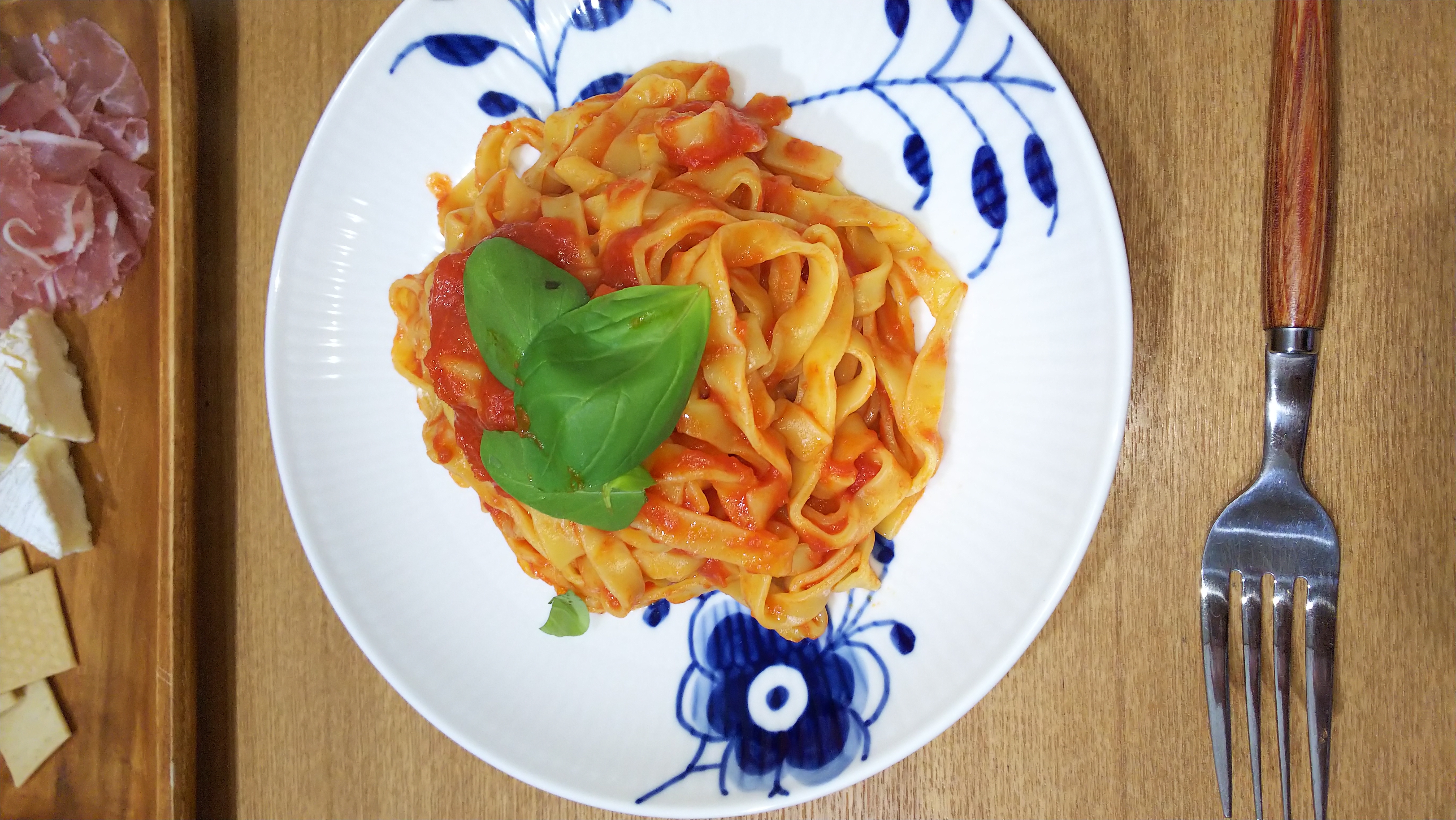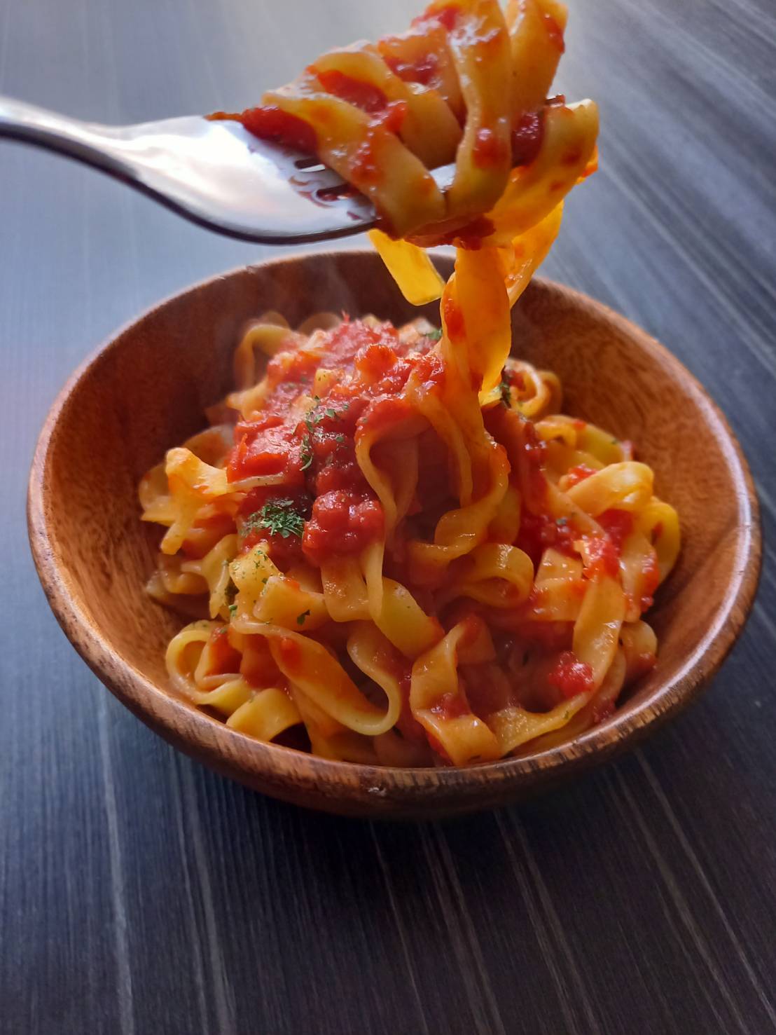 肝心の味わいは、想像していた以上にトマトソースのフレッシュ感と酸味が感じられ、トマトの味をダイレクトに味わえました。生パスタは特有のモチモチ食感が楽しめられ、平打ち麺であるのでトマトソースとよく絡み食べやすかったです。