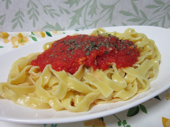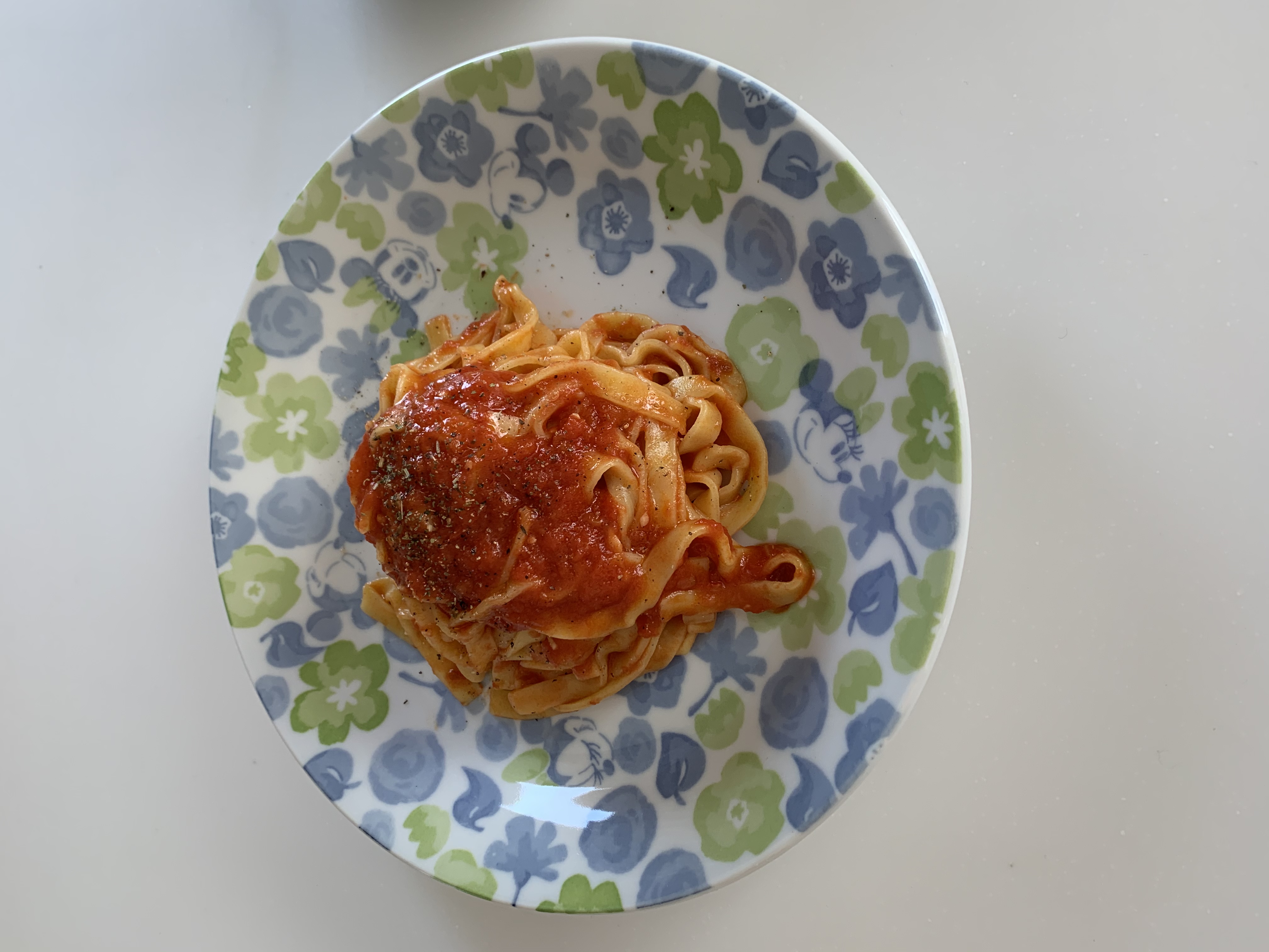 調理工程は、冷凍状態のまま生パスタを茹で、湯煎で解凍したトマトソースをフライパンで絡めて皿に盛り付けるだけというシンプルで時間のかからない手軽な商品で魅力的でした。
