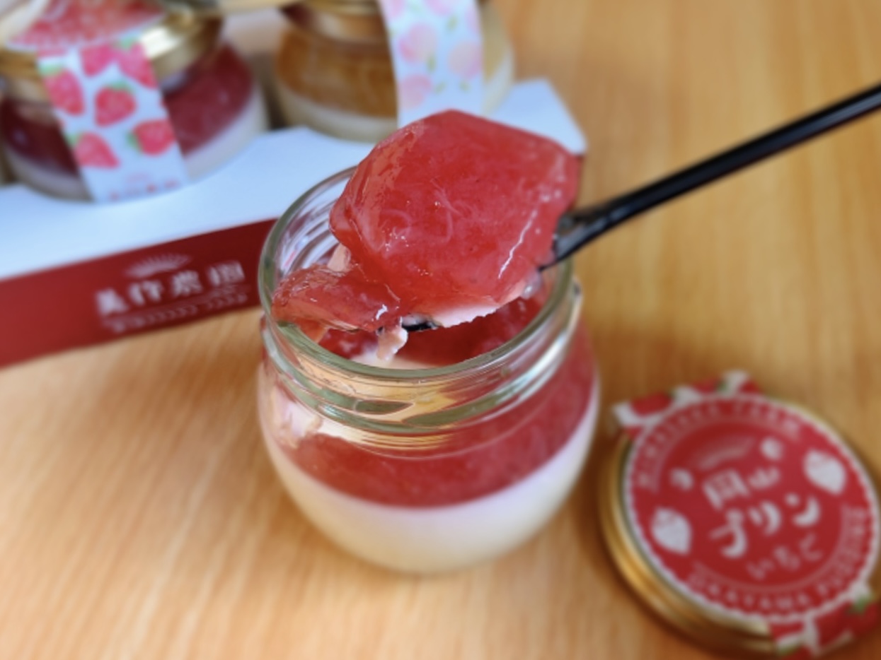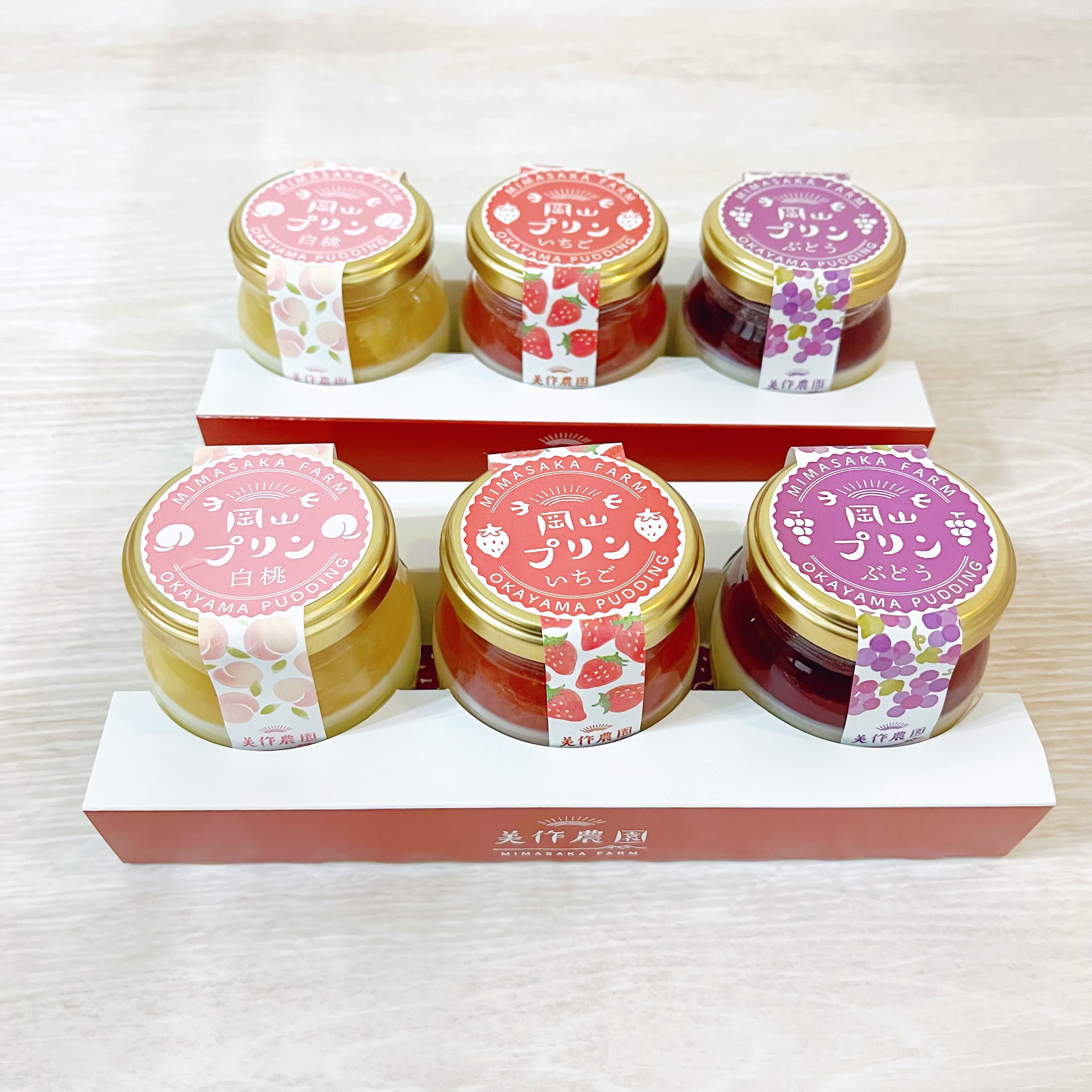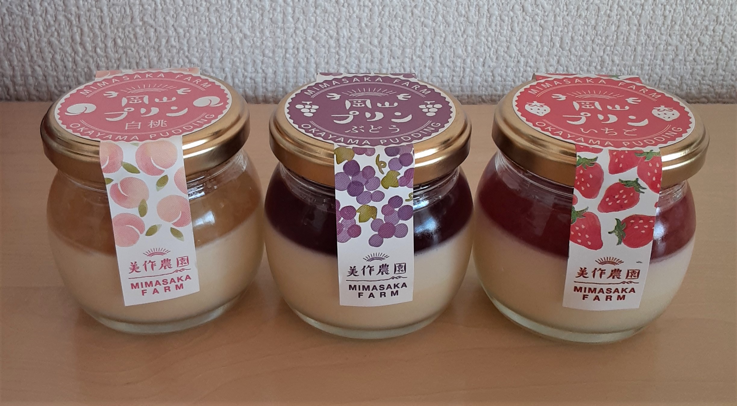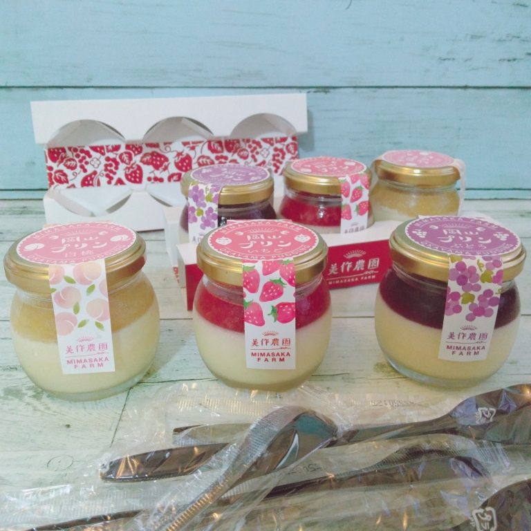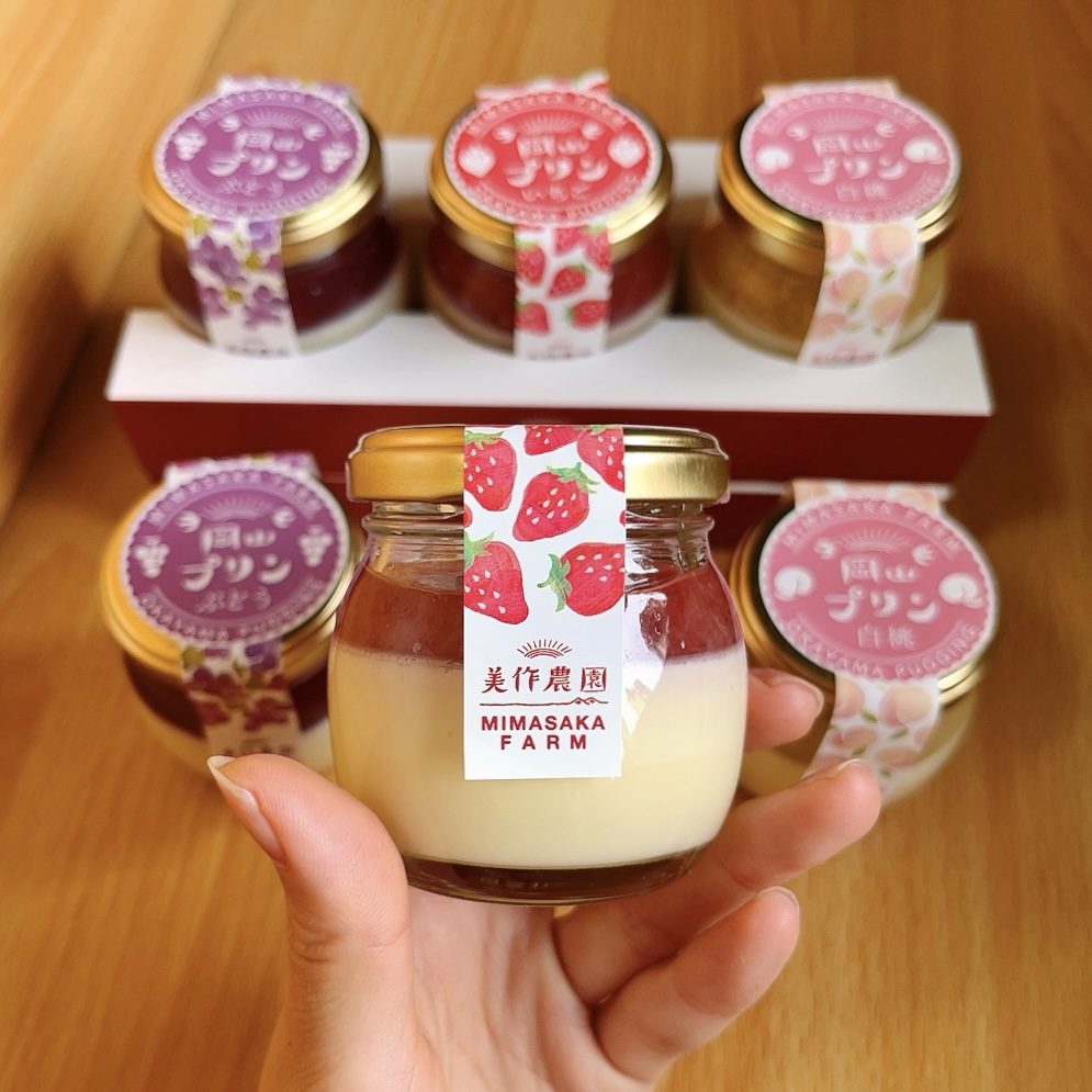 岡山県の観光農園で収穫したフルーツや、岡山県産のこだわり食材を使用した「フルーツプリン」です。フルーツ王国・岡山のいちごとぶどう、白桃で作ったジュレは、果肉たっぷりでジューシー。プリンは県内の養鶏場から赤鶏のもみじ卵、蒜山ジャージー牛乳を使用し、濃厚でなめらかな食感です。フルーツの酸味と甘みを感じるジュレと、滑らかなプリン、ほろ苦いカラメルとの相性は抜群。可愛らしいパッケージなので手土産スイーツとしてもおすすめです。