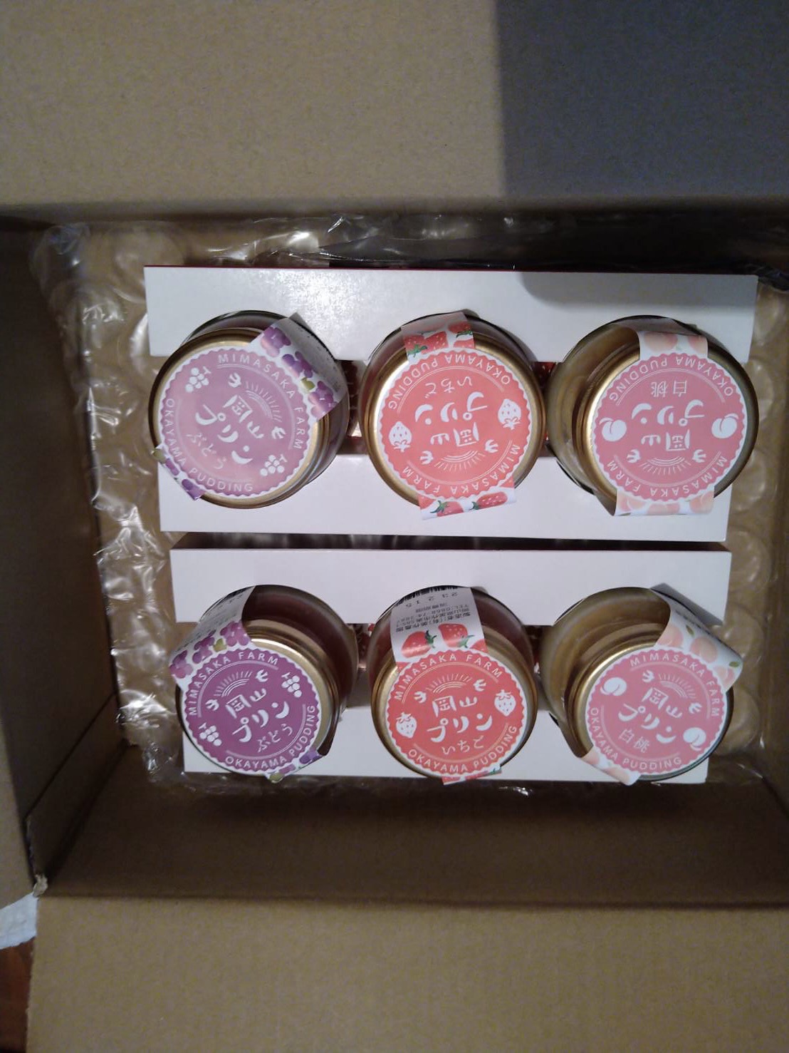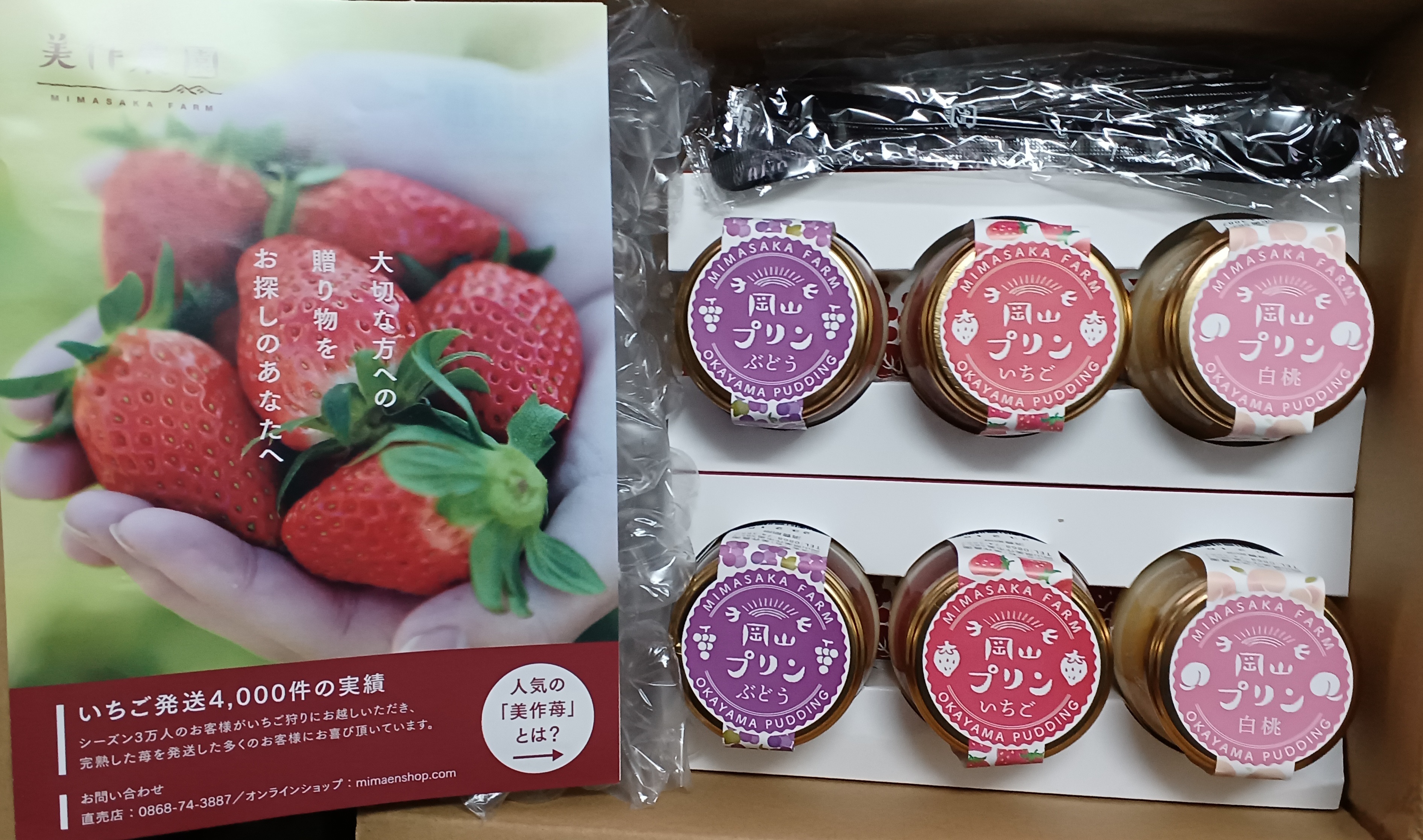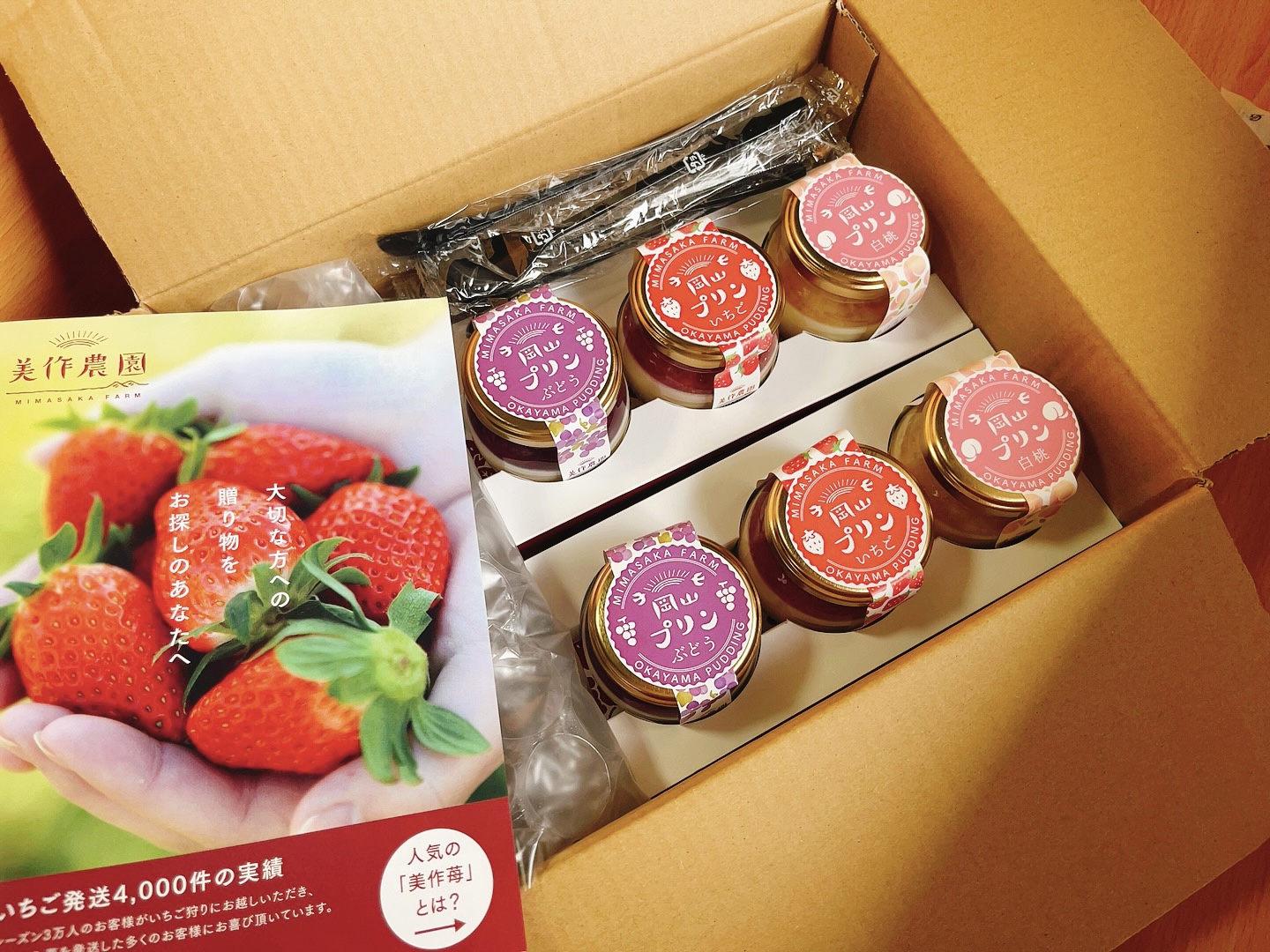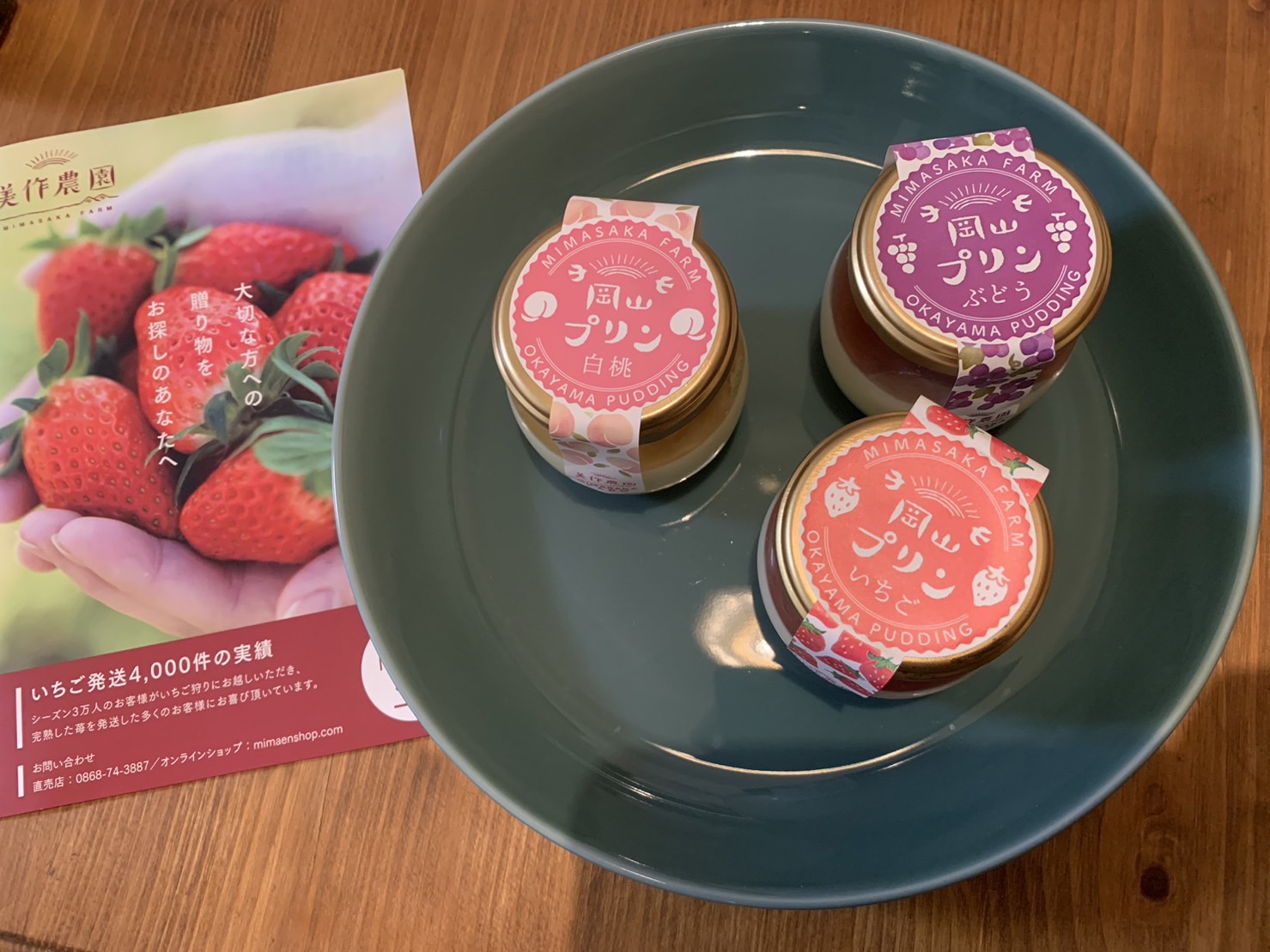 岡山県の観光農園で収穫したフルーツや、岡山県産のこだわり食材を使用した「フルーツプリン」です。フルーツ王国・岡山のいちごとぶどう、白桃で作ったジュレは、果肉たっぷりでジューシー。プリンは県内の養鶏場から赤鶏のもみじ卵、蒜山ジャージー牛乳を使用し、濃厚でなめらかな食感です。フルーツの酸味と甘みを感じるジュレと、滑らかなプリン、ほろ苦いカラメルとの相性は抜群。可愛らしいパッケージなので手土産スイーツとしてもおすすめです。