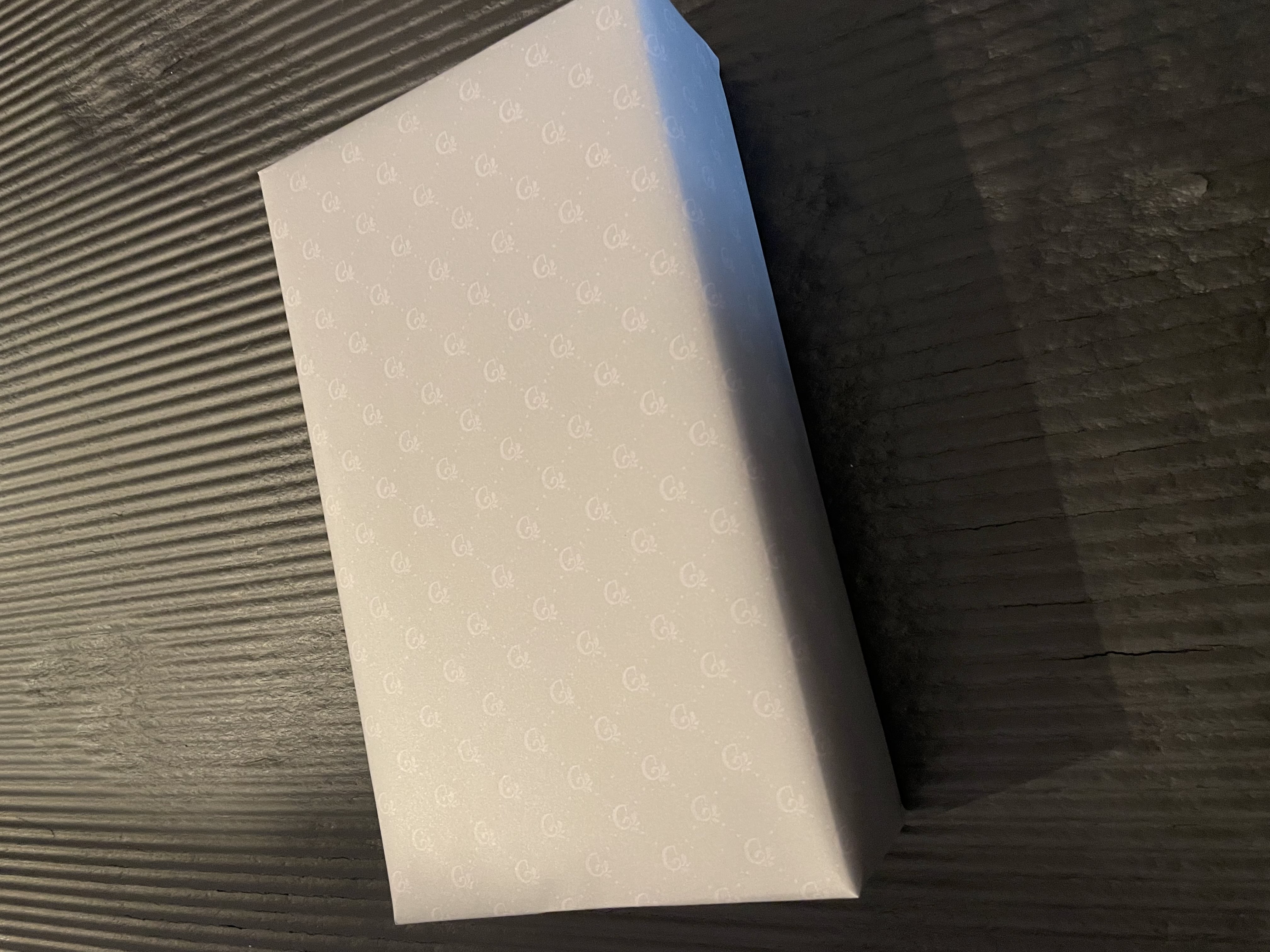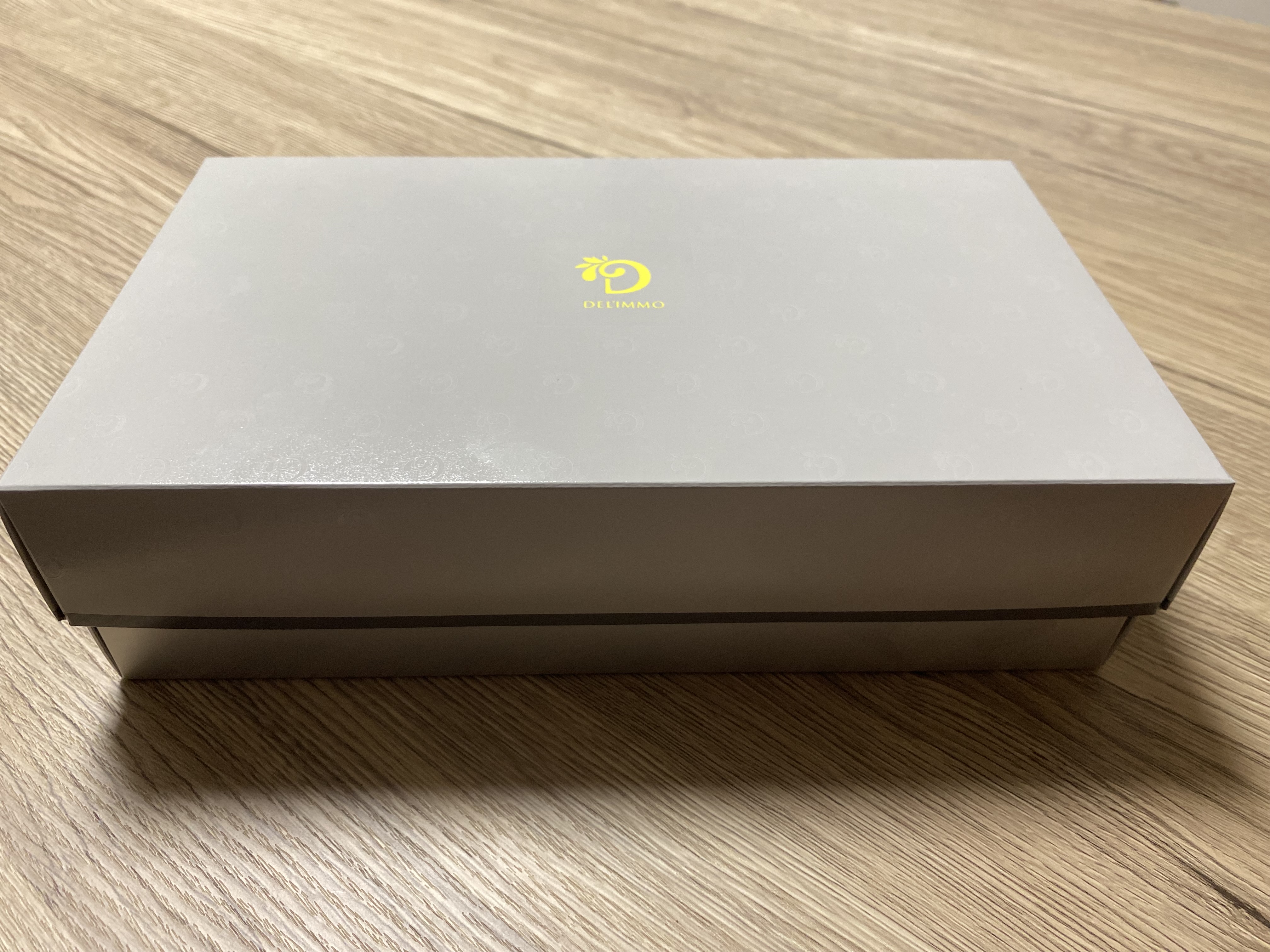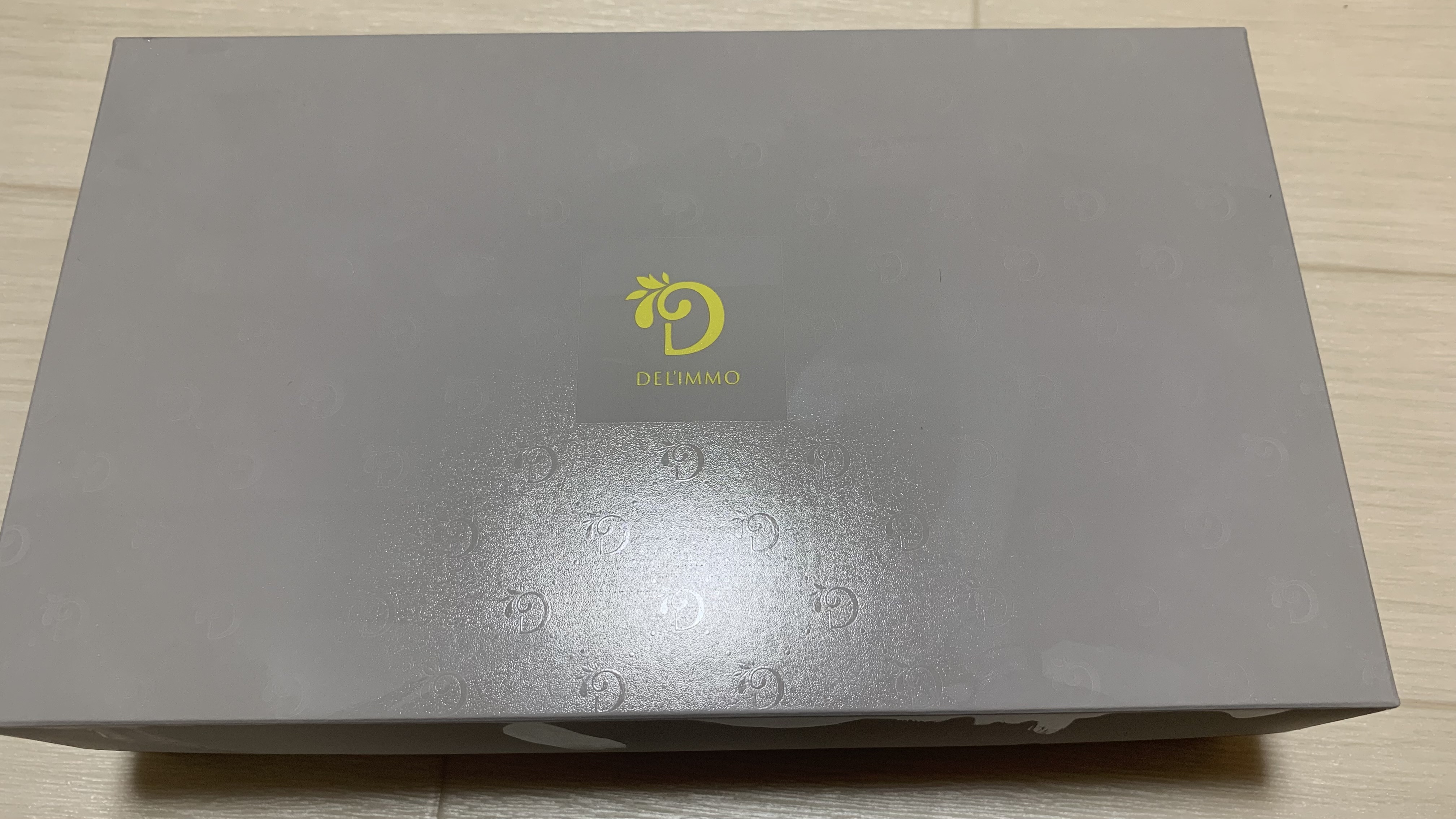デリーモカラーのグレーとグリーンを基調にした、シックでシンプルなお包みでお届けします。