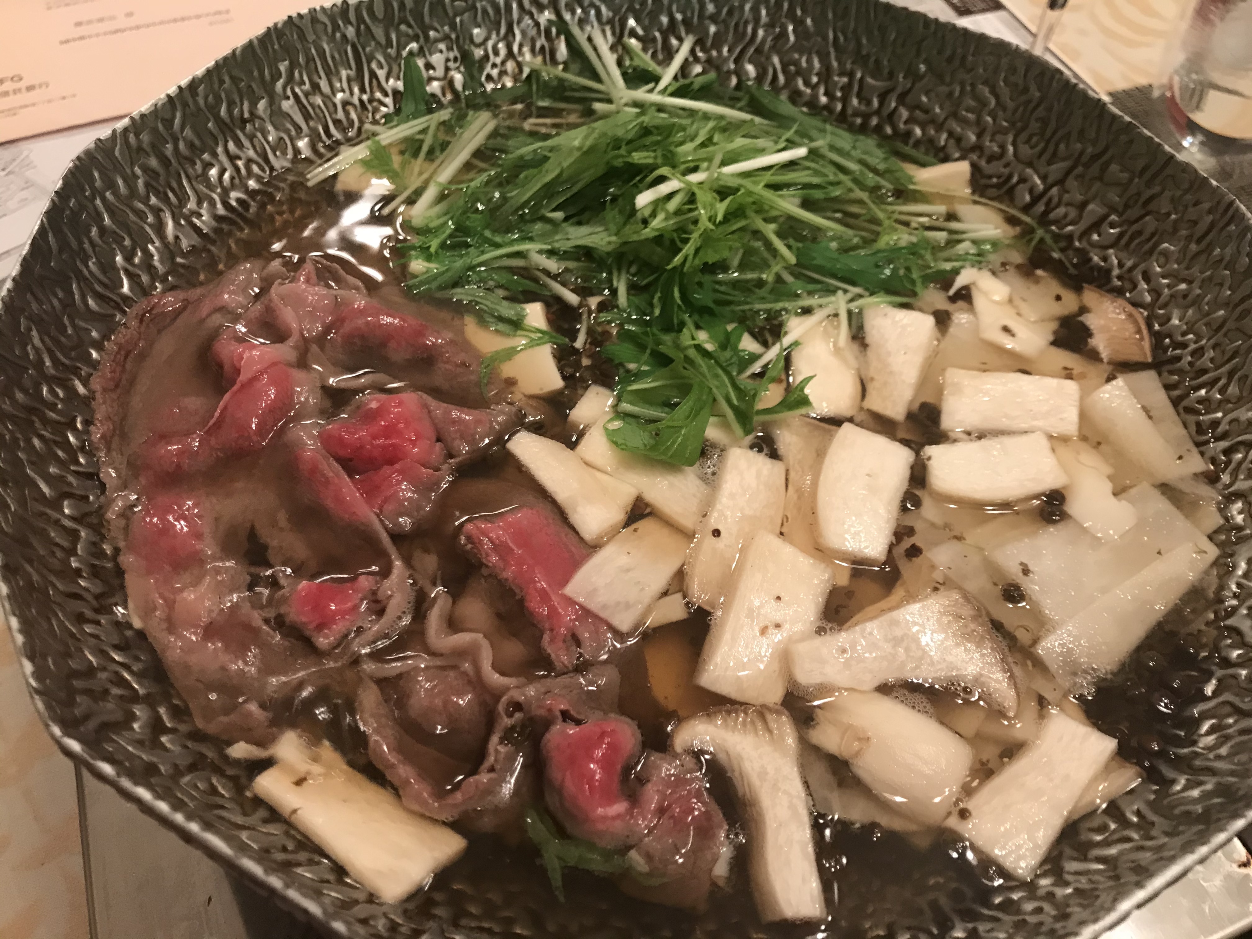 しゃぶしゃぶ用のお肉なので、さっとお湯でくぐらせ、脂を落とすようにしていただきました。