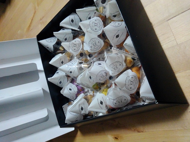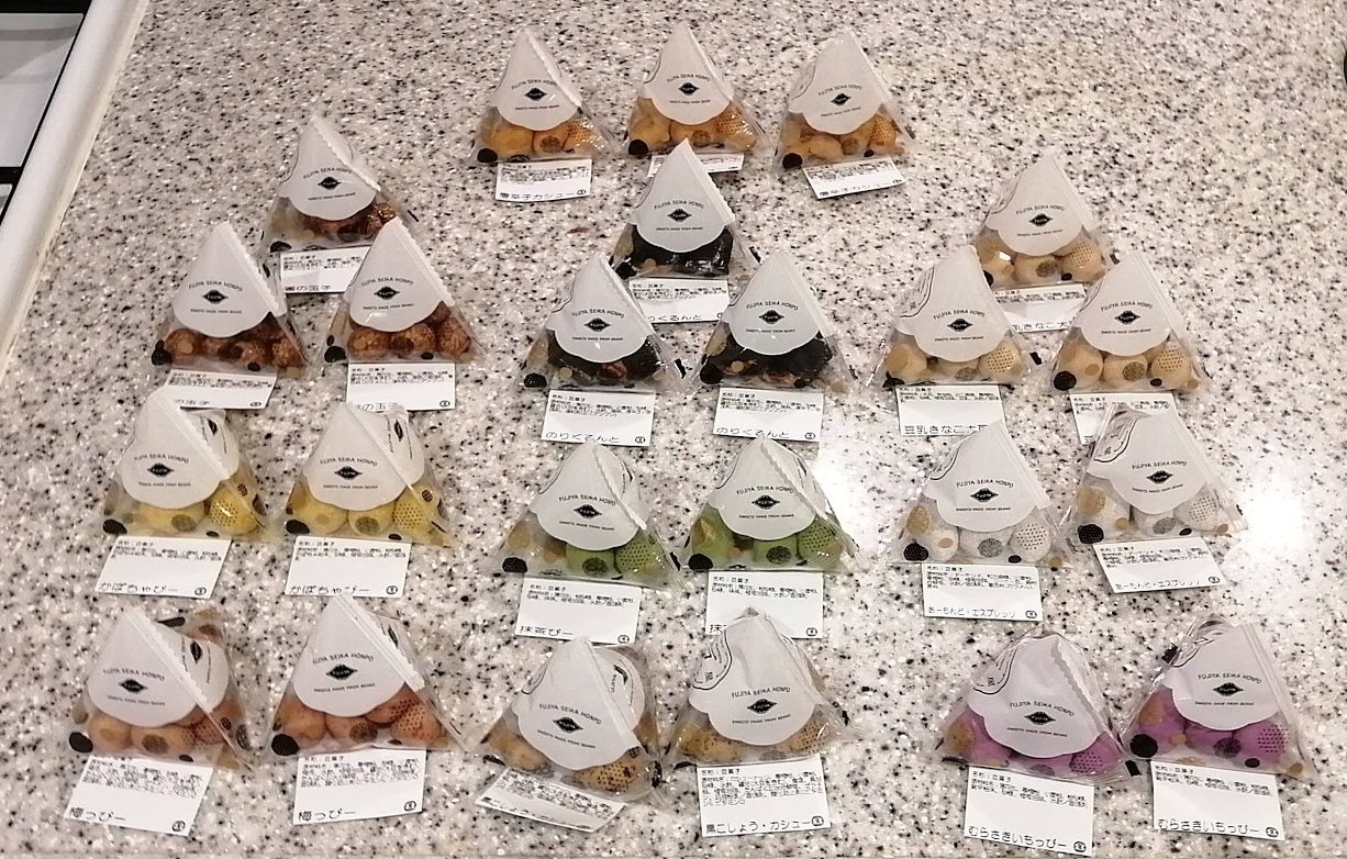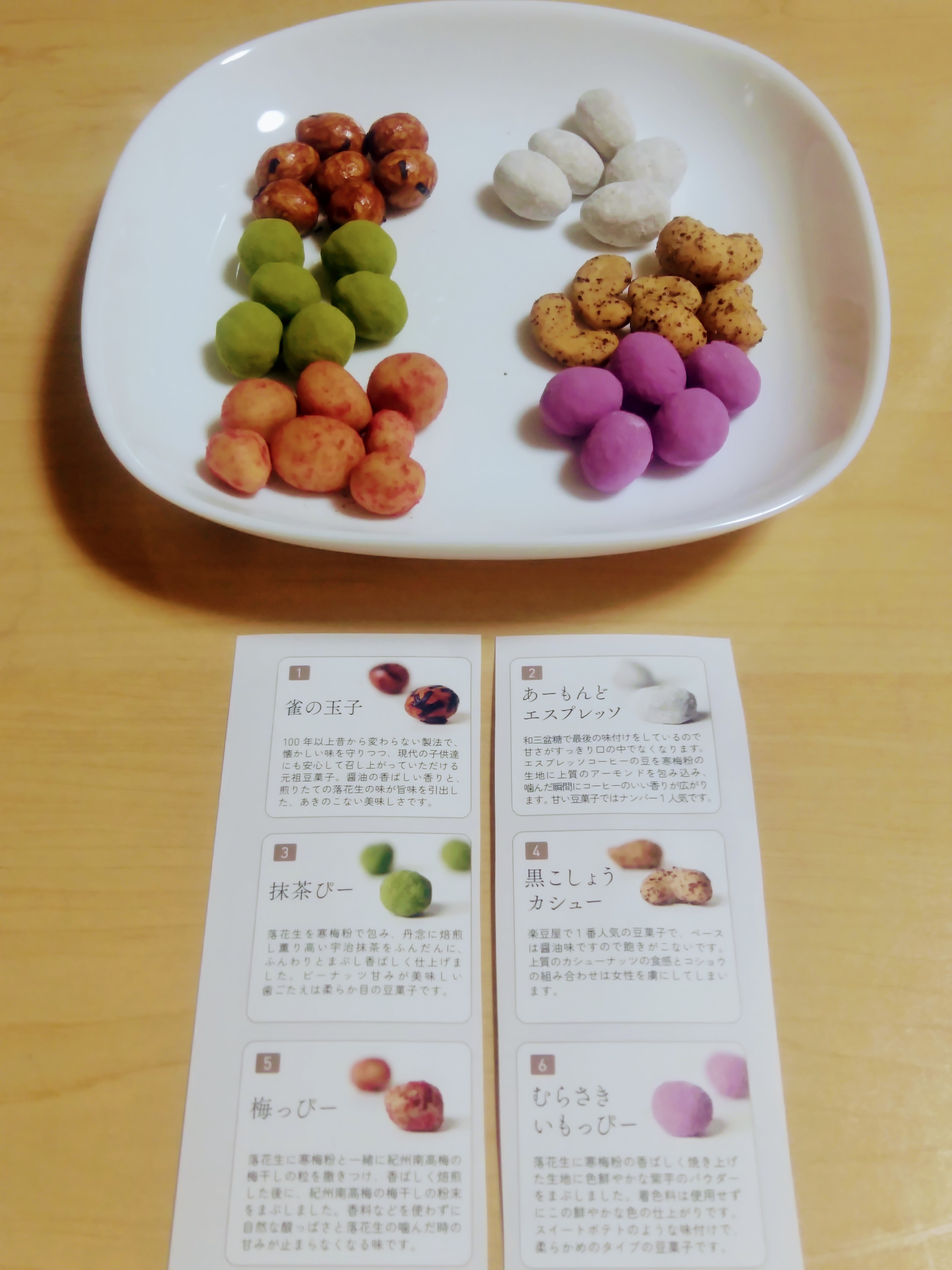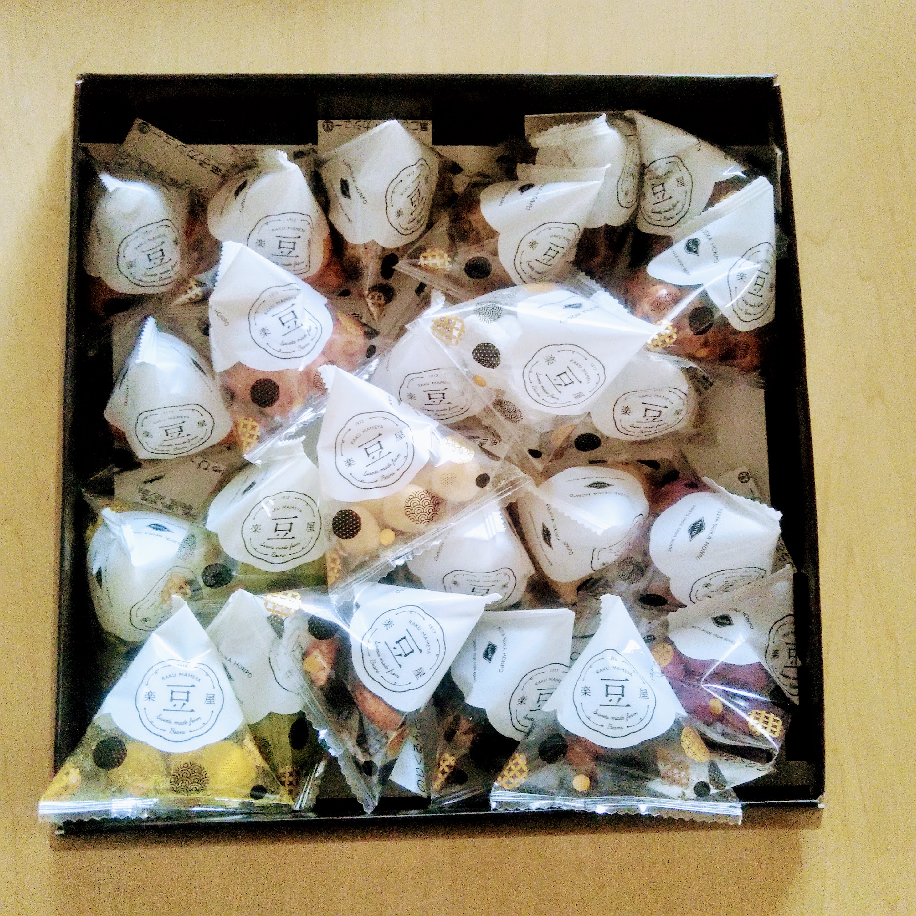 個包装な点もこのご時世うれしいポイントです。10種類の豆菓子が24個入っているのですが、一つ一つに何味かを描いた紙が貼られているので、「これはなに味?」と迷うことはありません。