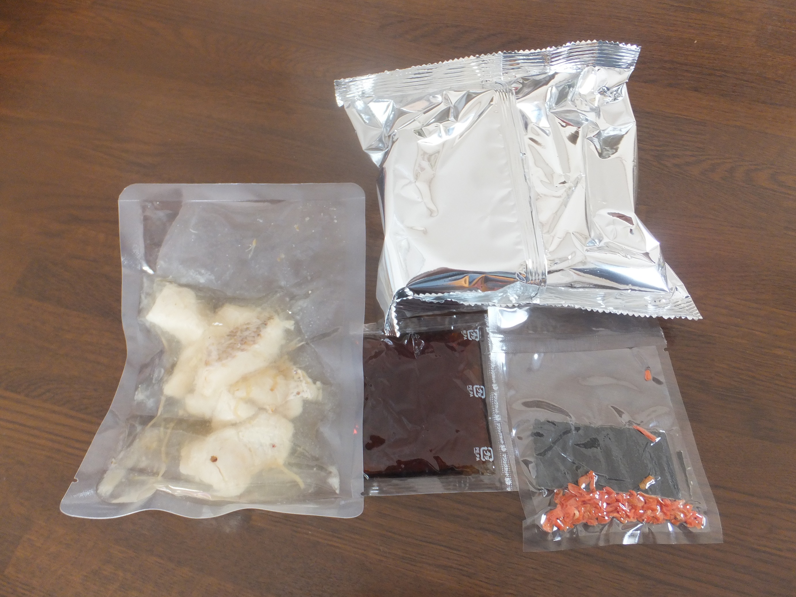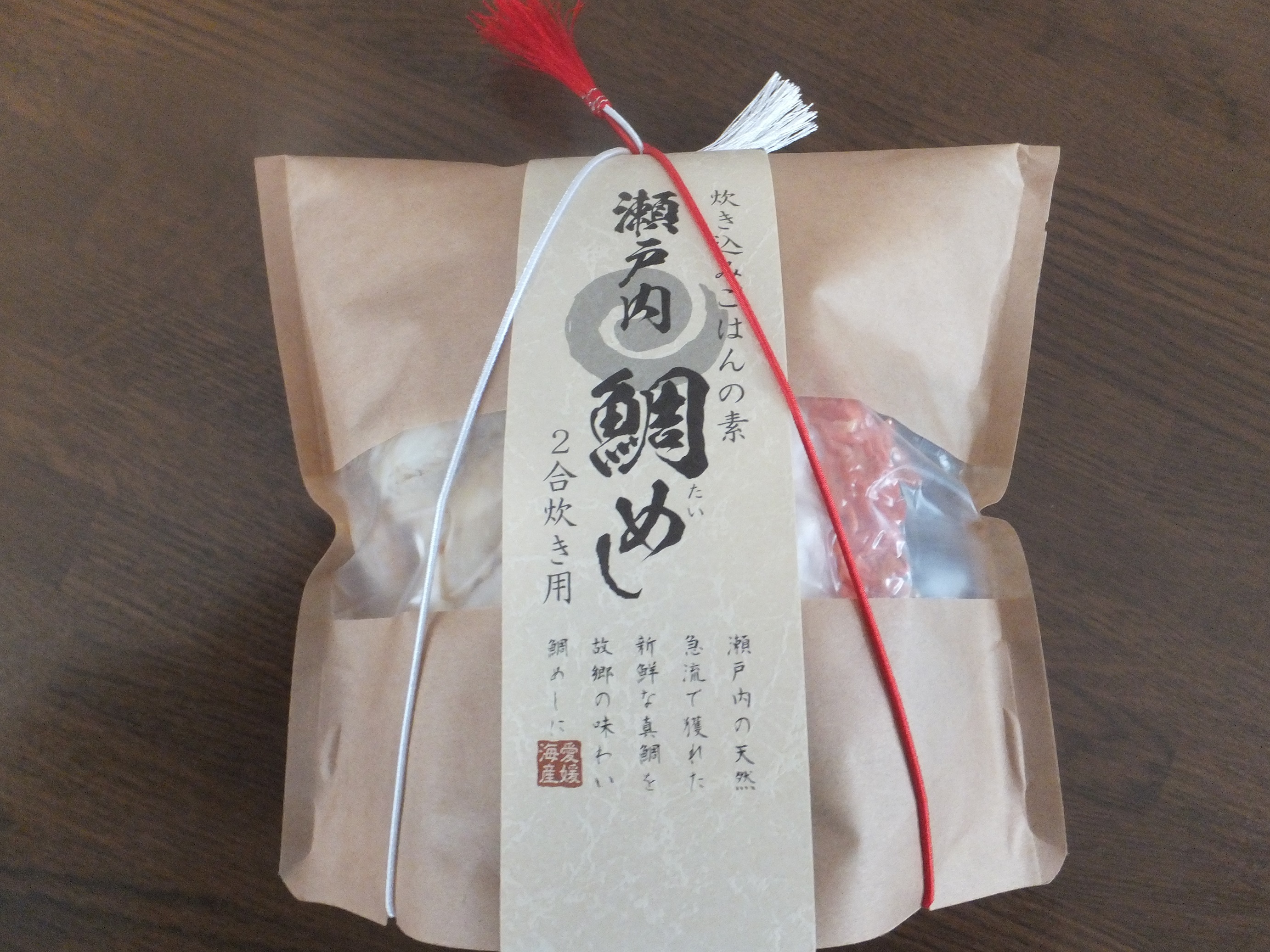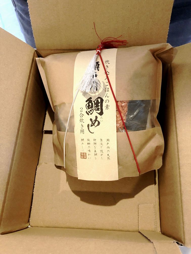「鯛めし」のセットは、希望の日時に到着。段ボール箱の中に、紅白の紐が掛った鯛めしのパッケージが入っていました。紅白の紐が華やかに感じました。パッケージの中には、焼いた鯛の身、昆布とニンジン、銀色の目立つパッケージの中には、伊予名産の松山あげが入っていました。後は、タレです。