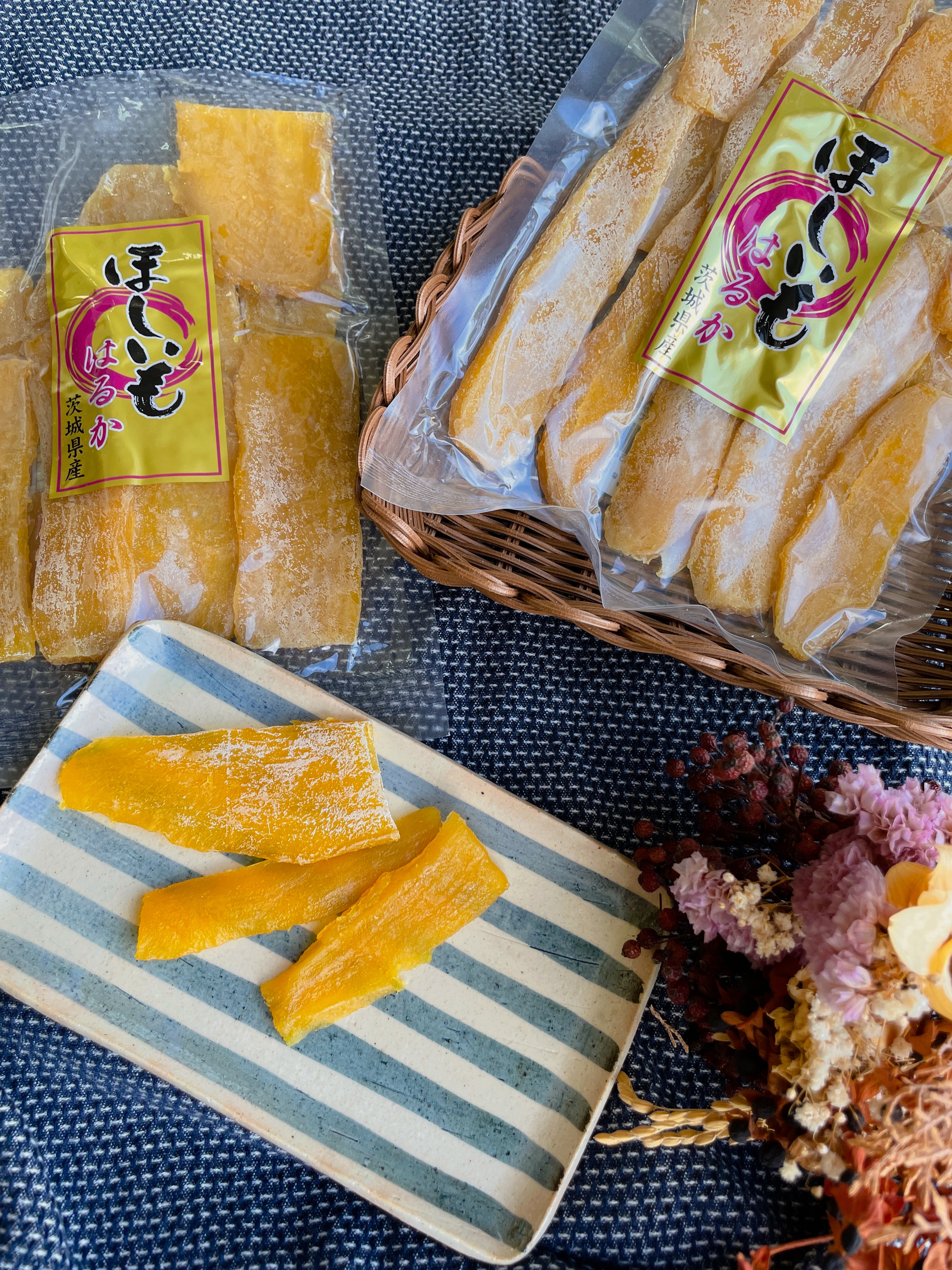 茨城県産紅はるかを使用した無添加・無着色の「干し芋」です。紅はるかは、蜜芋と呼ばれるほど上品な甘さ、柔らかい食感が特徴。干し芋独特の、ねっとりとした優しい甘みと、むっちりとした食感がたまりません。干し芋の全国シェア率9割を誇る、茨城を代表するソウルフード。ヘルシーなおやつや間食としても老若男女問わずおすすめです。