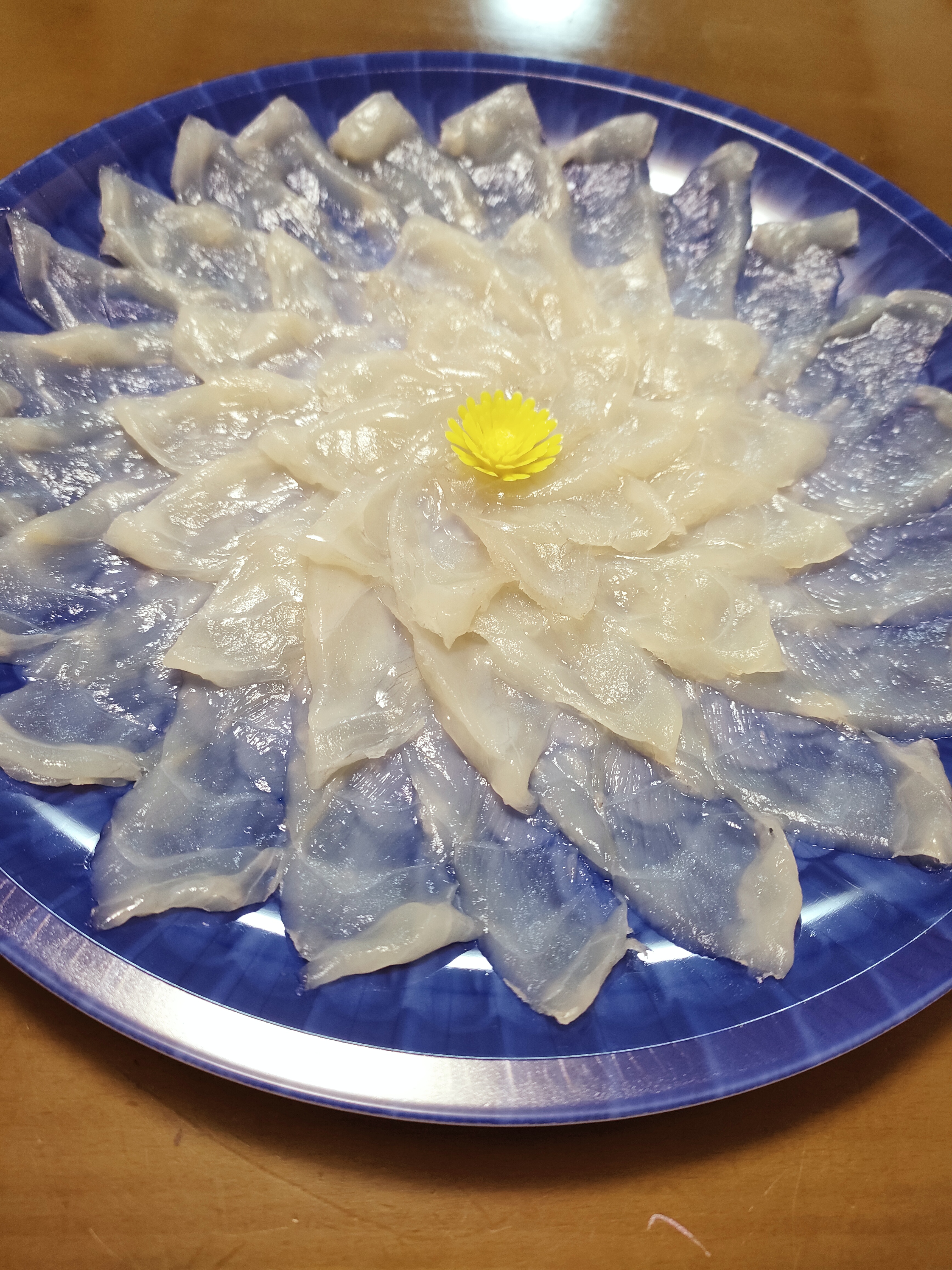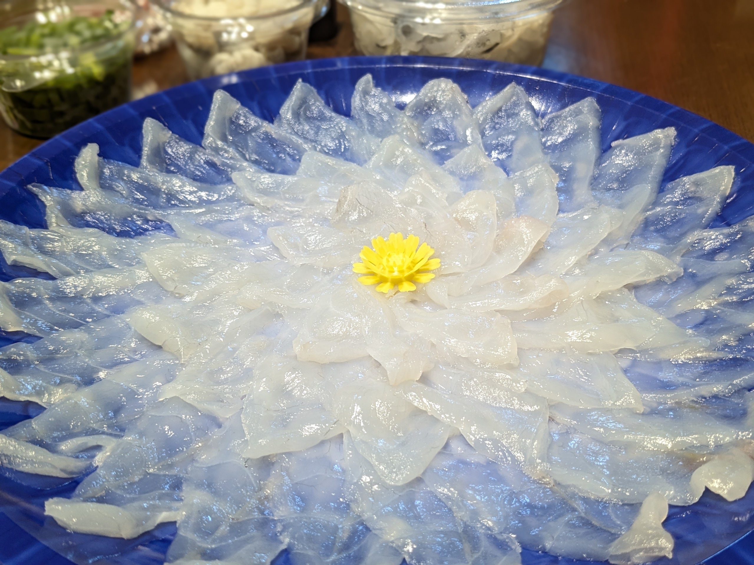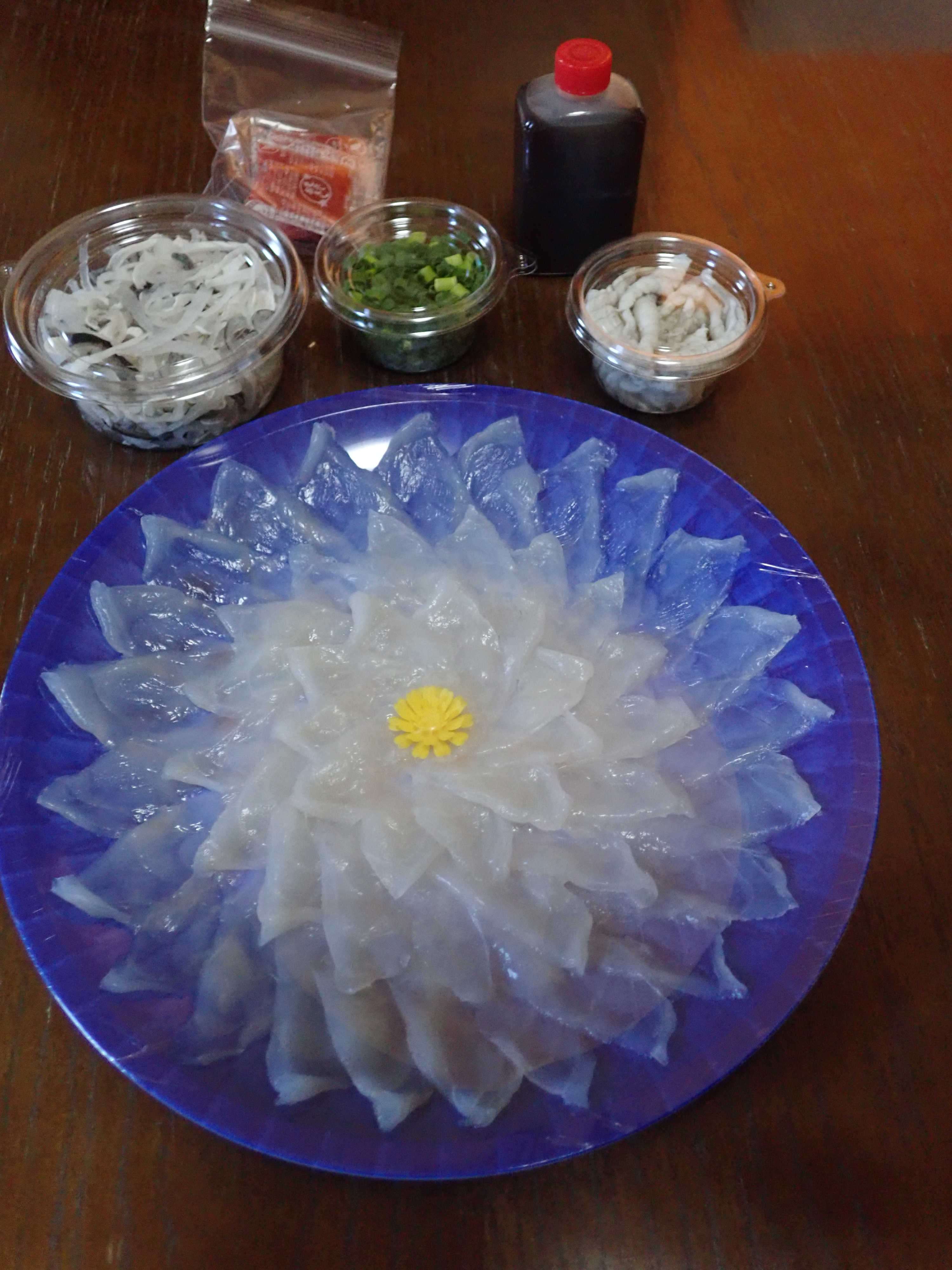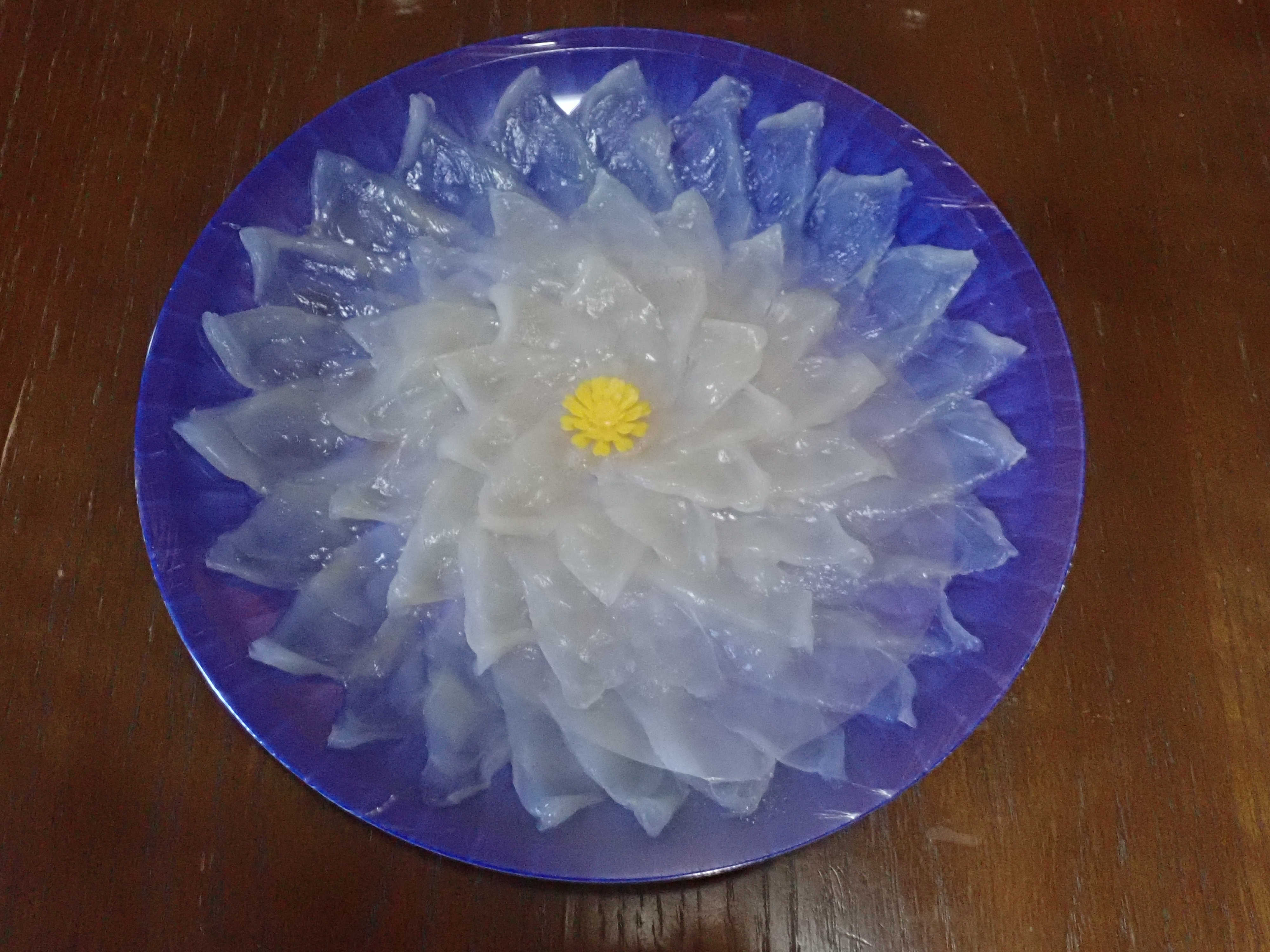 綺麗なブルーの容器が透けて見える薄造りは、薄いのにしっかりと弾力があって、ぷりぷりの食感です。