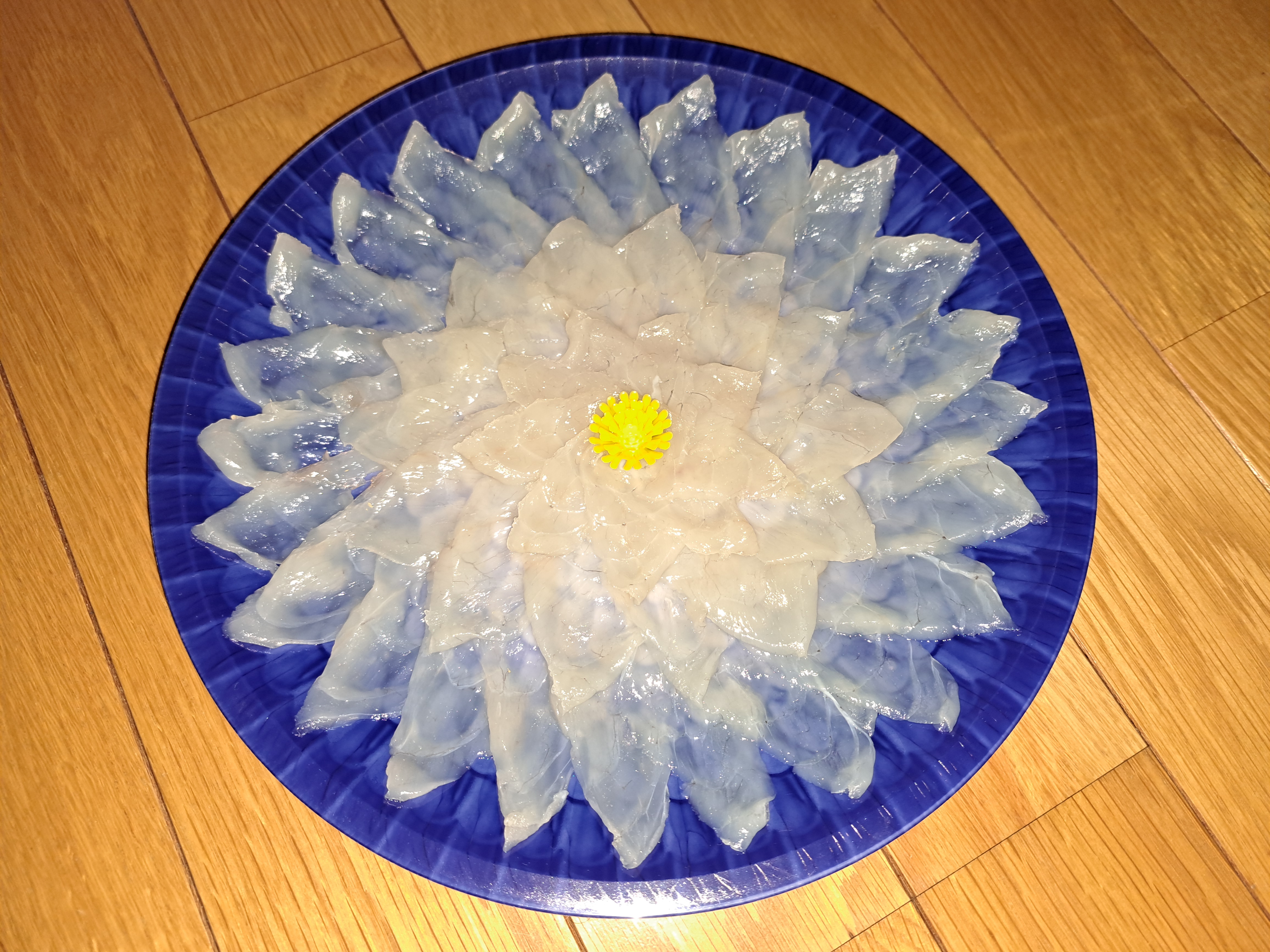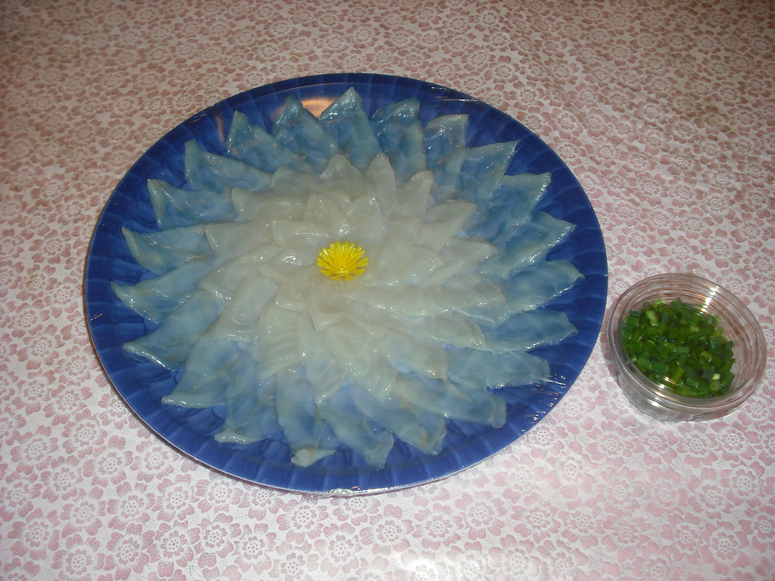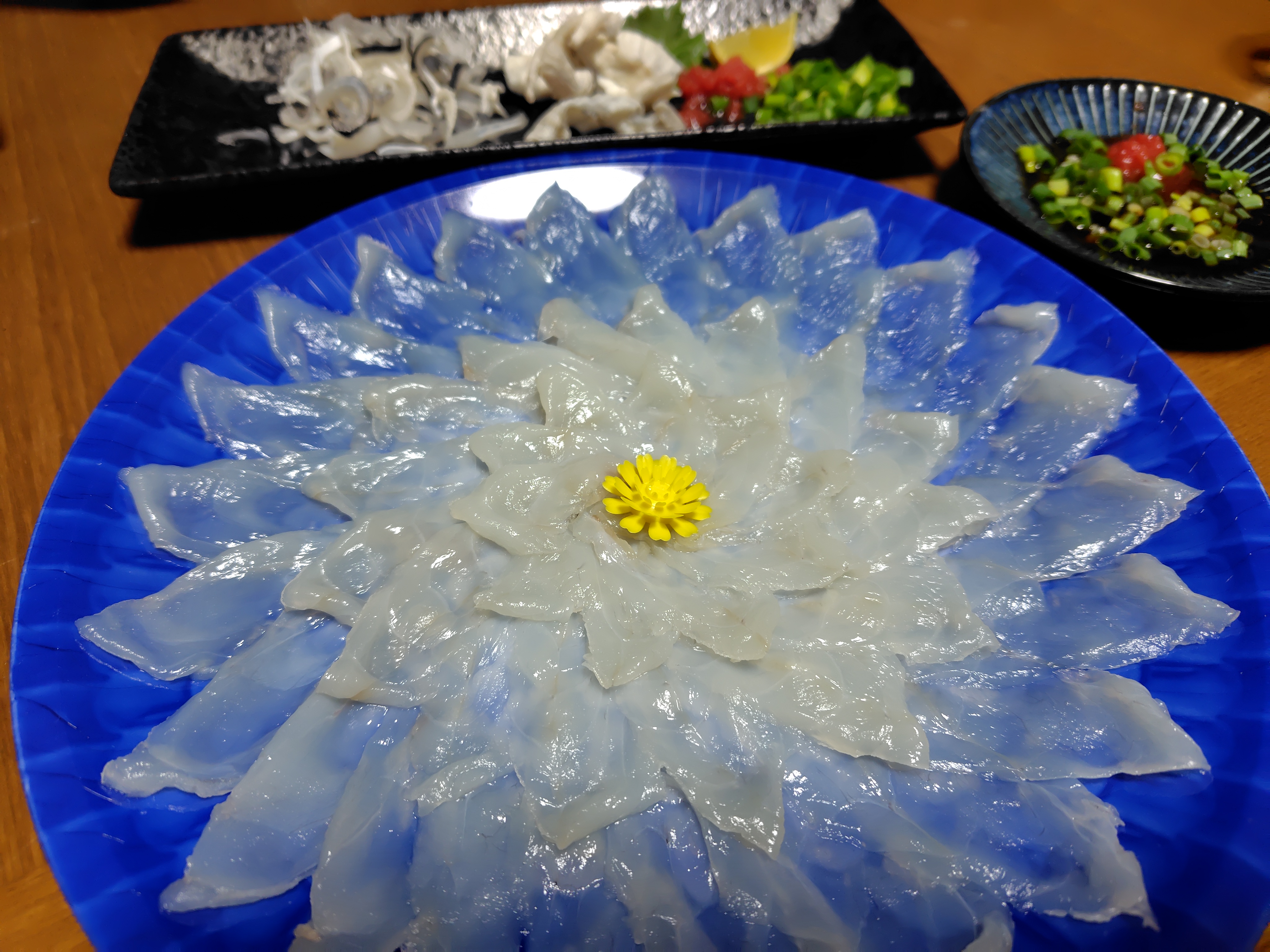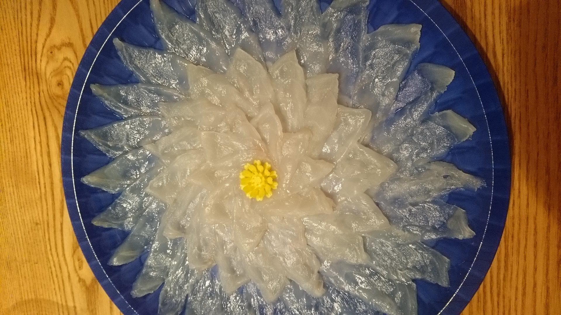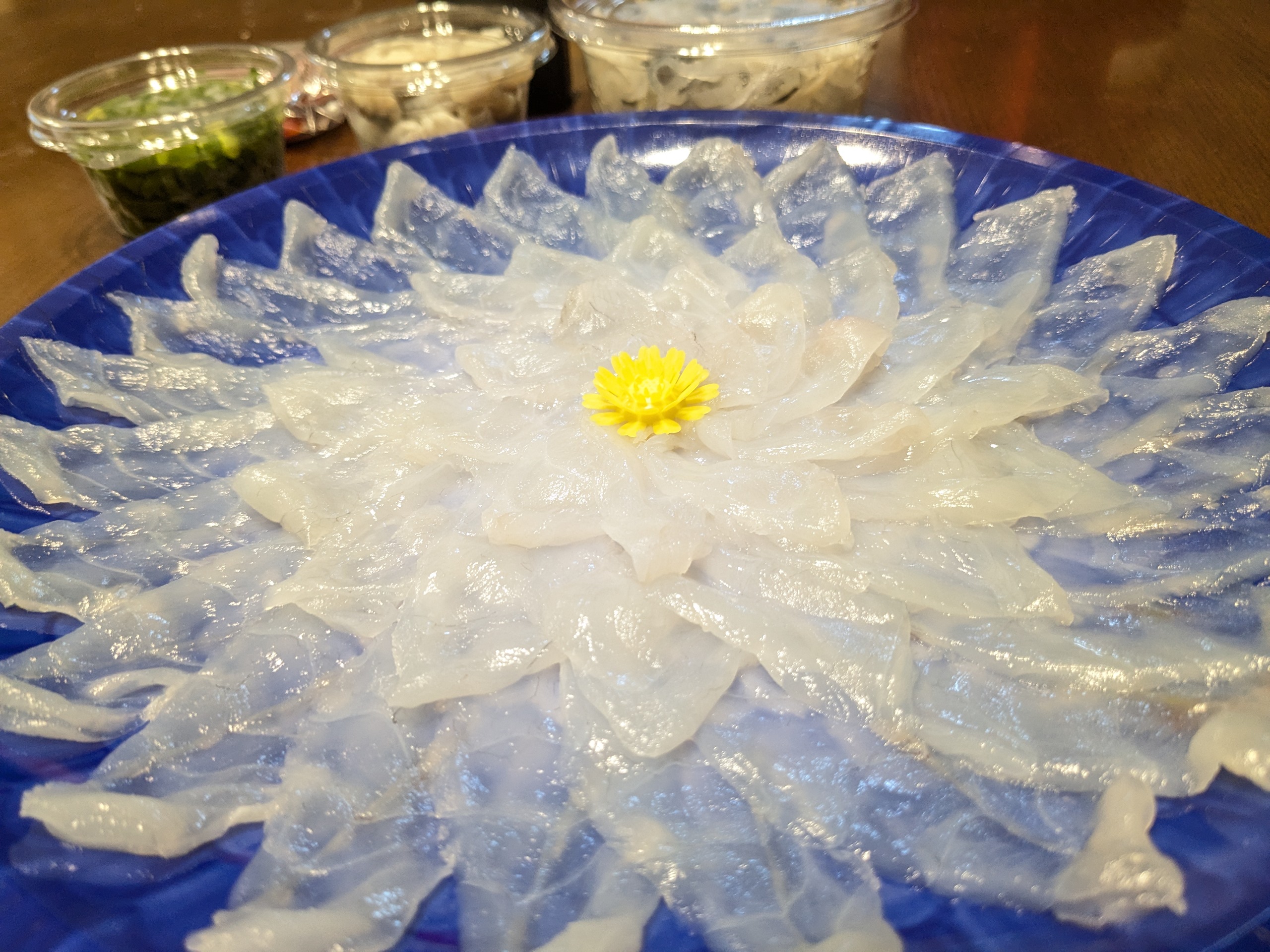 綺麗なブルーの容器が透けて見える薄造りは、薄いのにしっかりと弾力があって、ぷりぷりの食感です。