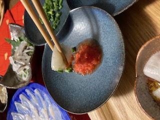 ふぐ1匹で、どのくらいの薄造りができるのでしょうか。そんなことを考えながらいただきました。