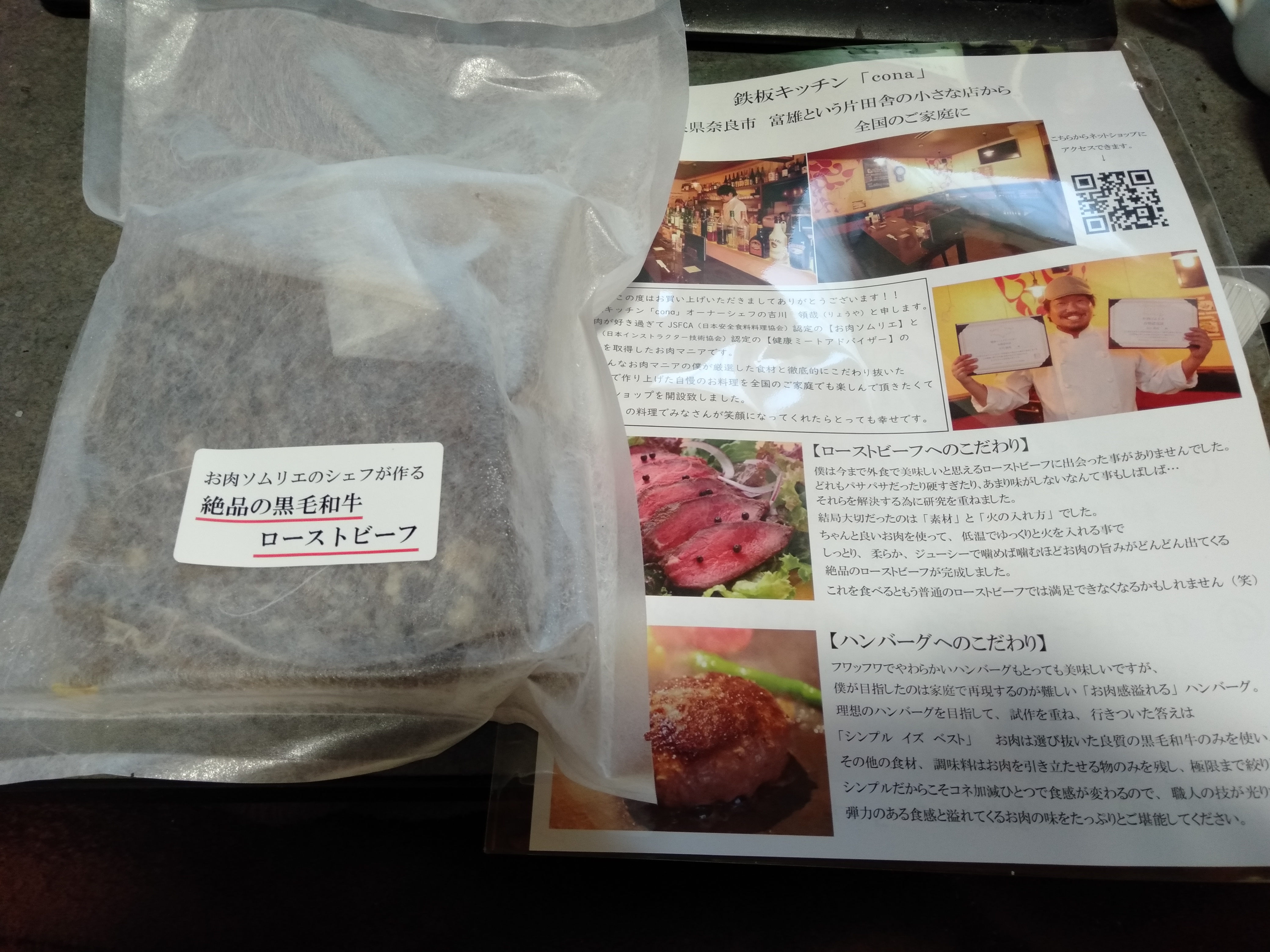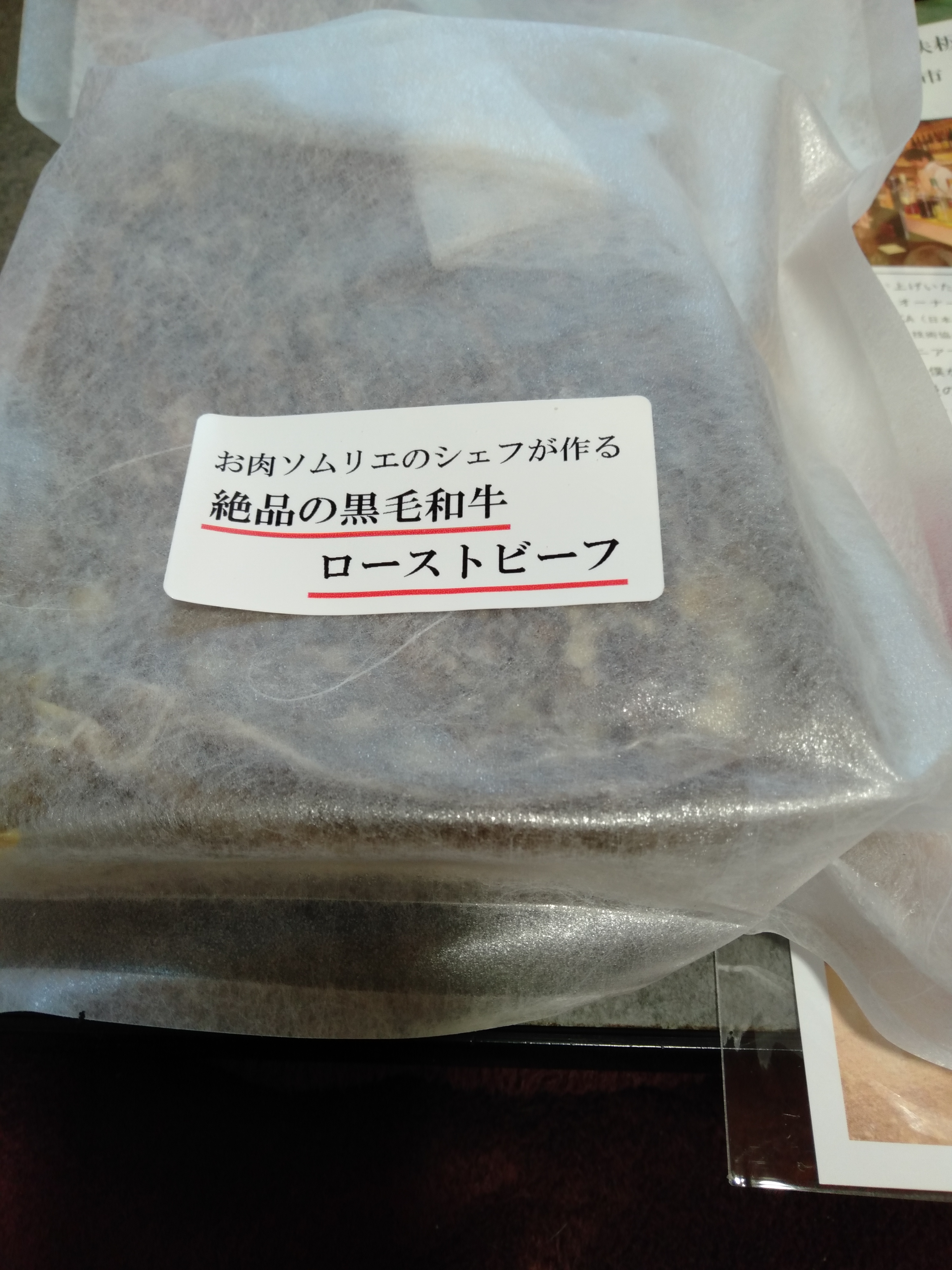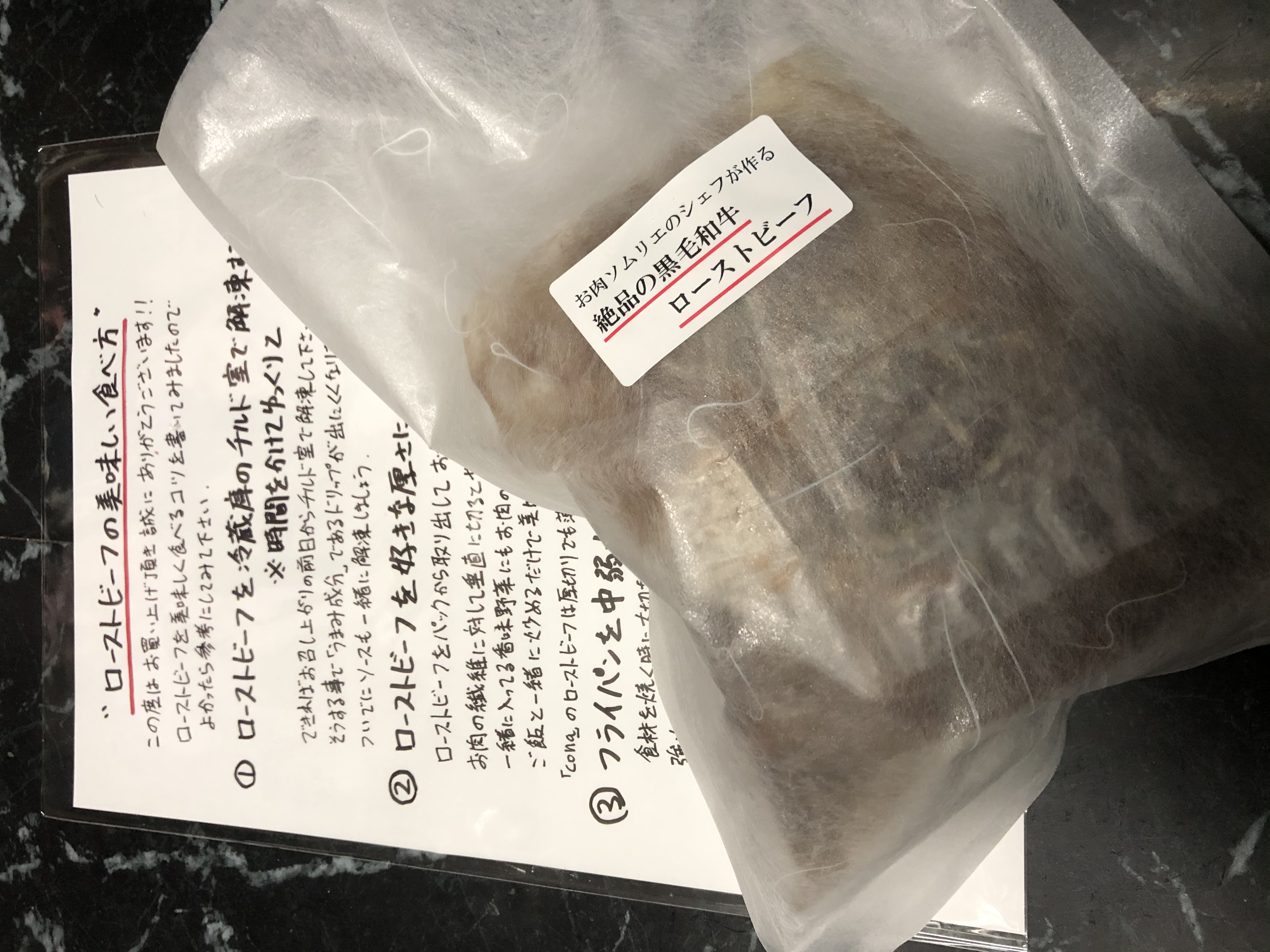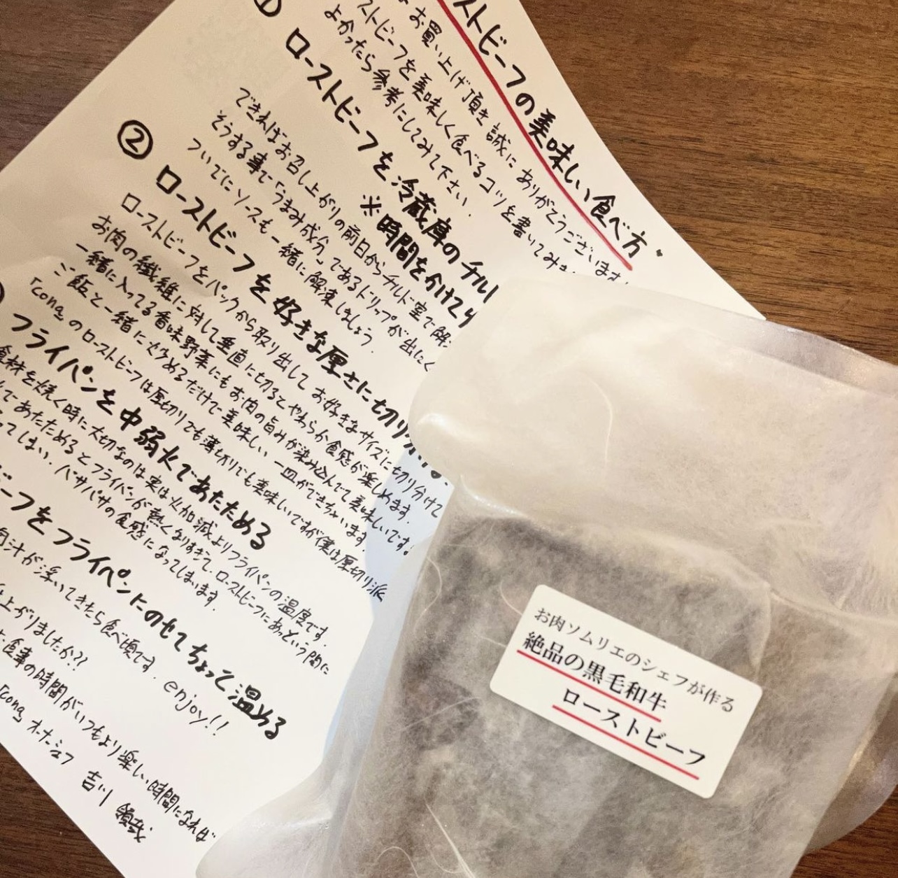商品と一緒にオーナーシェフから「ローストビーフの美味しい食べ方」の案内が入っています。