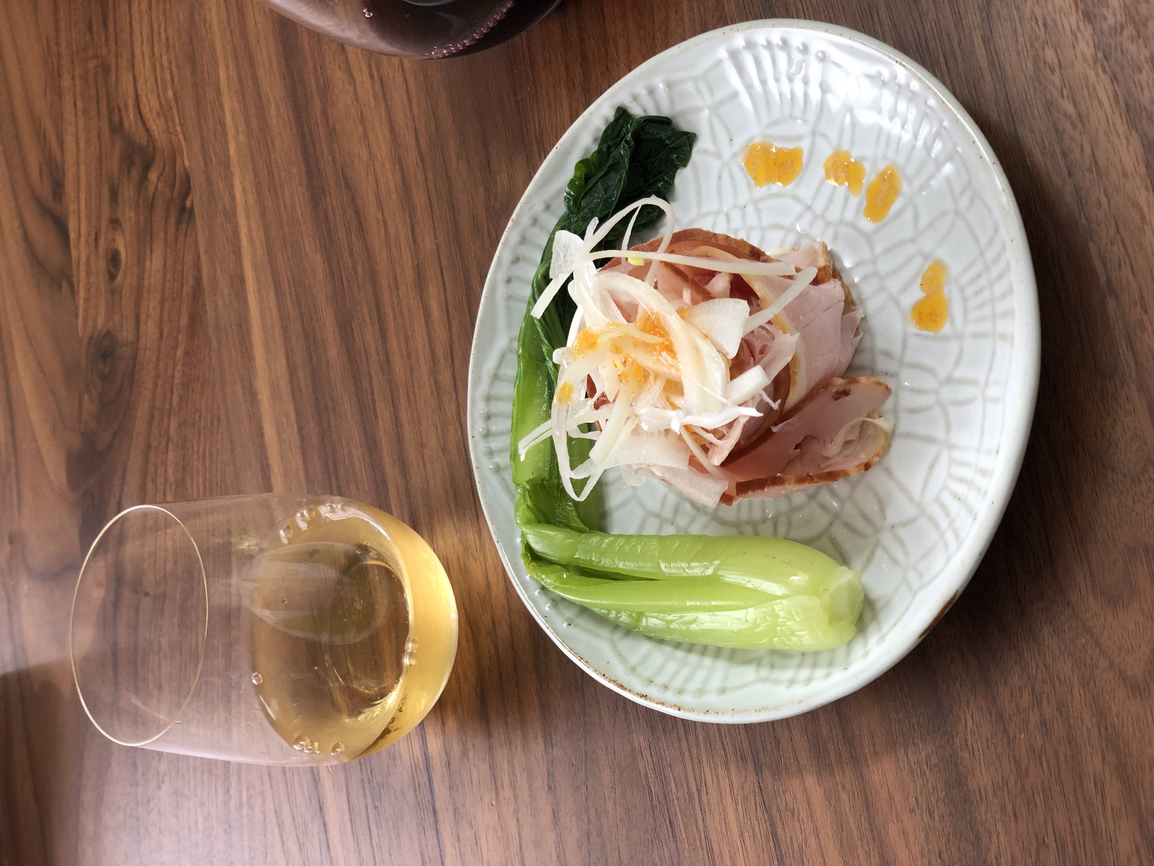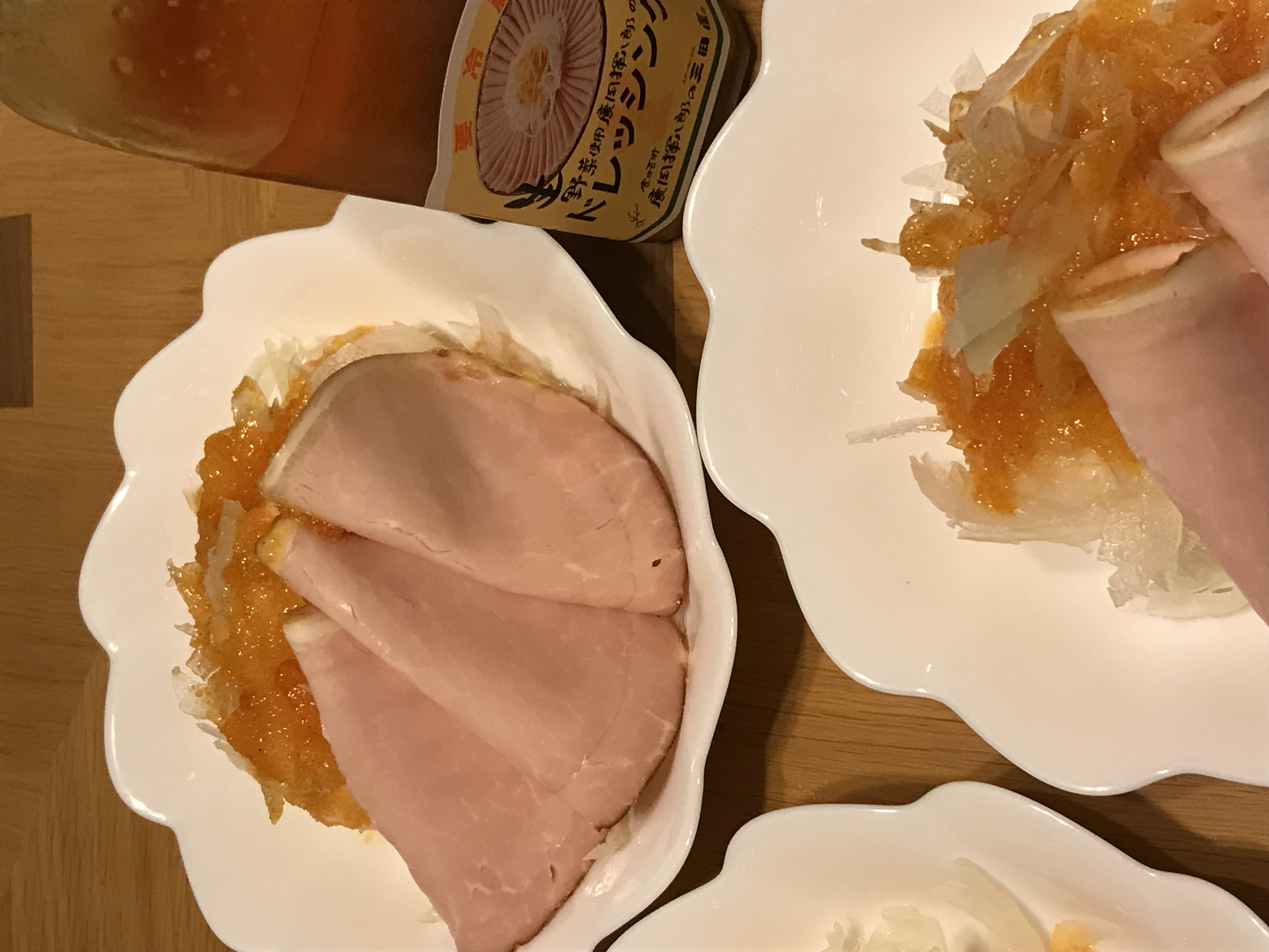 ハムはスライスした玉ねぎと一緒に付属のドレッシングをかけていただきました。ハムは香ばしく、しっとりしていて野菜が進む進む♪