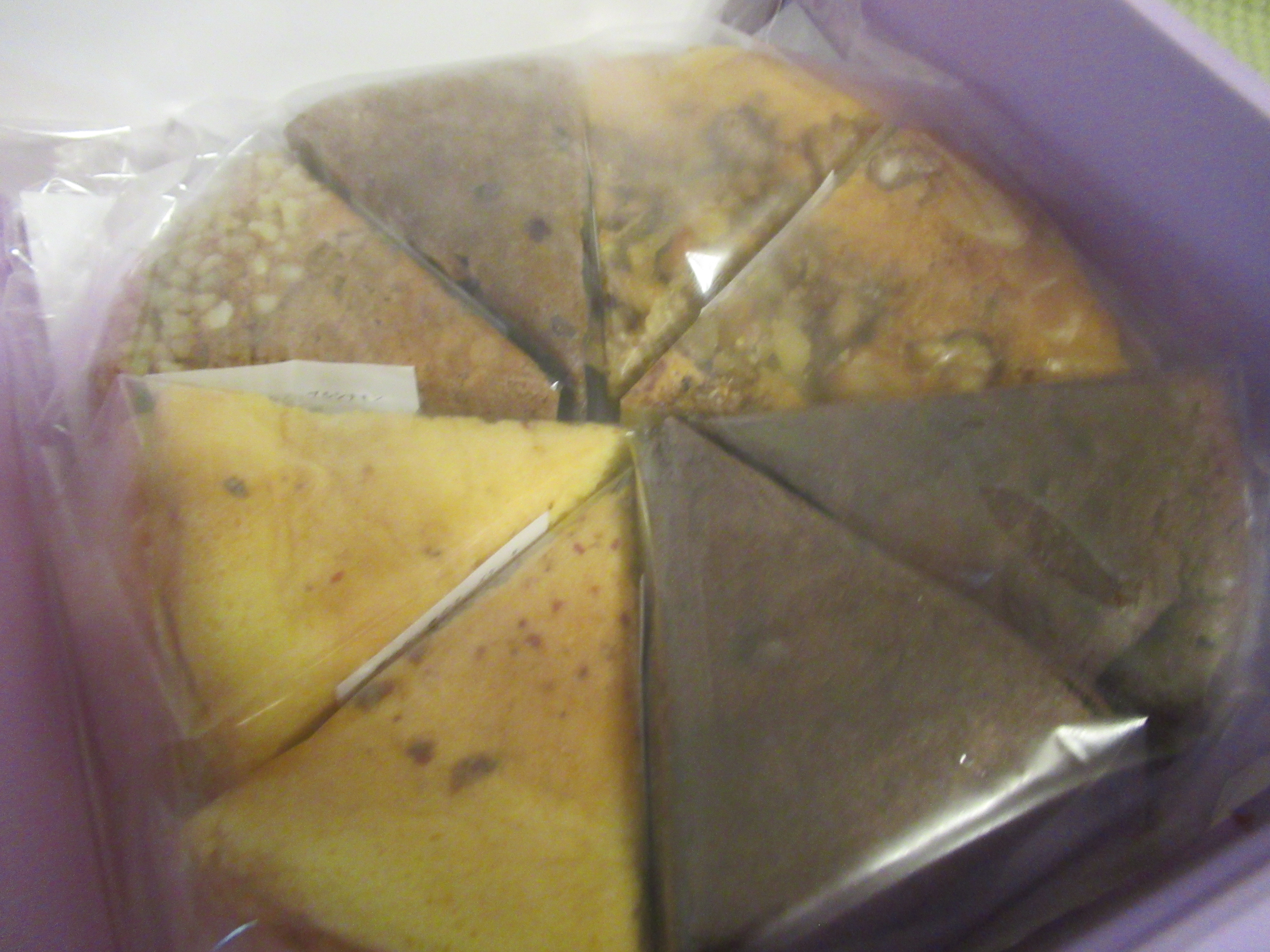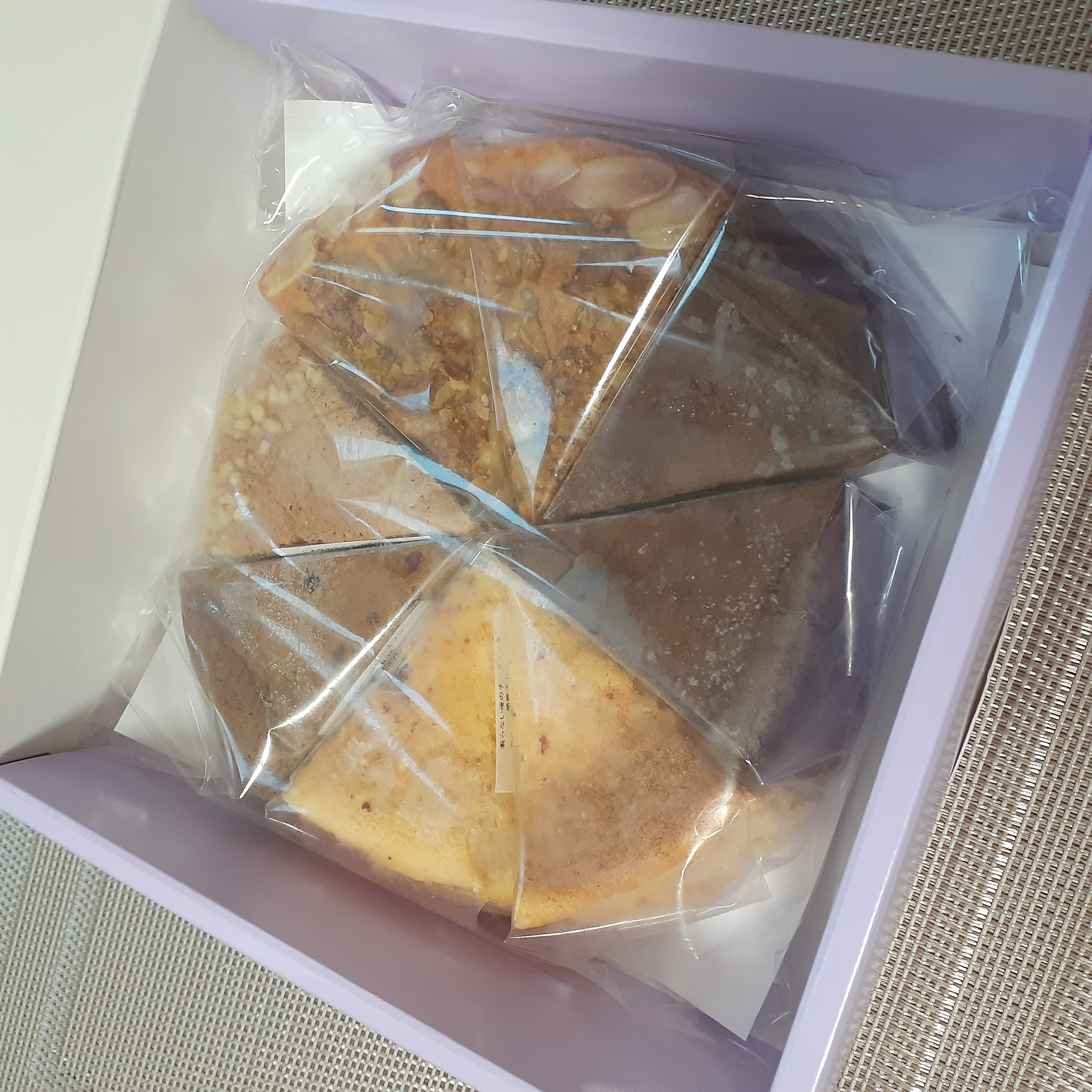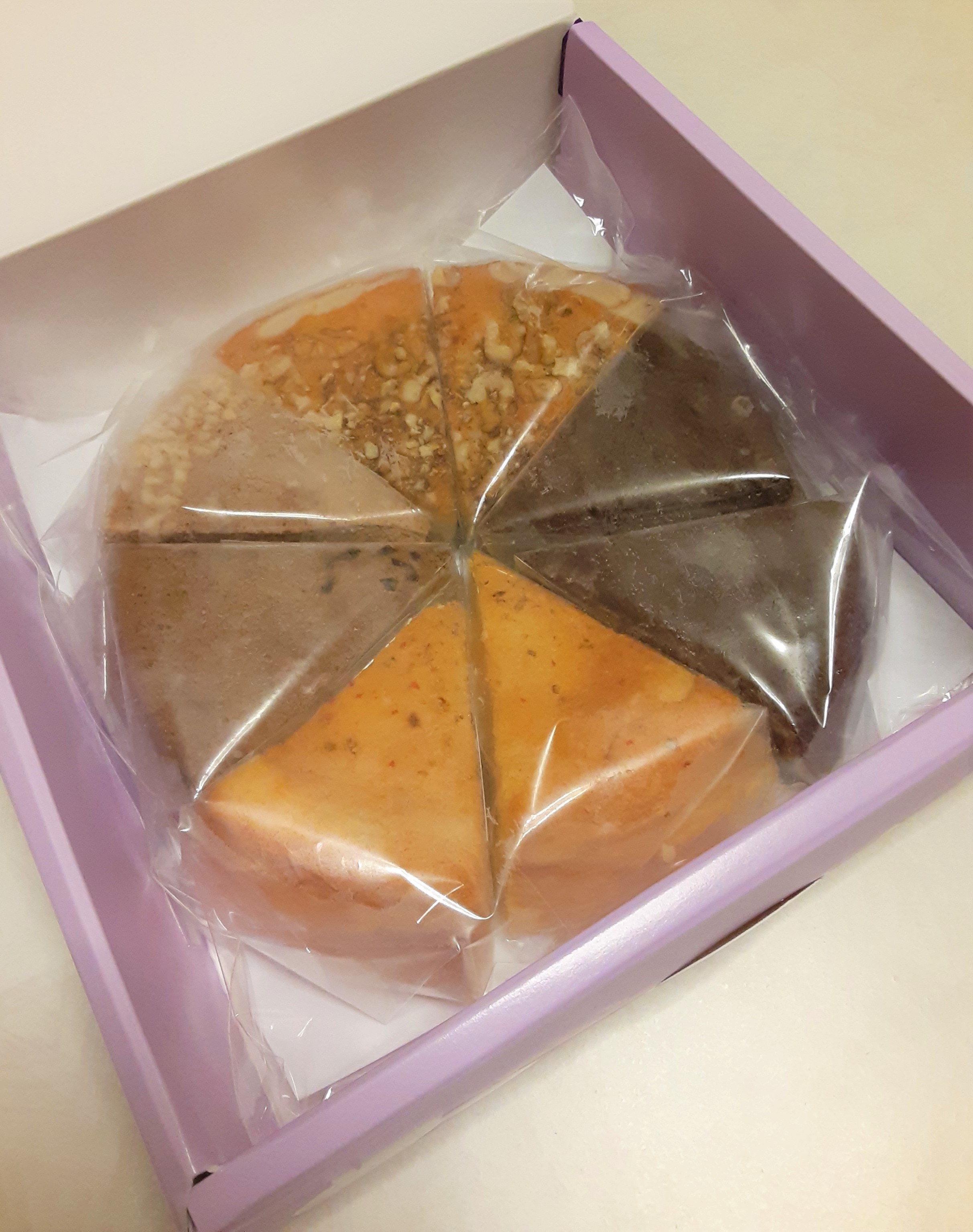 開けると5種類のケーキが合計8個入っており、いろいろな種類があるのは嬉しいです。また個包装になっており、切る手間がないのと有難いです。