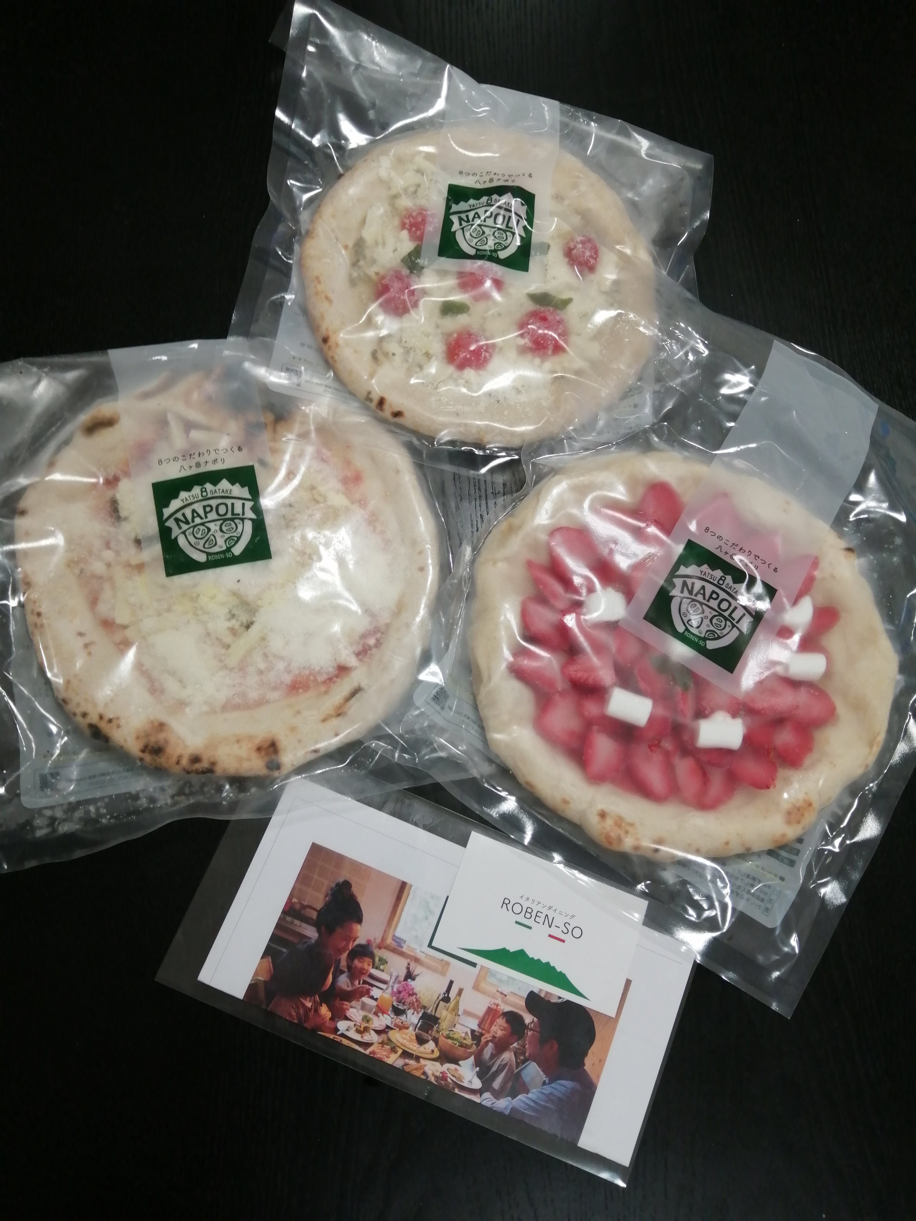 山梨県清里のイタリア料理店の「石窯ピッツァ」です。食材にもこだわり、八ヶ岳の美味しい水、八ヶ岳や山梨産の食材使用。低温で48時間かけて発酵、熟成した生地を職人が手で伸ばして成型、450℃以上の高温の石窯で丁寧に焼き上げました。生地とソース、チーズの美味しさをダイレクトに感じることができる「マルゲリータ」に、ミニトマトを使ったシンプルな「ビアンカ」、〆は「いちご」はドルチェピッツァ。異なる味わいのセットなので、老若男女楽しめます。
