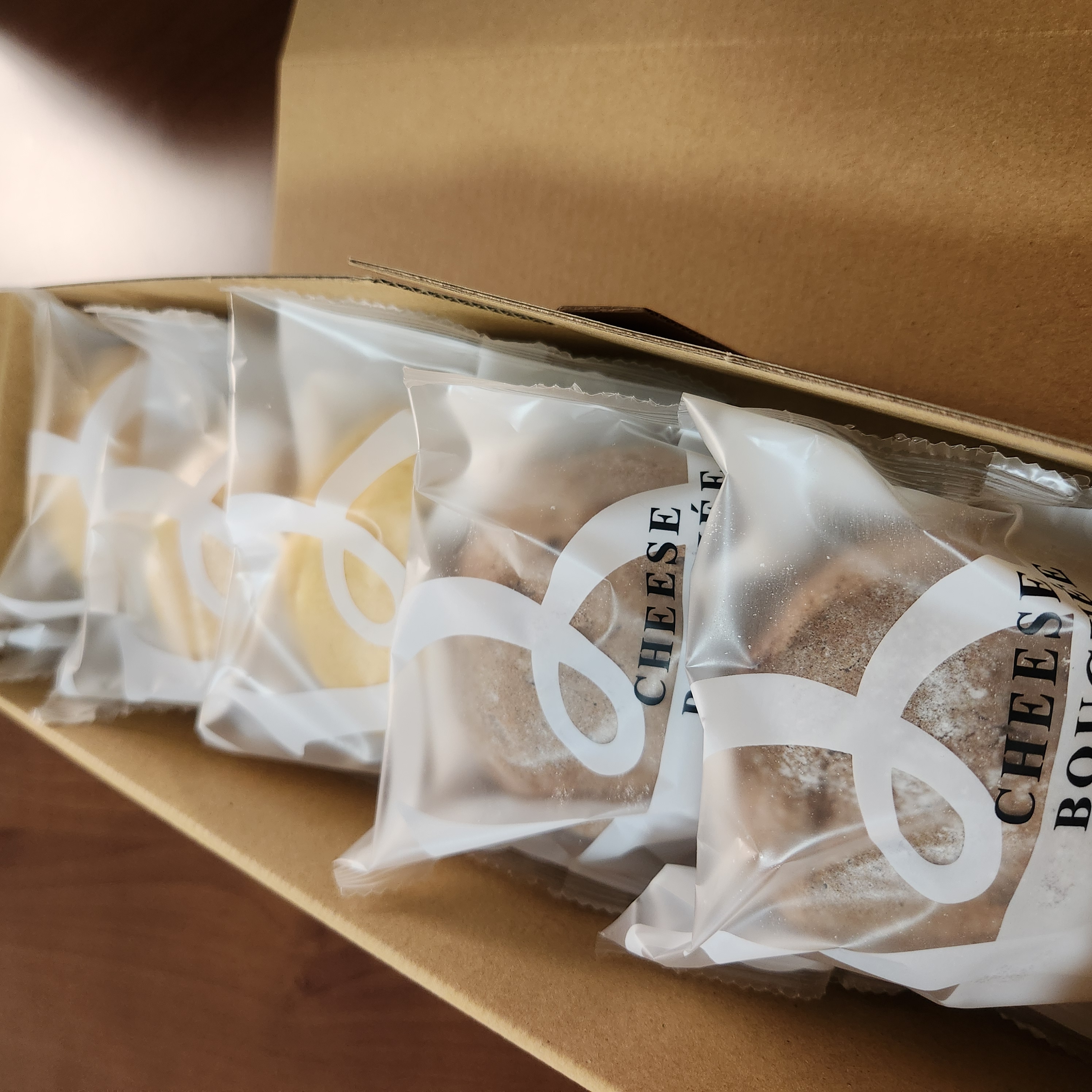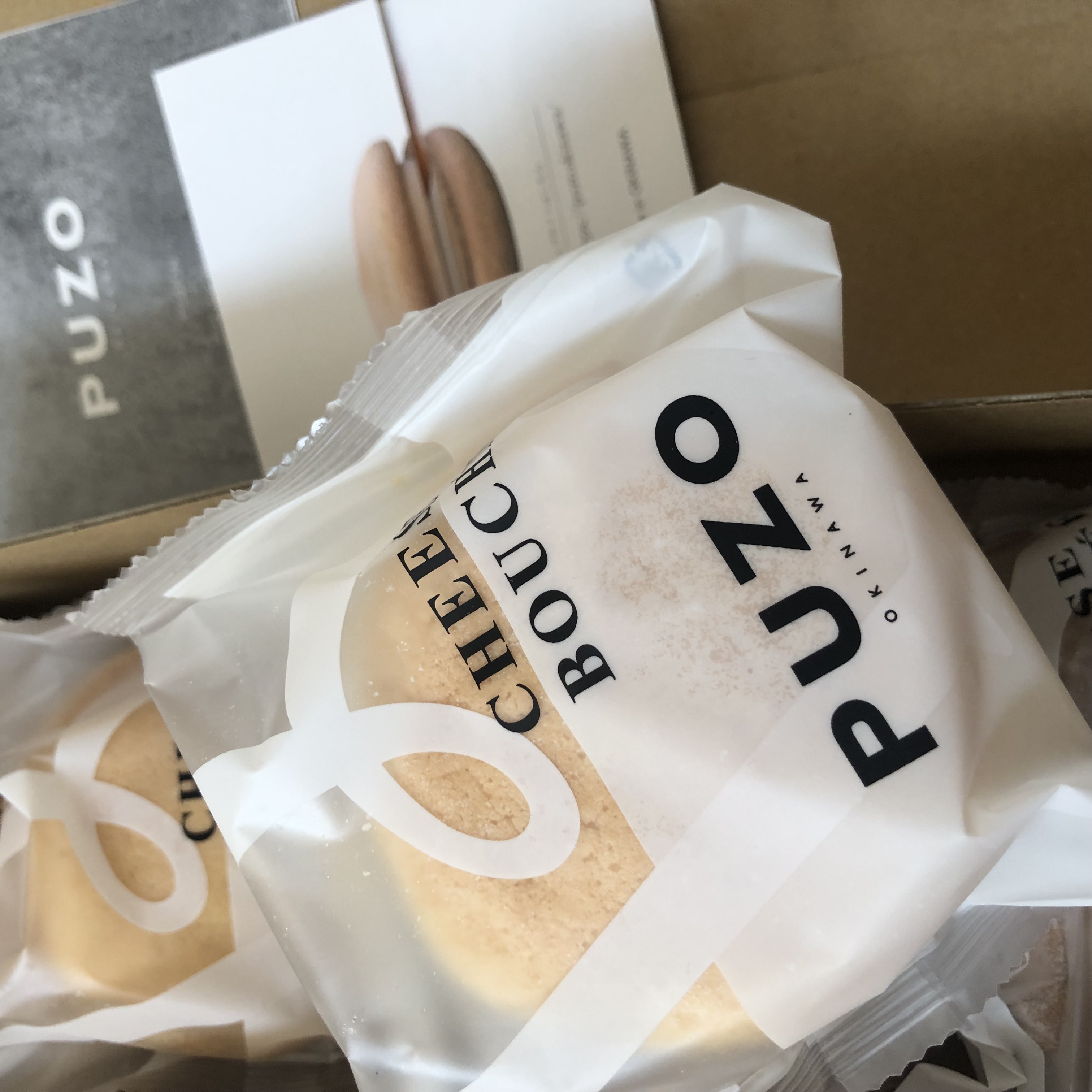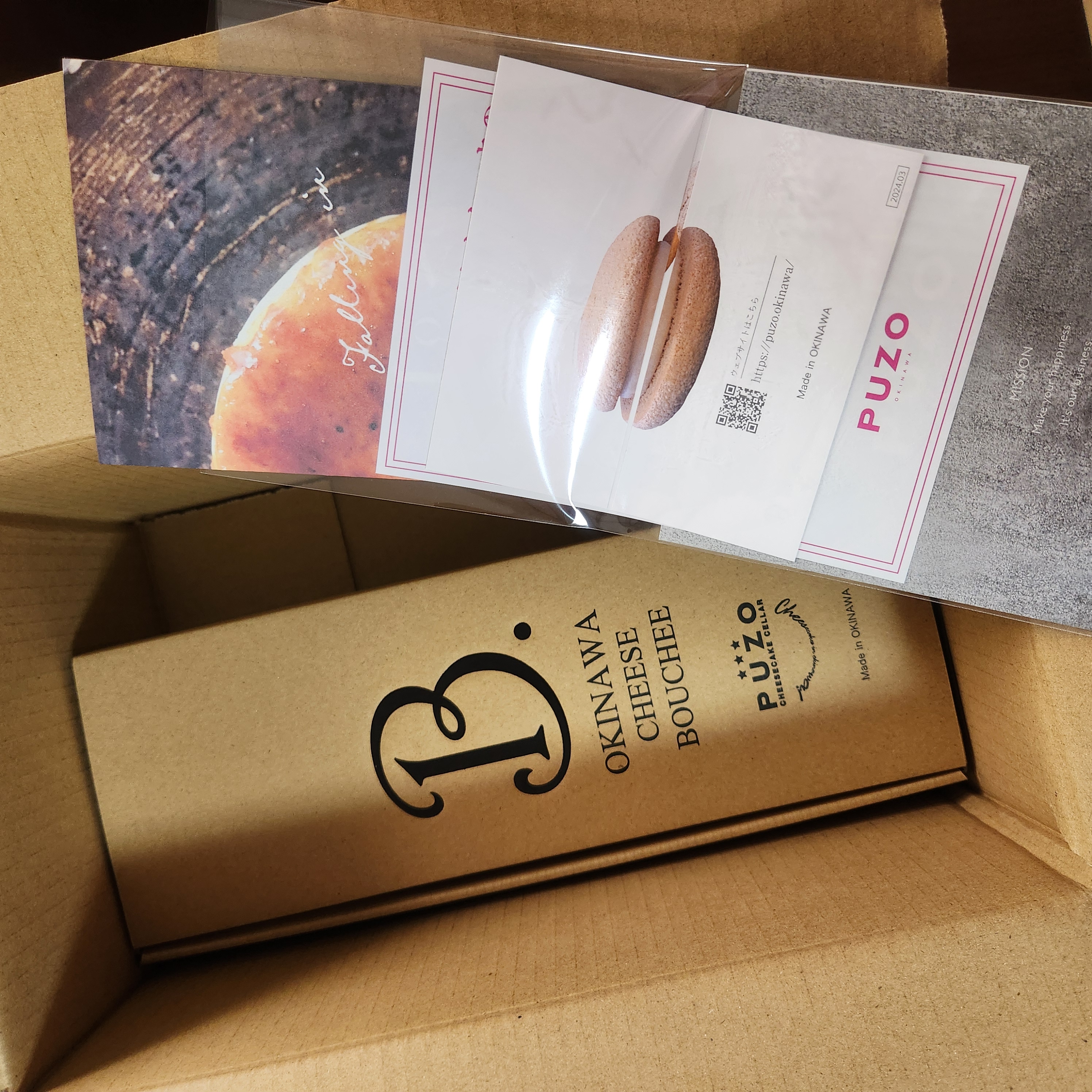 ダンボールを開封してみると、商品(プレーン3個とティラミス2個)と店舗の情報などが記載された物が入っていました。