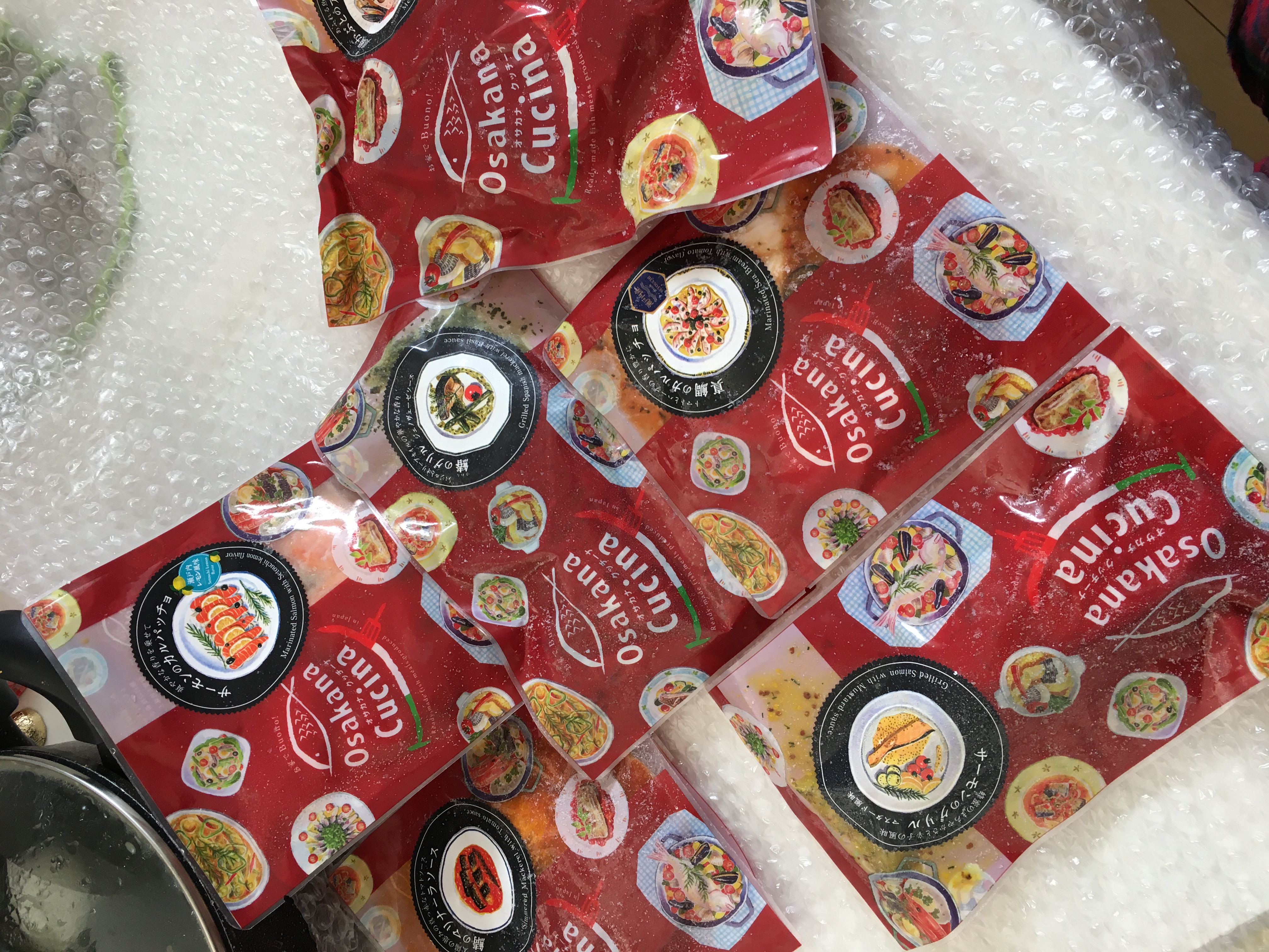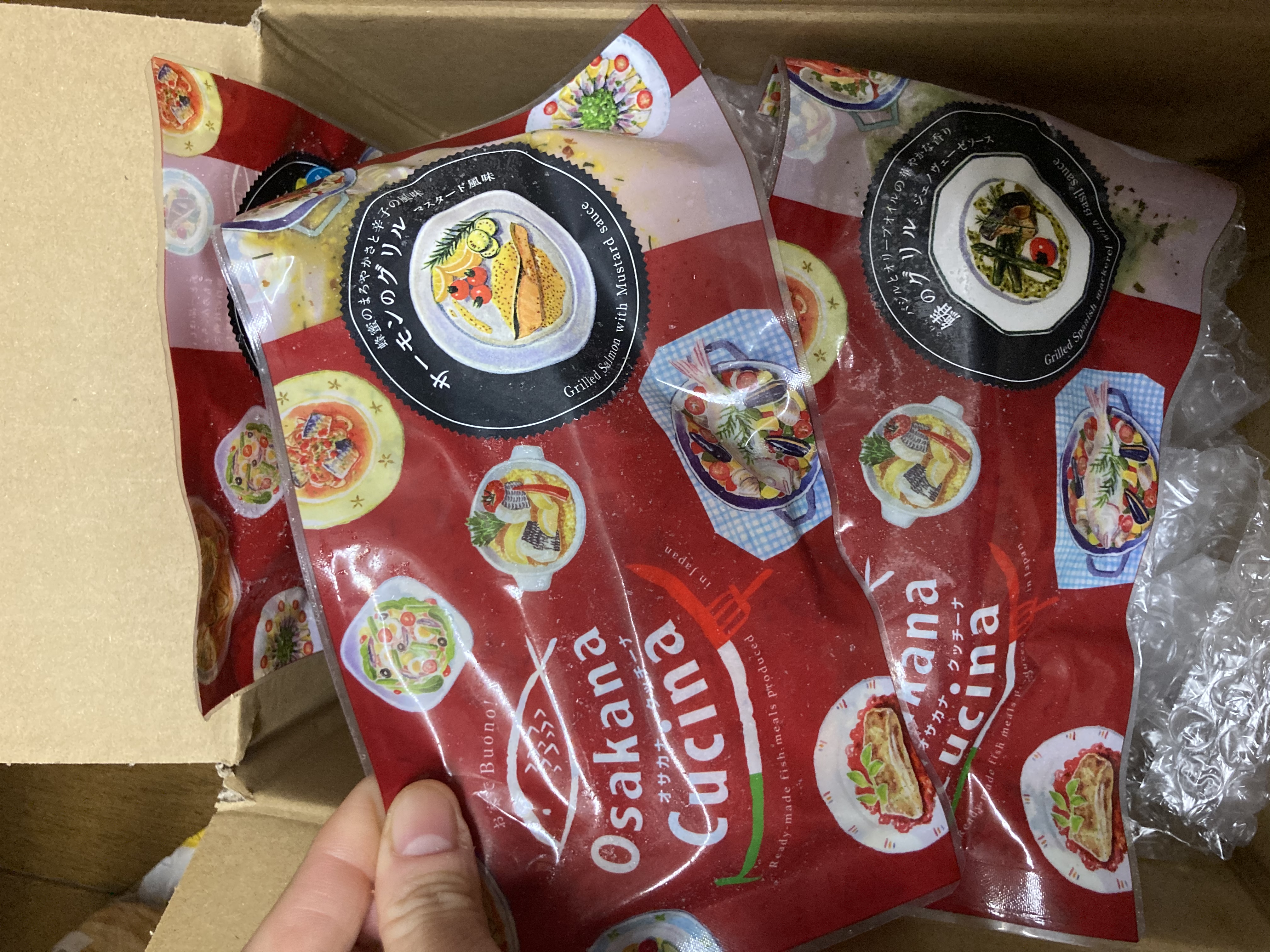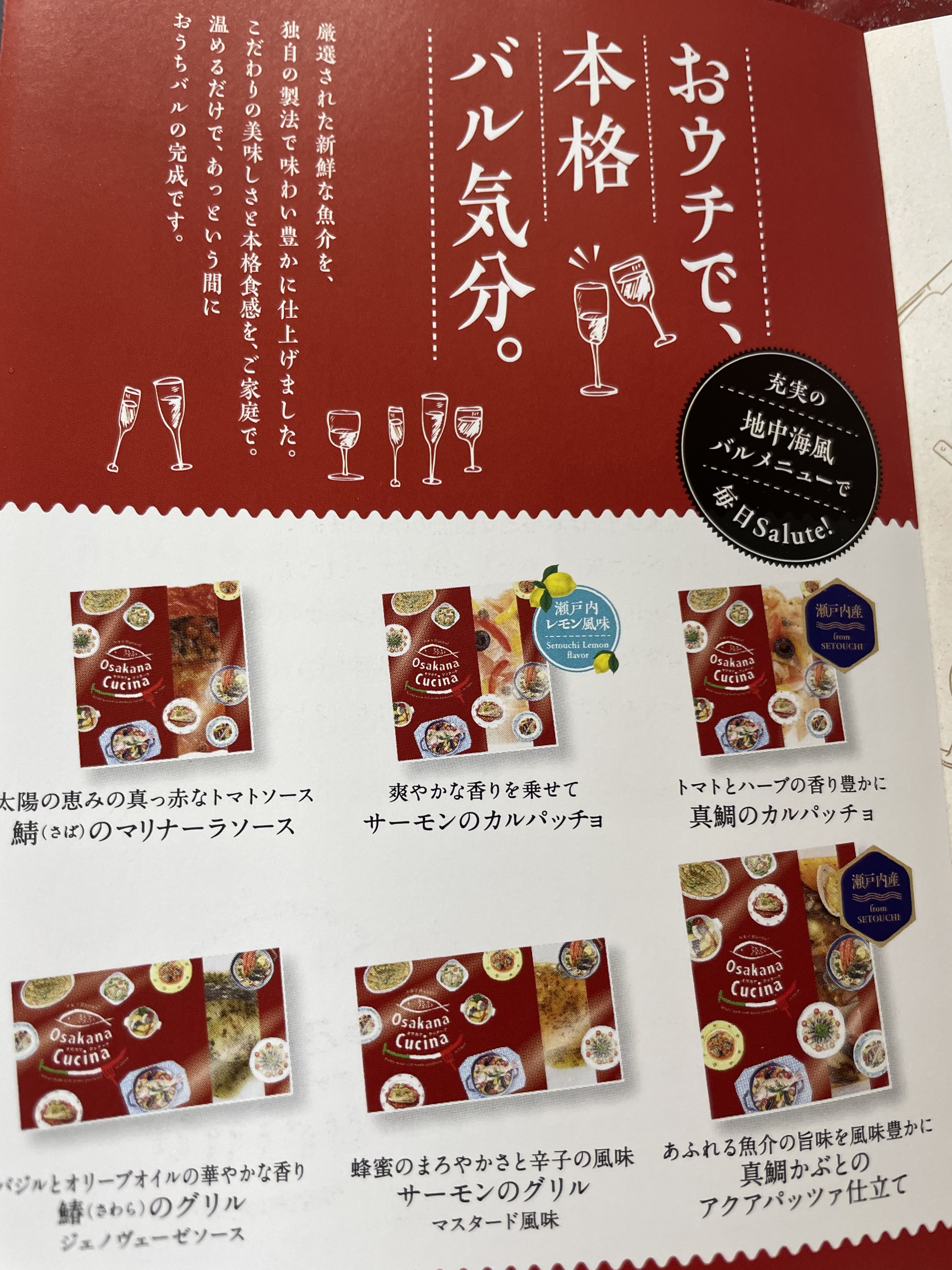 商品は「さばのマリナーラソース」「サーモンのカルパッチョ」「真鯛のマルパッチョ」「さわらのグリル」「サーモンのグリル」「真鯛かぶとのアクアパッツァ仕立て」の6種類です。