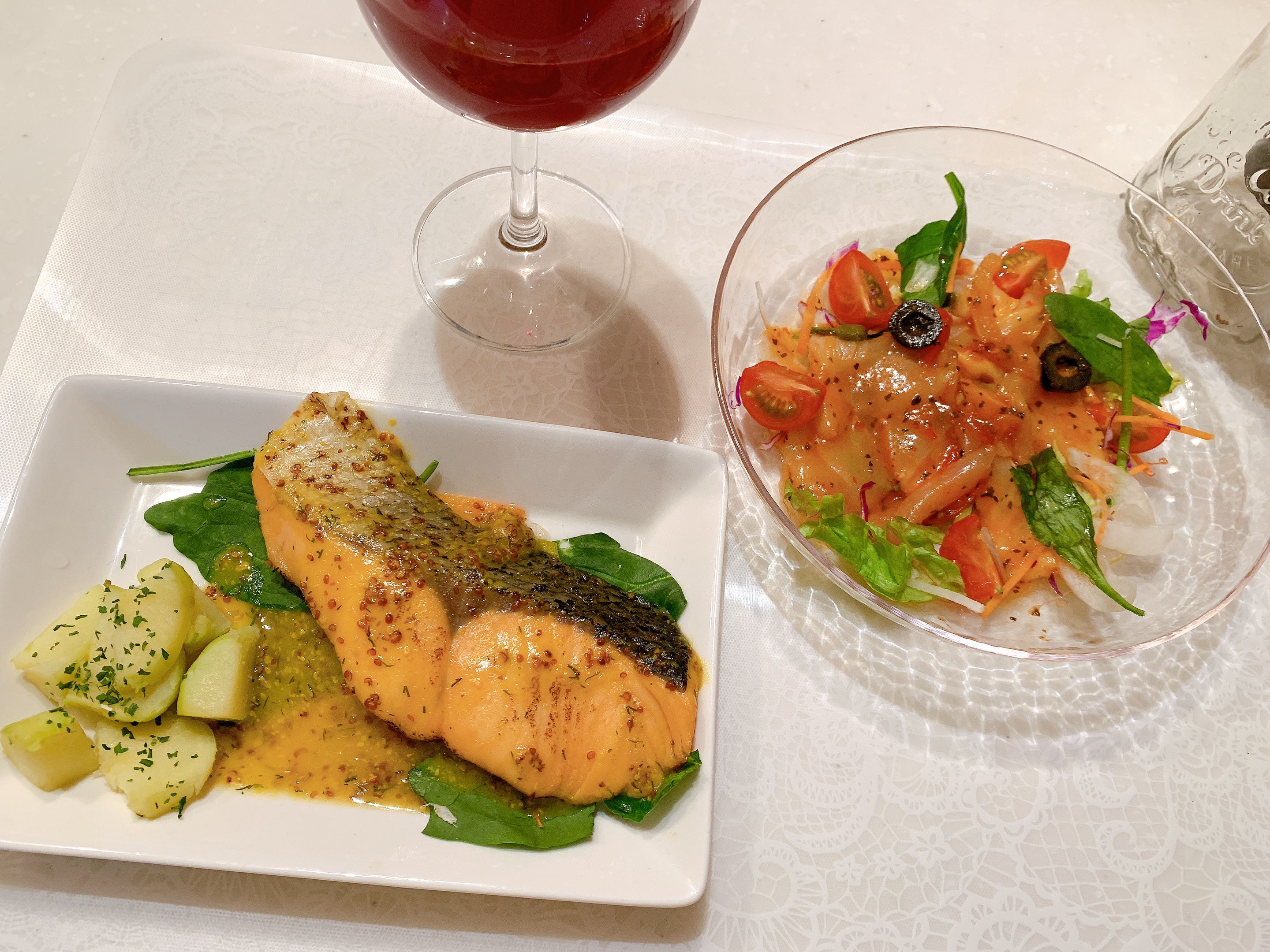 柔らかくて脂がのったアトランティックサーモンにマスタード風味のソースがかかっていて、口の中に入れた瞬間に「美味しい!!」と思わず言葉が出ました。