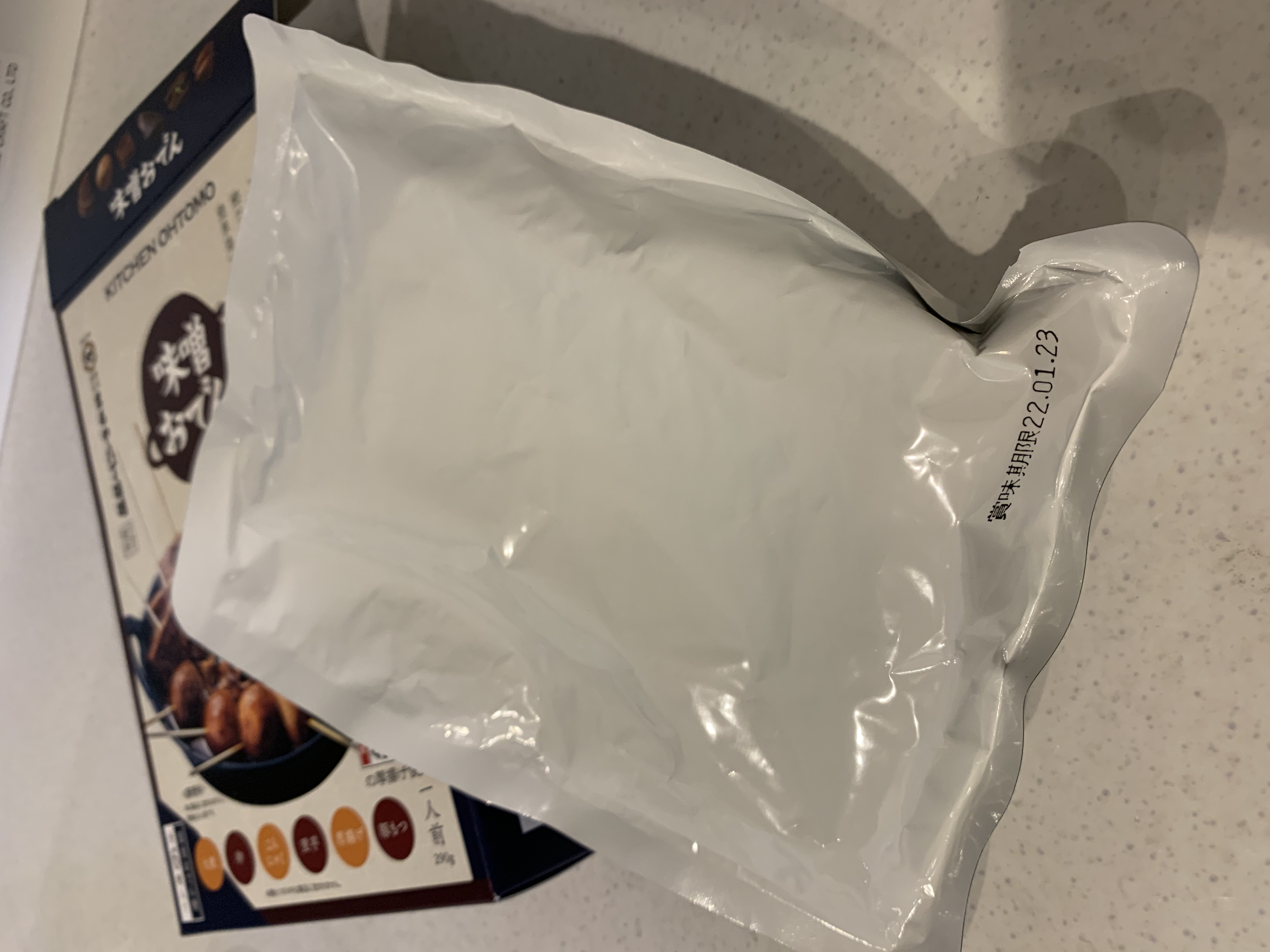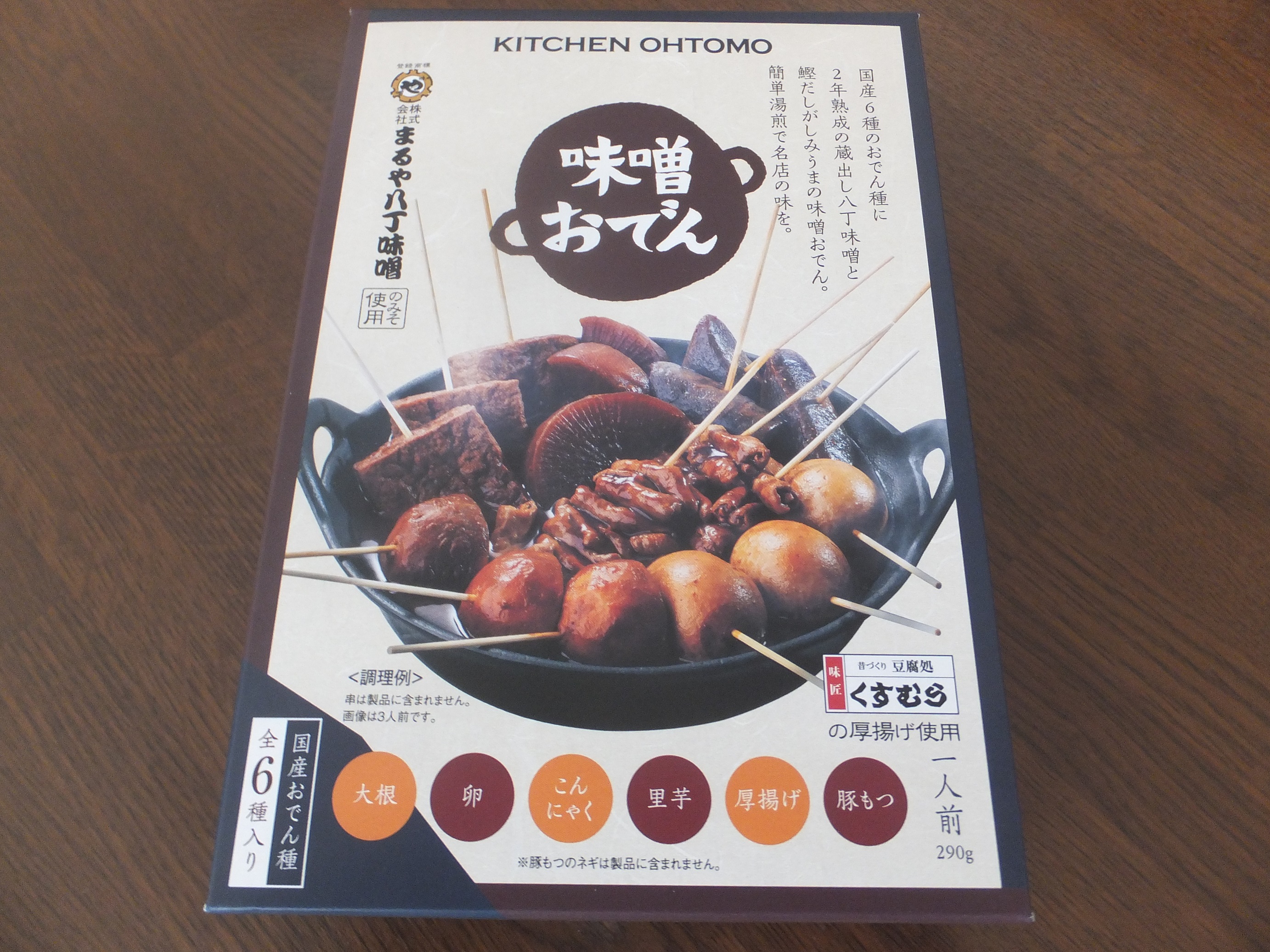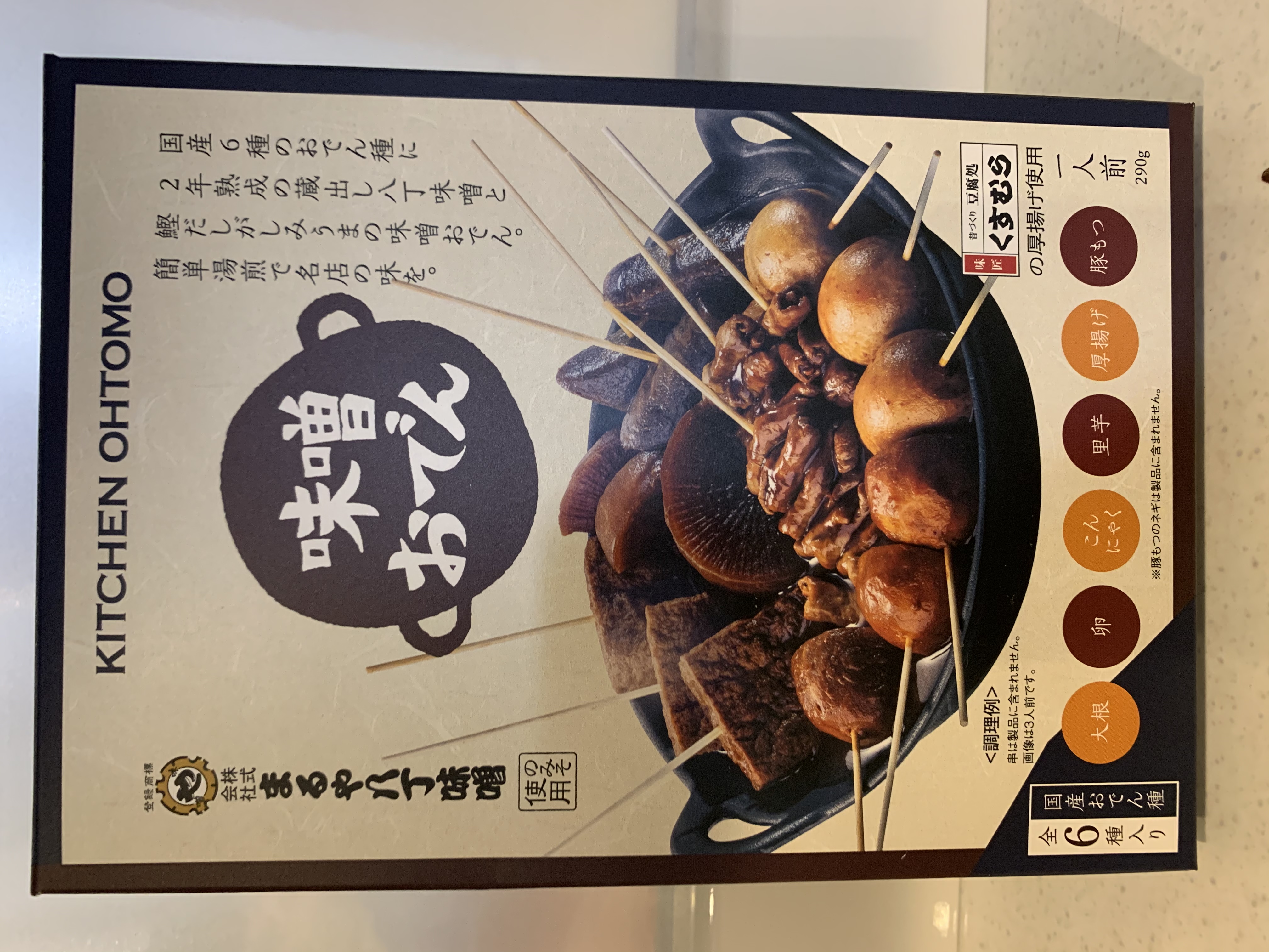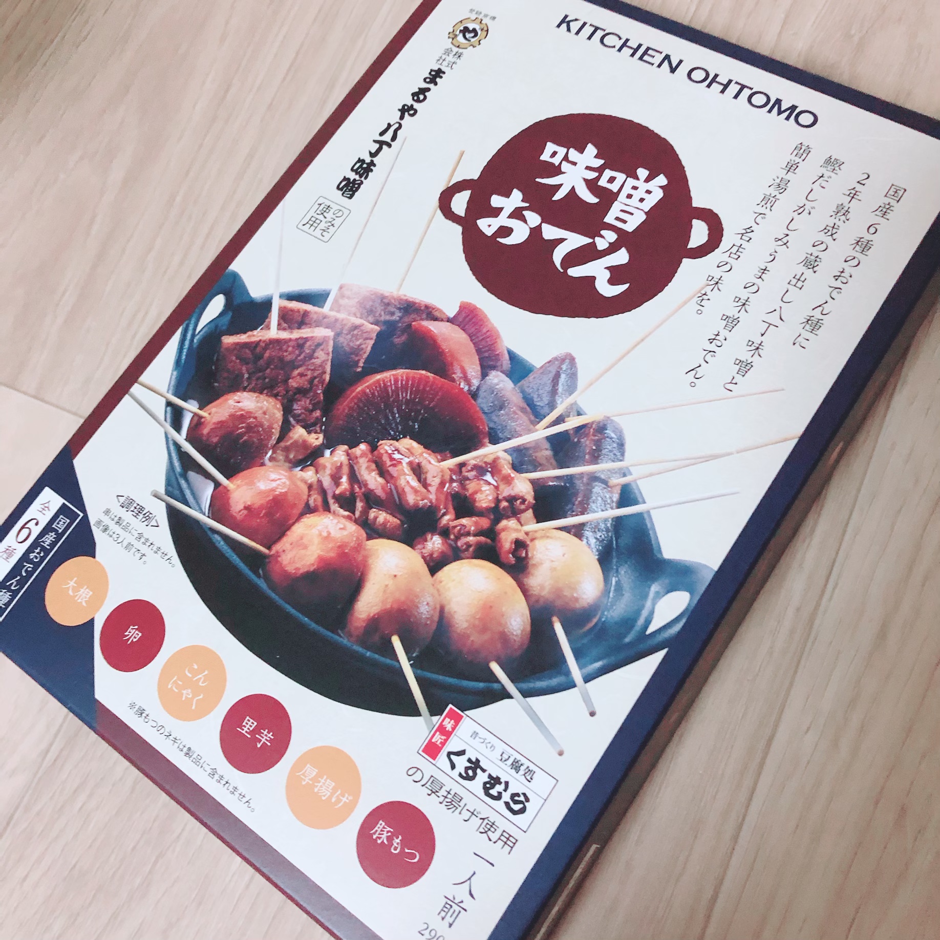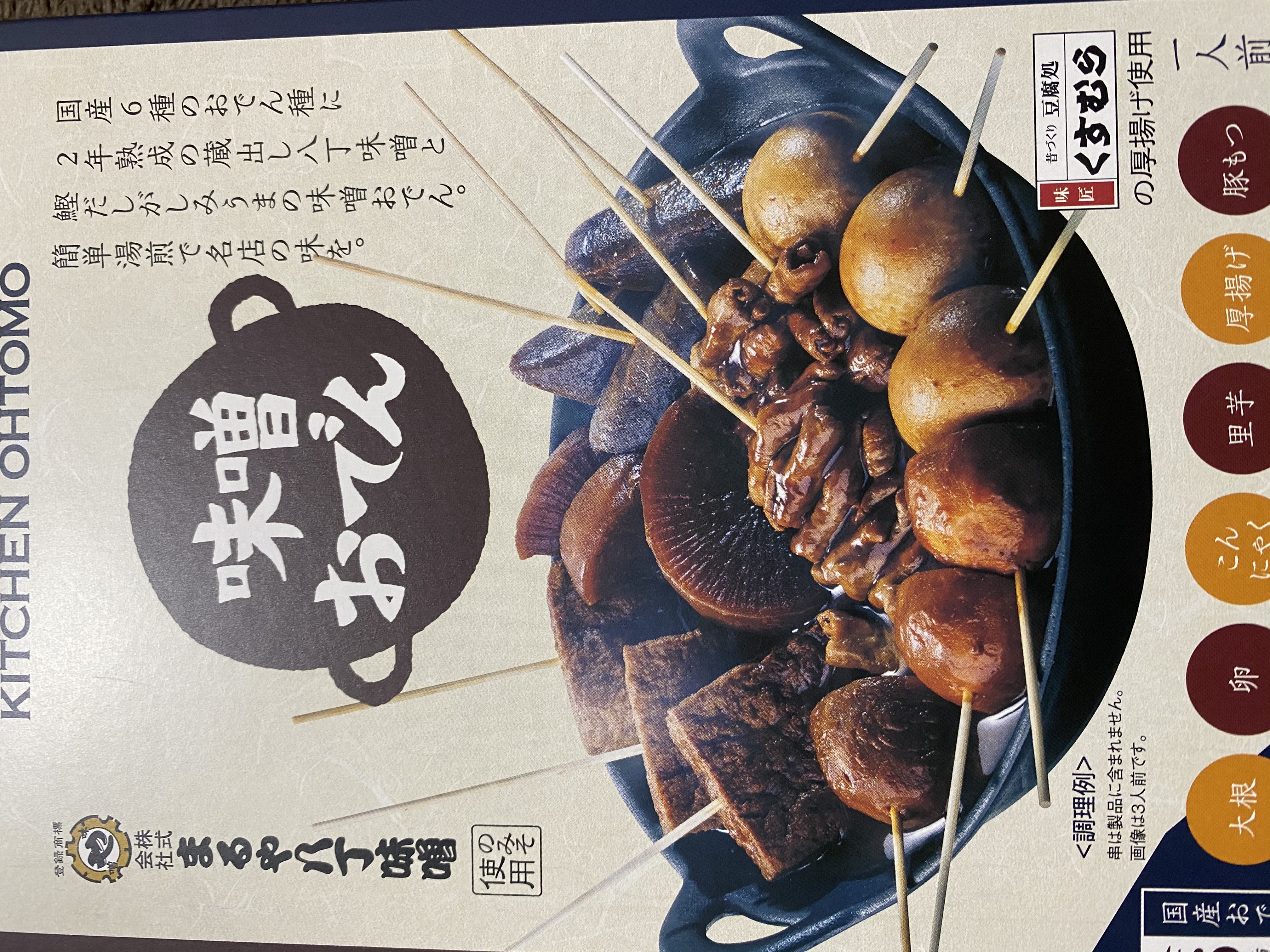 段ボール箱の中に、おでんの写真がプリントされた箱が入っています。味噌おでんの美味しそうなメージが伝わってくるパッケージに、期待が高まります。