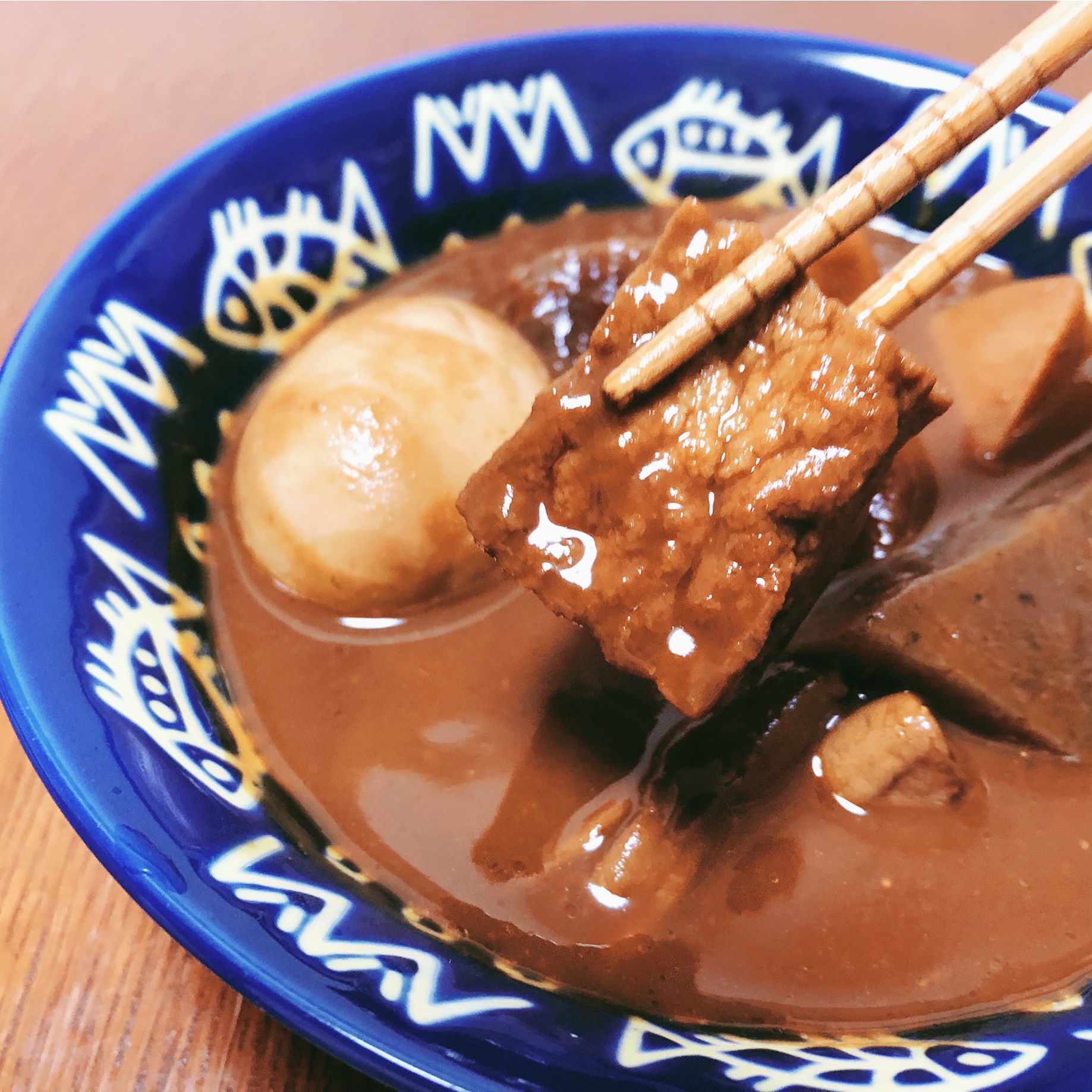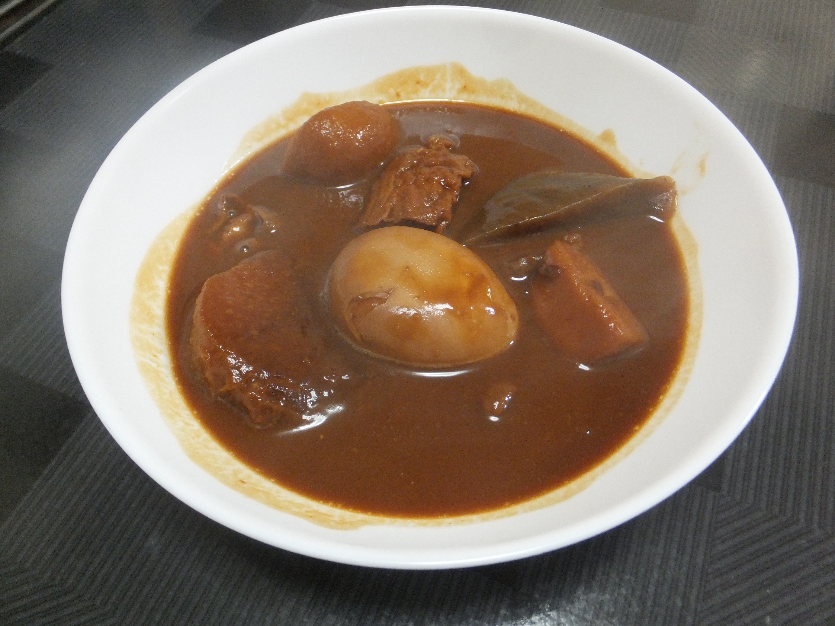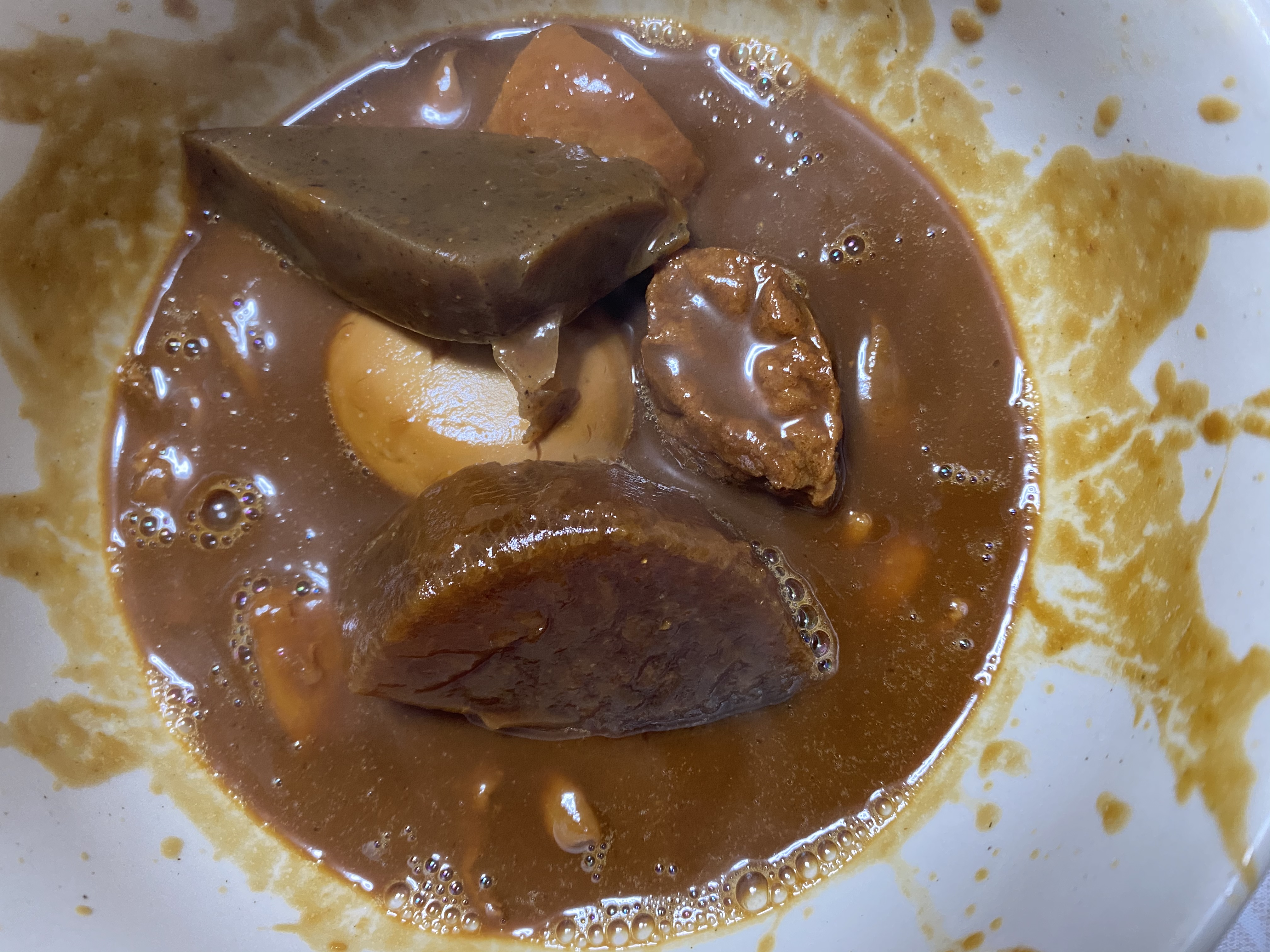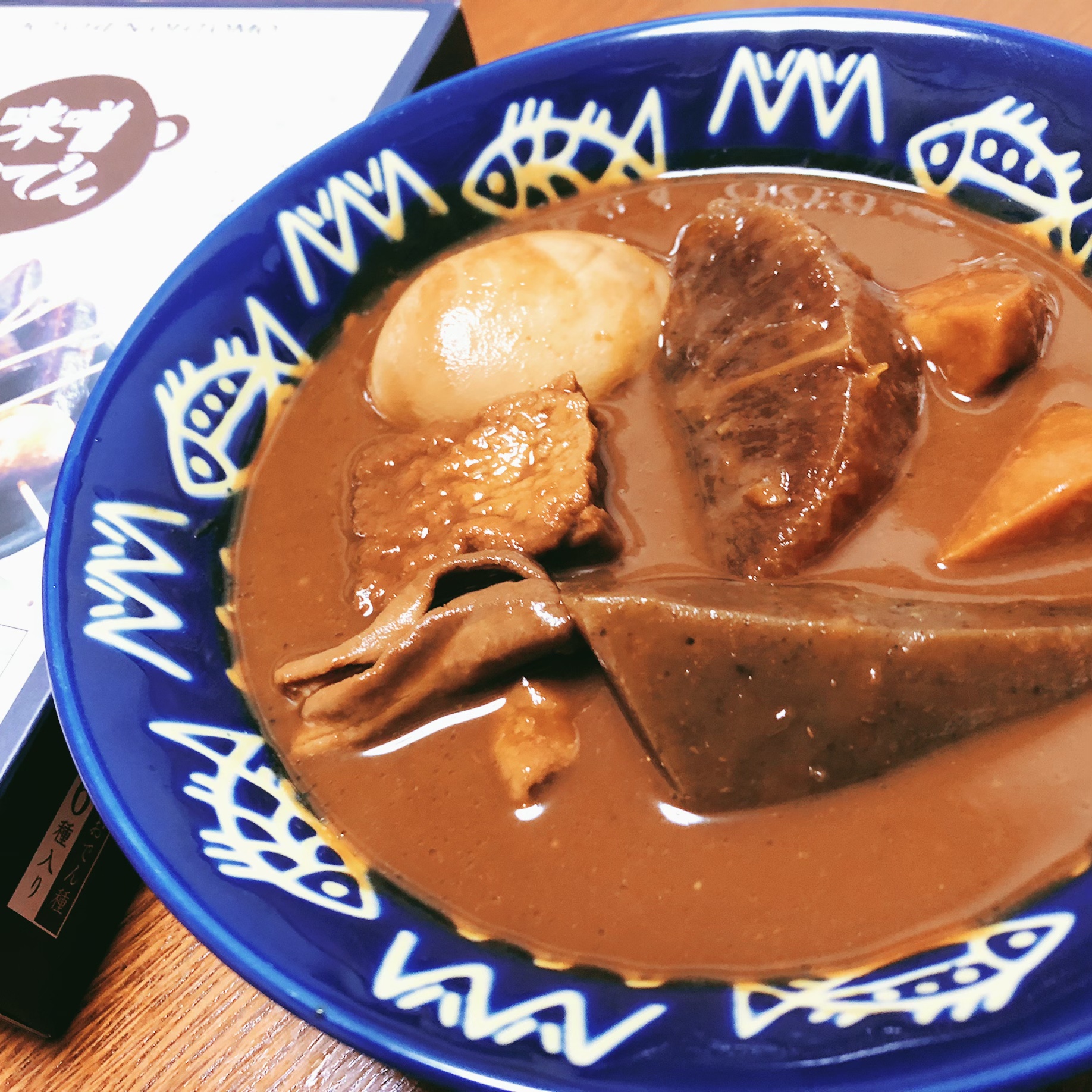 ようやく、具材を実食。卵を半分に割ると、黄身の中心まで味噌が染みています。プリプリの白身に、まろやかな黄身に味噌が染みて、とてもおいしかったです。どの具材も味噌が染み込んでいて美味しかったのと、大根、豚もつは、口に入れるととろける食感でした。里芋は煮崩れせずシャキッとした食感が美味しかったです。