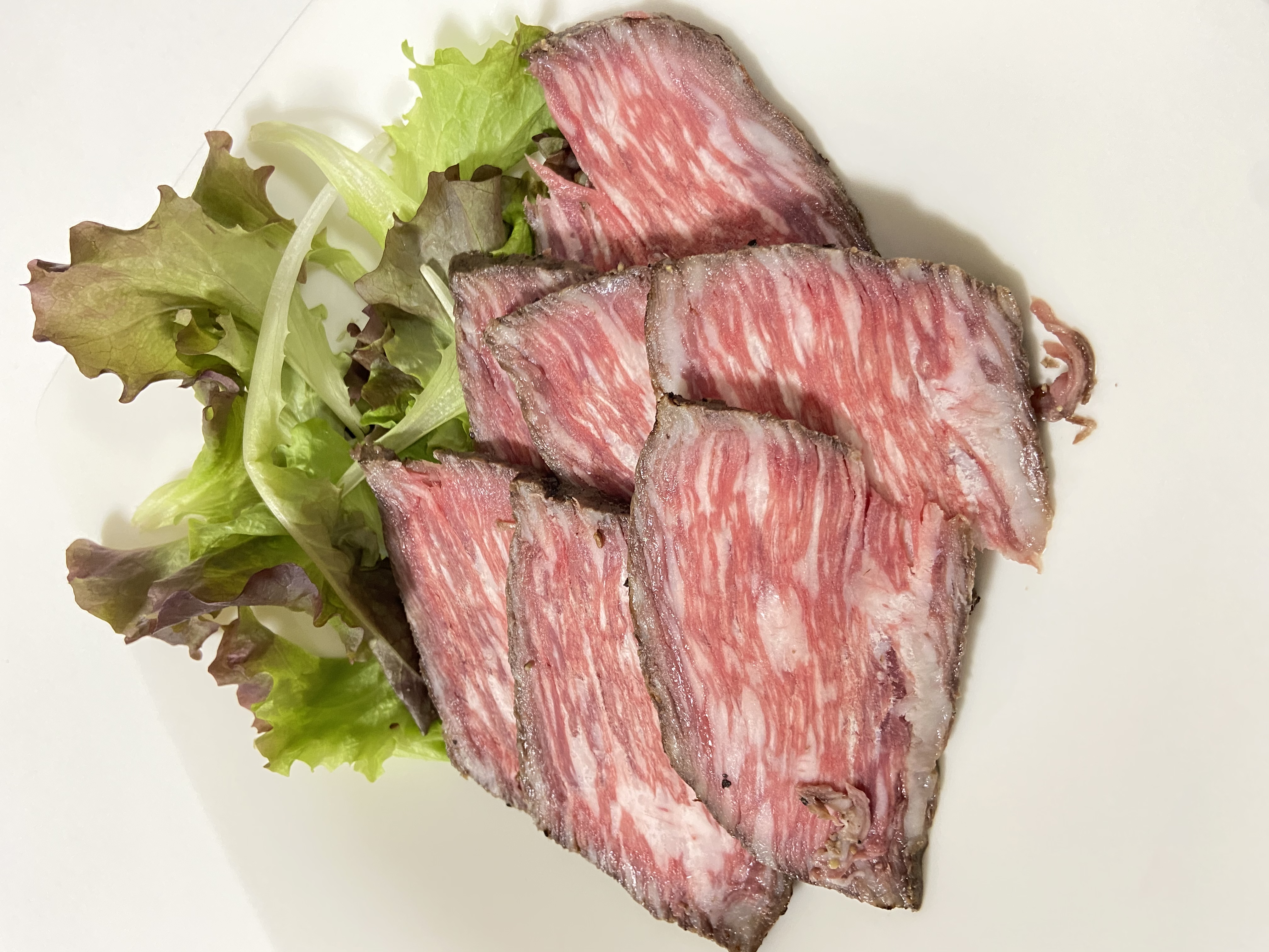 国内最上級の和牛「松阪牛」の赤身を、時間をかけ低温でじっくり焼きげた「ローストビーフ」。味を左右する、焼き加減は低温でじっくり。肉の中心から広がる淡いピンクの肉色は、低温で焼き上げた証です。余計なものは一切入れず、無添加で仕上げたので、雑味のない肉本来の味を堪能できます。少量の塩やわさびで楽しむのがおすすめです。メディアにも紹介された、贅沢ローストビーフです。