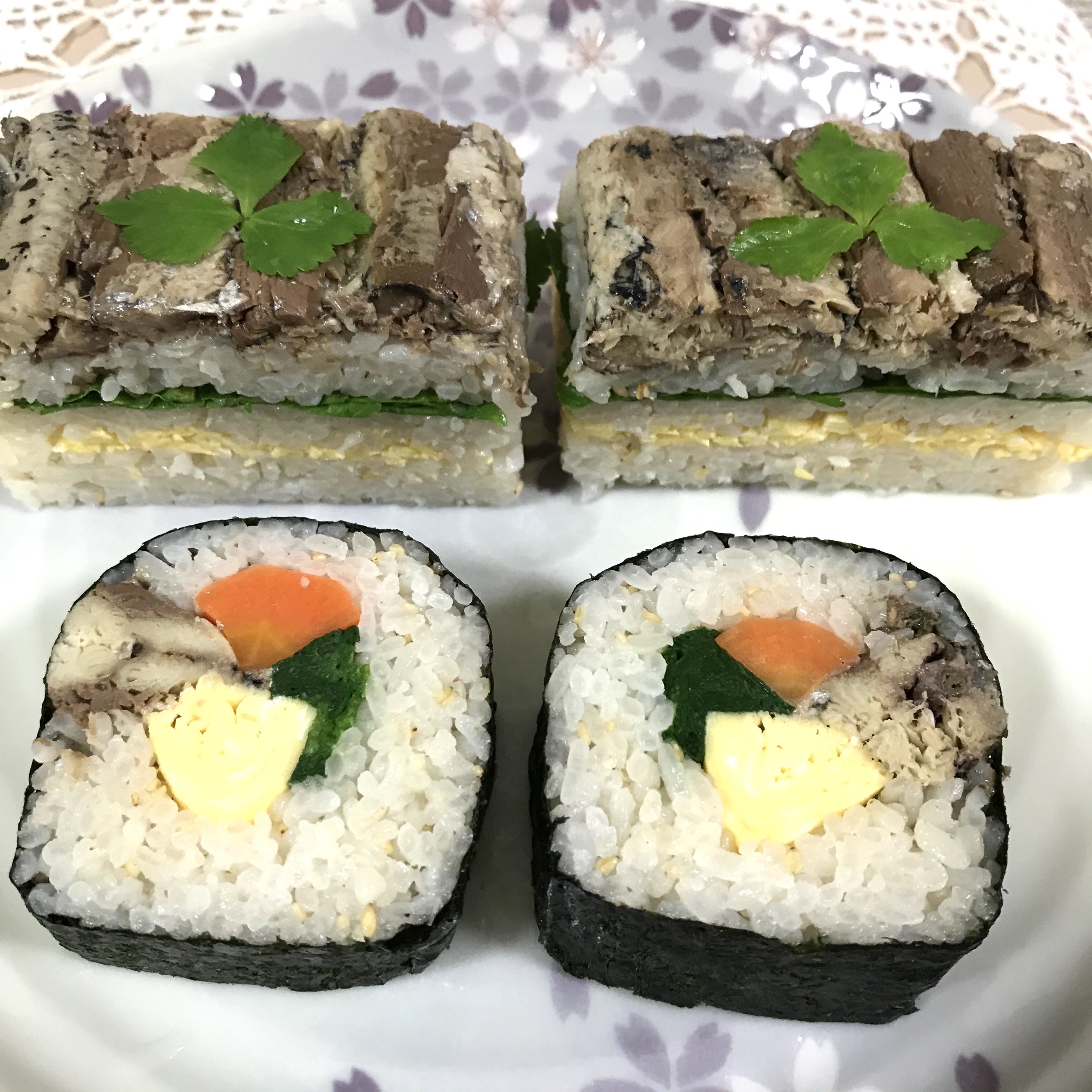 パスタ、炊き込みご飯、スープも作りましたが、写真はサンドイッチ、押し寿司&巻き寿司、いわし丼です。