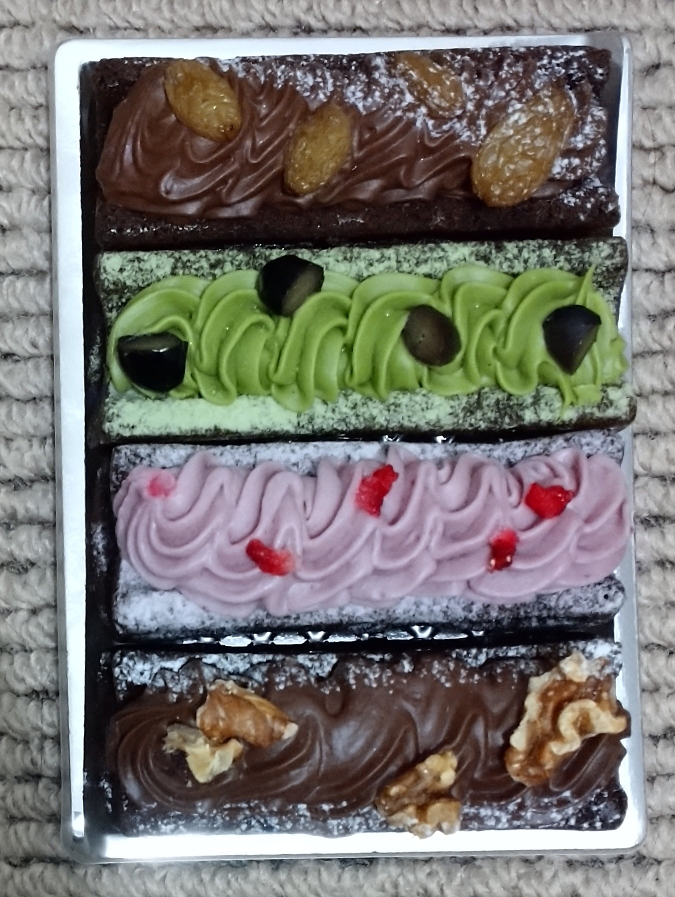 色とりどりのガナッシュがたっぷりとトッピングされた「濃厚ガトーショコラ」です。チョコレートの本場ベルギーの中でも厳選したビターなチョコレートを使用。「ナッツ」は、ビターな味わいの2種のダークチョコレートを使い、ナッツとの相性を更に高めました。ベースのガトーショコラだけでなくガナッシュにもイチゴのピューレを加え風味をプラスした「苺」。鮮やかな抹茶の色合いが美しい「抹茶」は、ミルクチョコレートが加わったガトーショコラに、ほろ苦い抹茶のガナッシュがベストマッチ。ラム酒をくわえて大人な味わいの「ラムレーズン」。トッピングは、1か月以上ラムに漬け込んだレーズンです。こだわりの詰まった華やかなフォルムのガトーショコラなので、贈答用にもおすすめです。