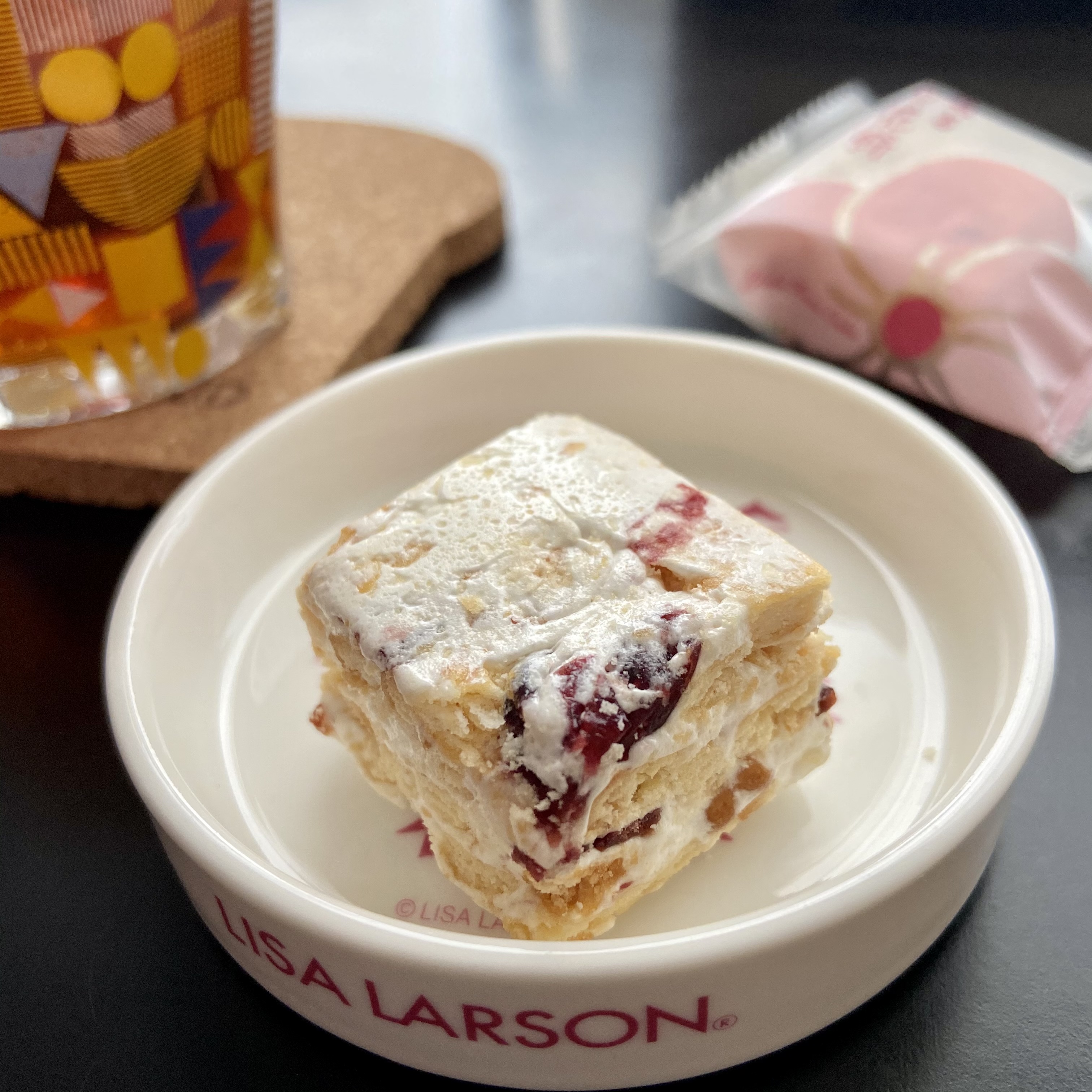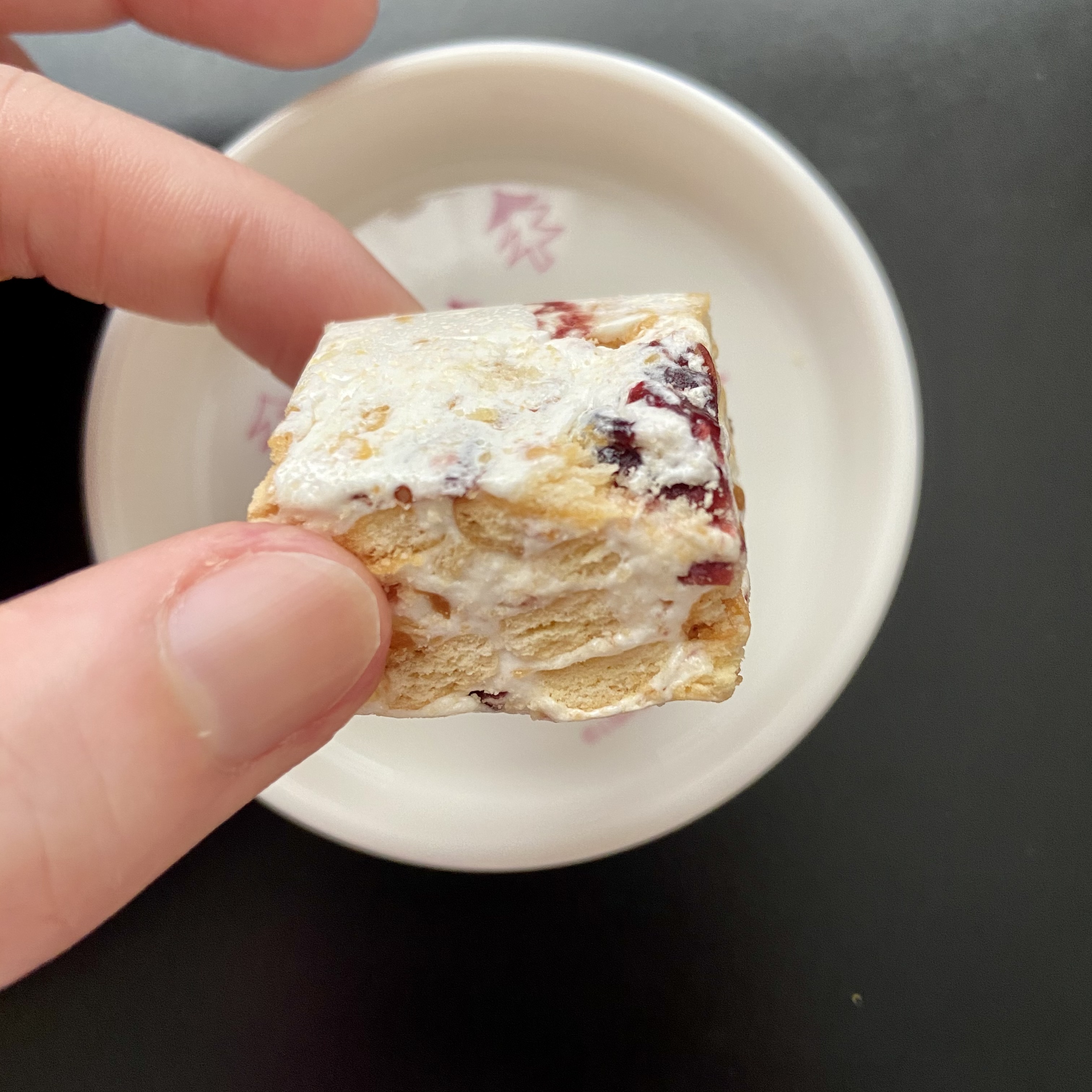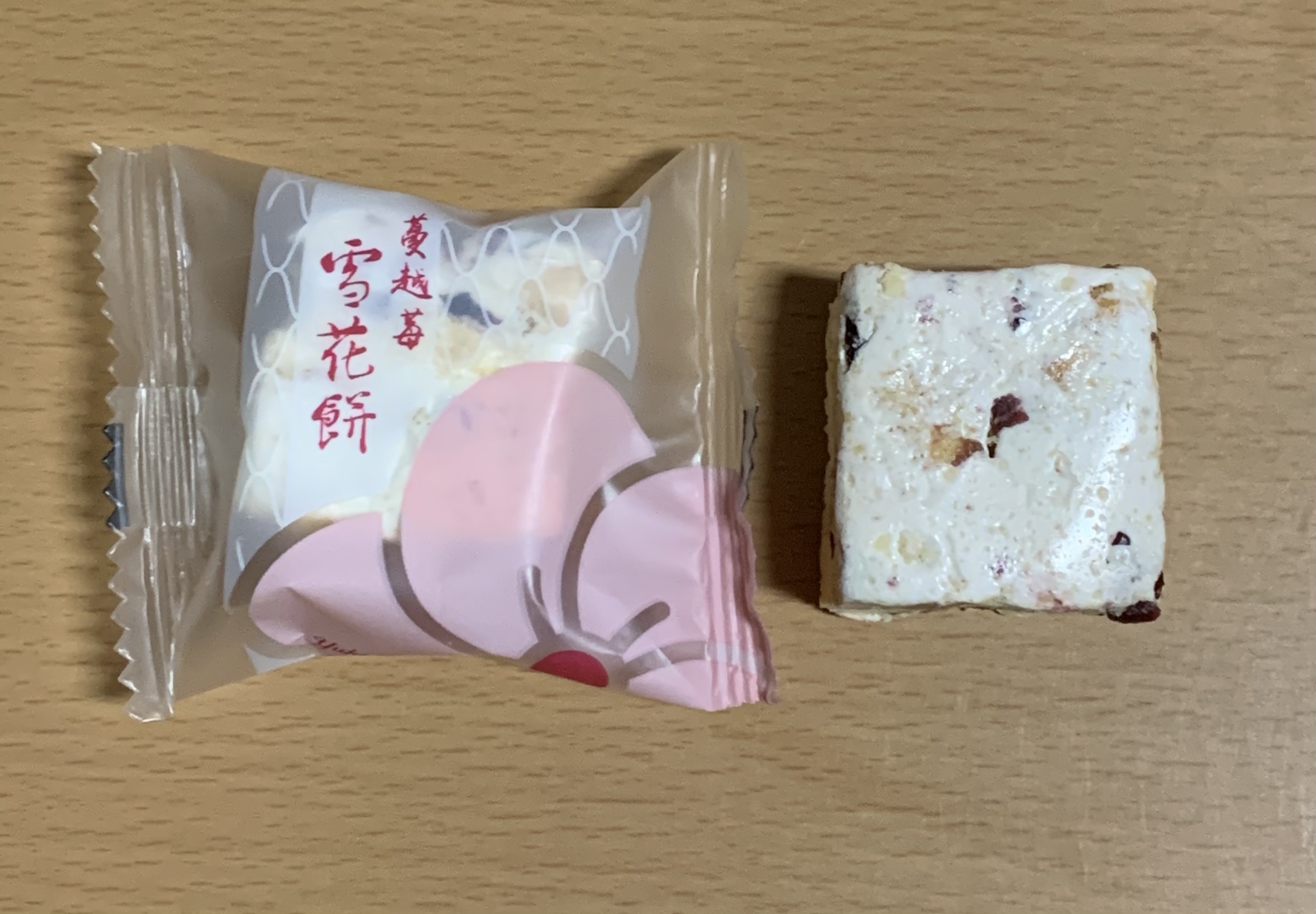 開けてみると、真っ白なヌガーが層になったクッキーで、クランベリーのピンクもあってとても可愛いです。